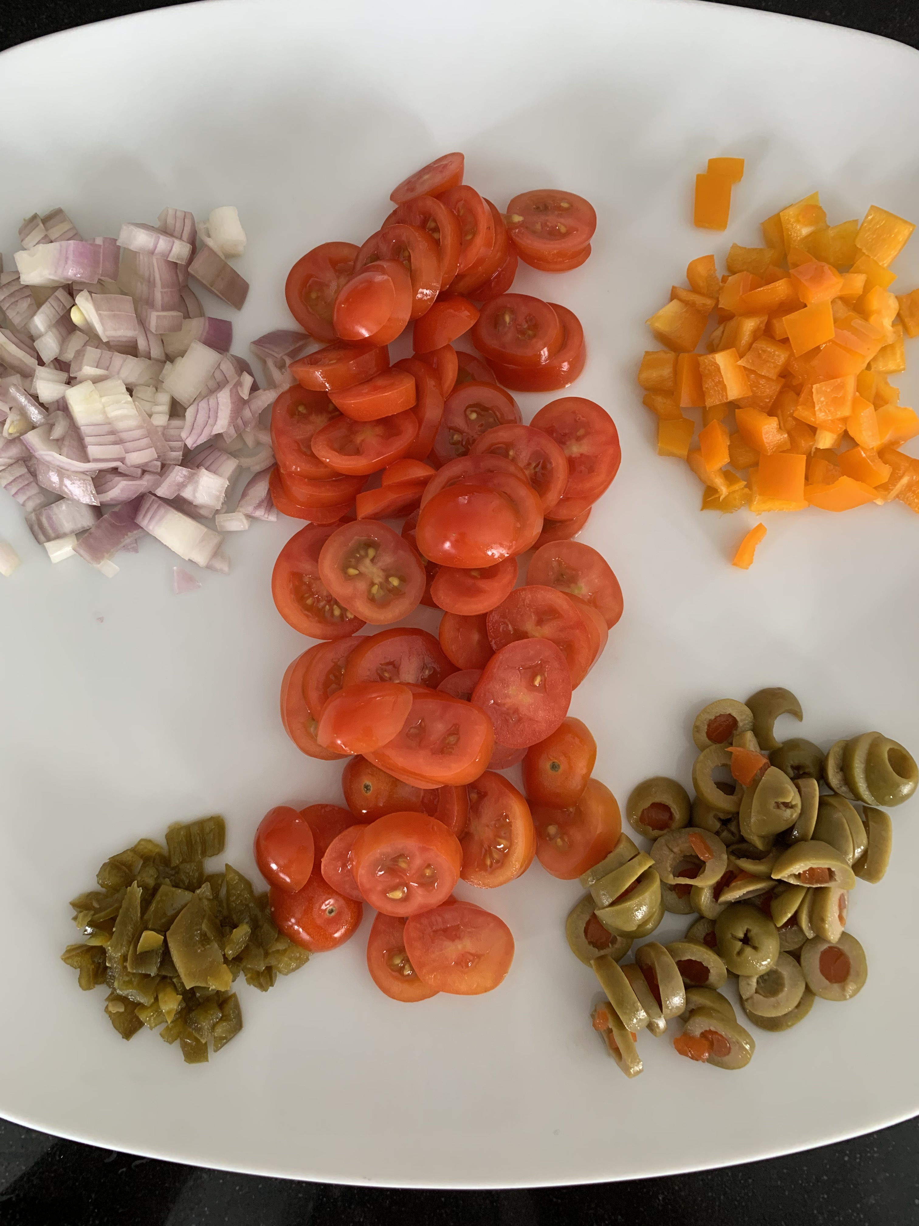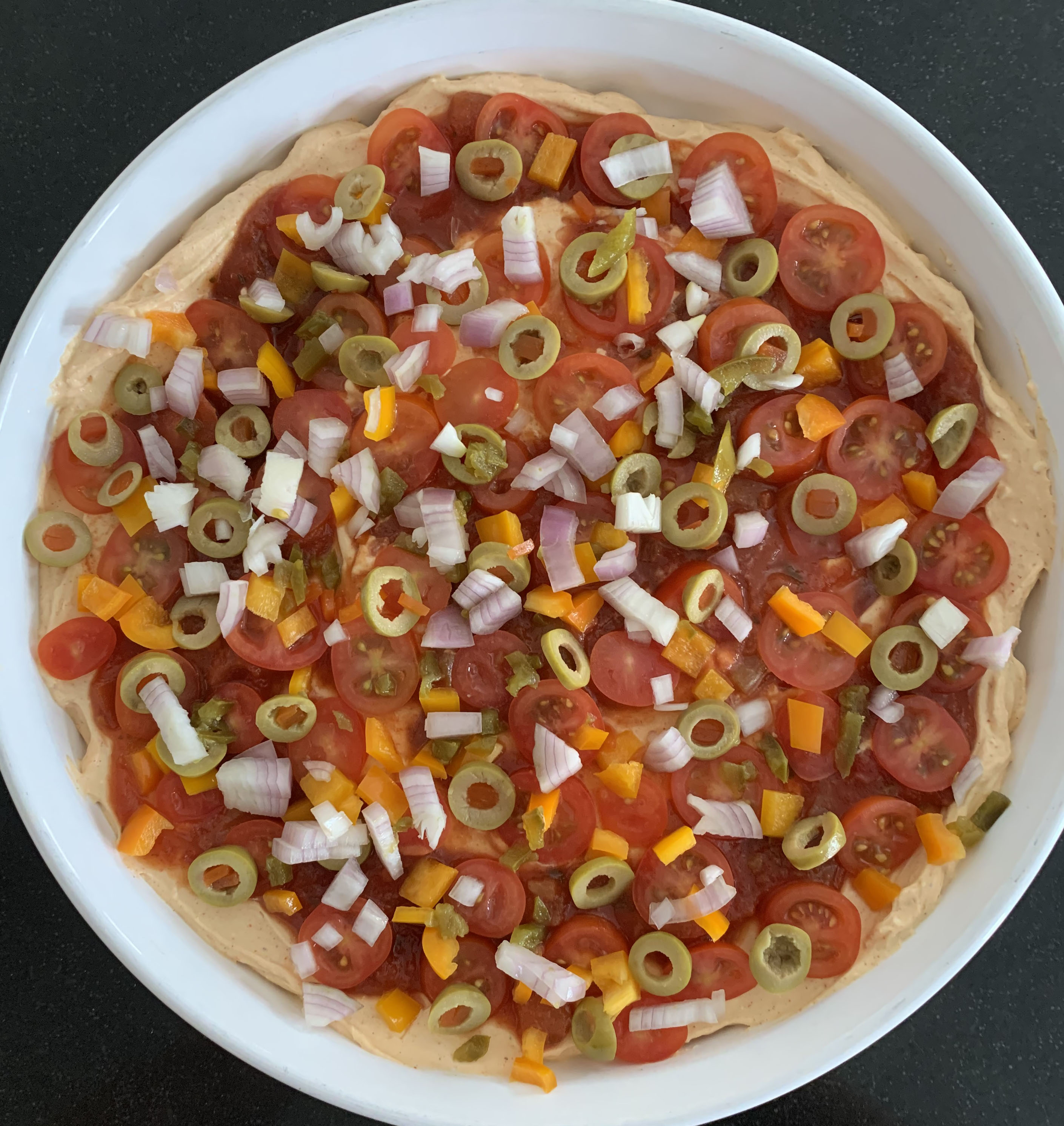 Prepare the toppings: slice olives and tomatoes; chop jalapenos, pepper and onion. Remove spread from refrigerator and drop salsa at intervals on top of the spread. Spread out until you have coated the cheese spread. Layer the chopped vegetables followed by the cheddar cheese. Top with sliced Kalamata olives and crumbled feta.