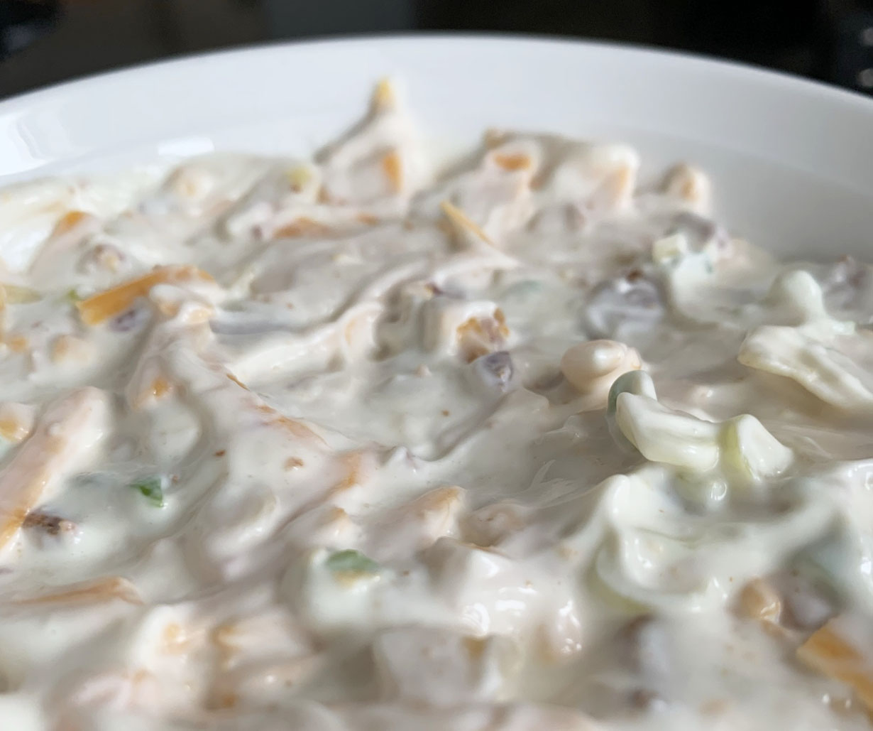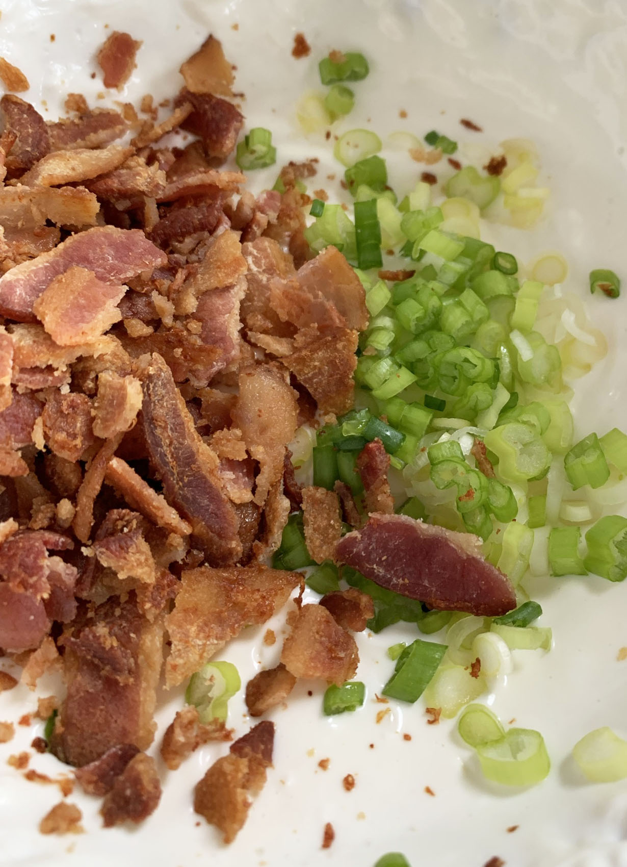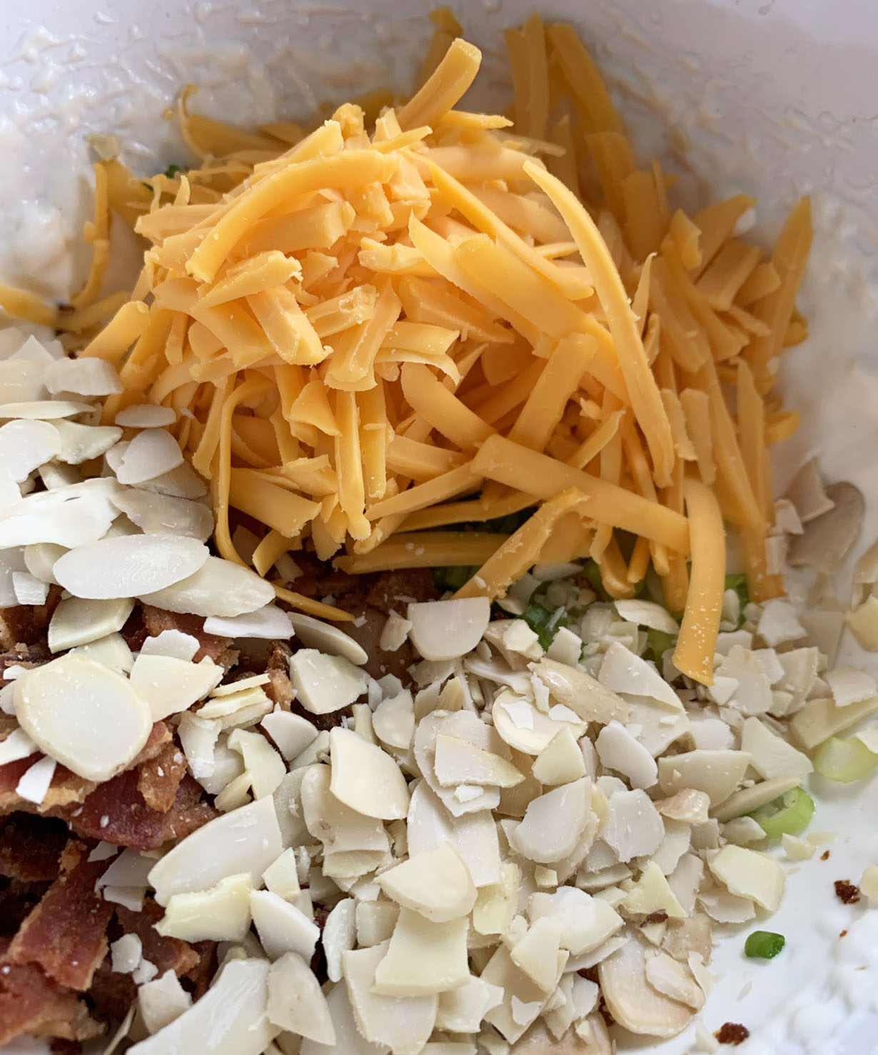 In the meantime, whip together the mayonnaise, Greek yogurt, and cream cheese until smooth. Slightly break in the almonds onto the mixture. Add in the green onions, cheddar cheese, and bacon and mix until combined. Refrigerate for at least 45 minutes before serving.