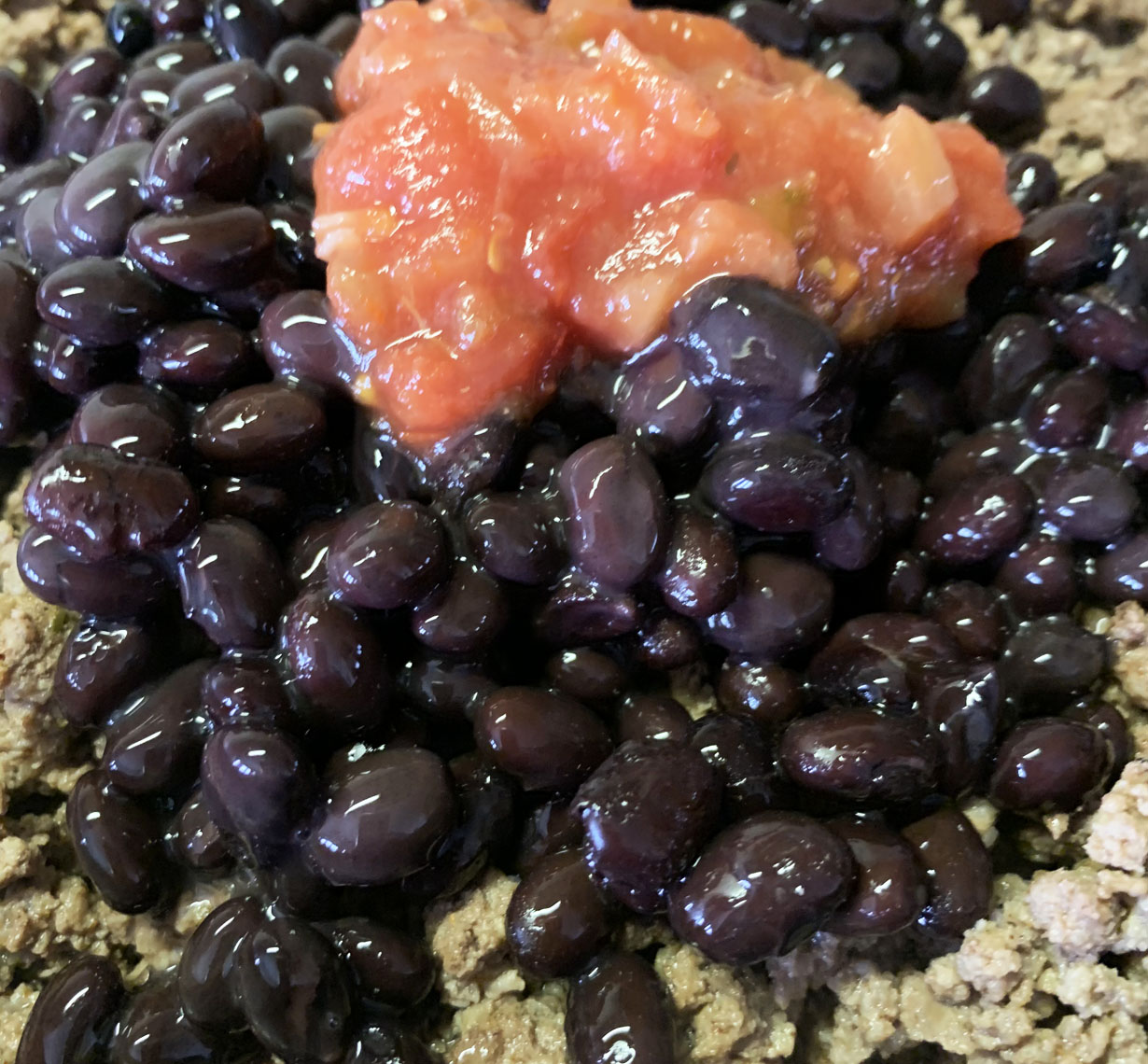 Heat the oil in a frying pan and add the ground beef, breaking it into small pieces as it browns. Sprinkle the taco seasoning on the beef and allow it to cook thoroughly. Add the salsa and simmer until all the liquid is absorbed. Add the black beans and cook for an additional minute.