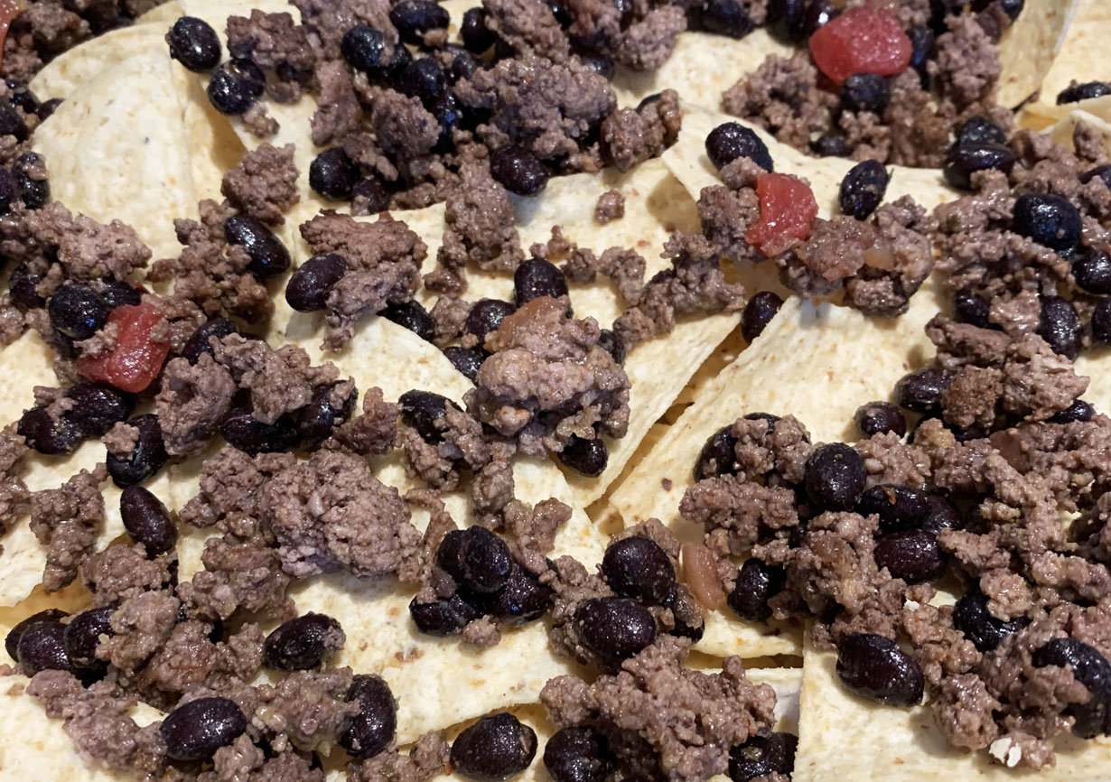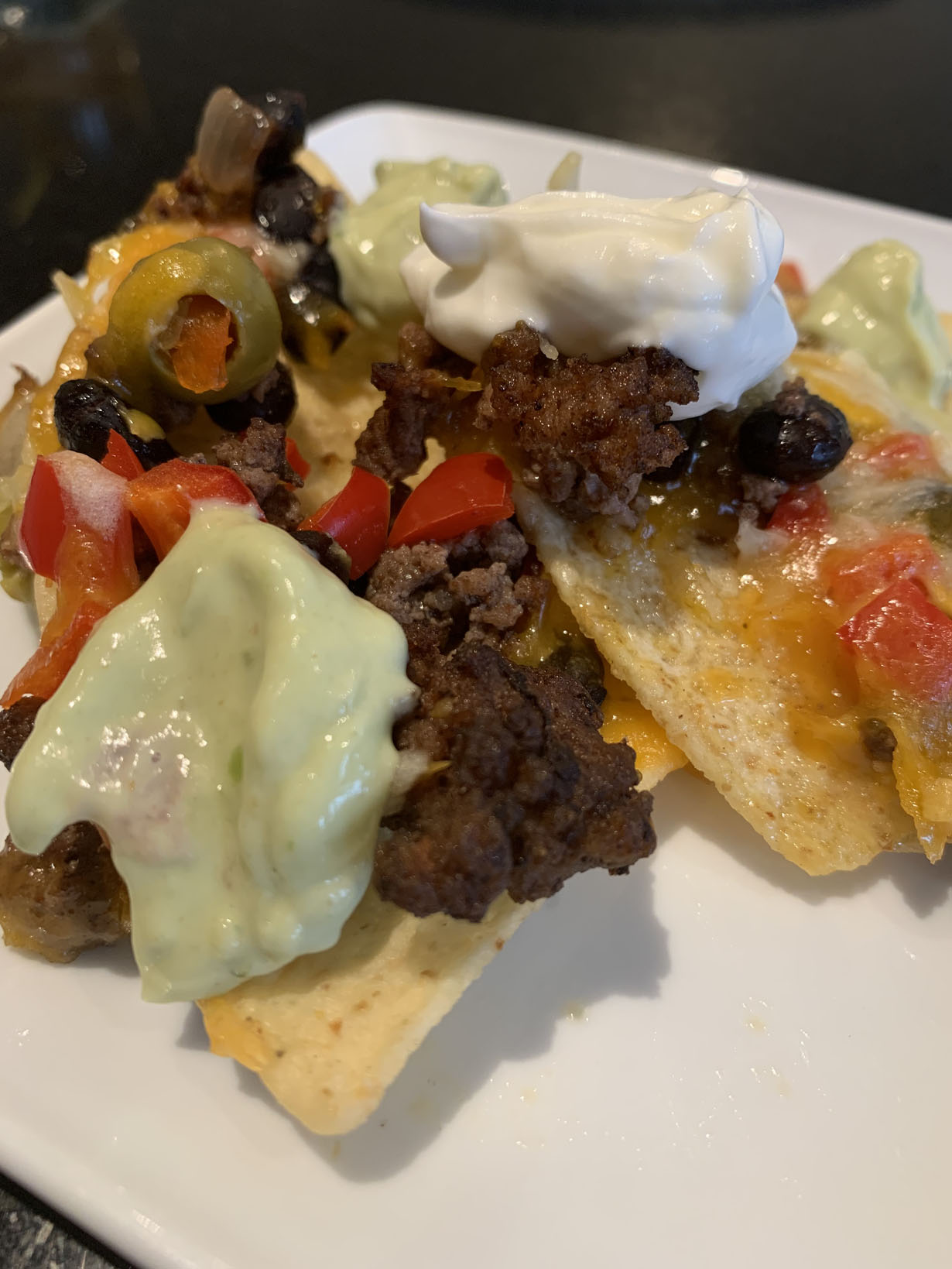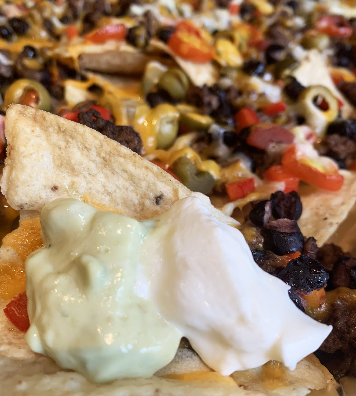 Line a baking sheet with silver foil and add a layer of nacho chips. Spread the meat and bean mixture evenly over the chips. Sprinkle the pepper, jalapeno, olives, and tomatoes over the meat mixture. Cover with cheeses. Broil until the cheeses melt and turn a bit brown. Serve with lime crema and sour cream or add guacamole for some added richness of flavor.