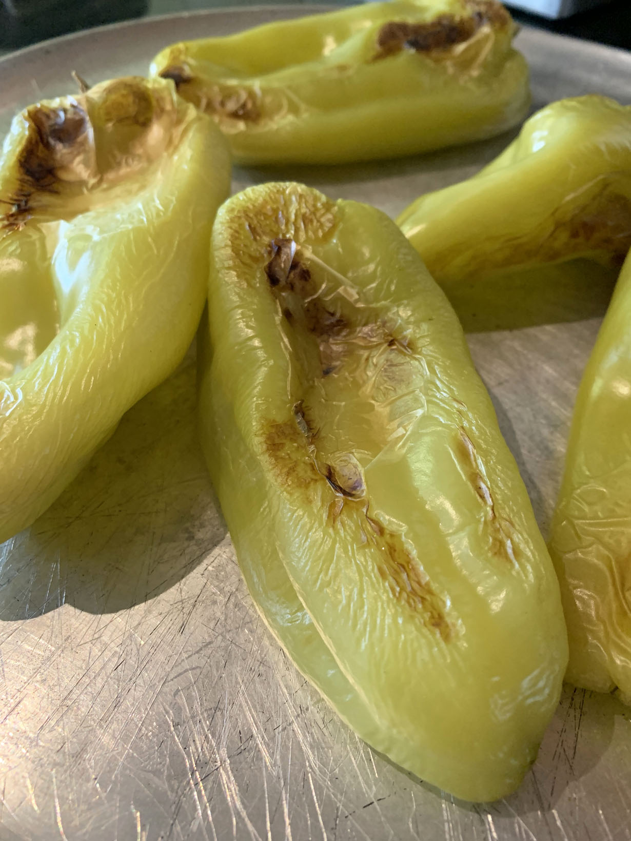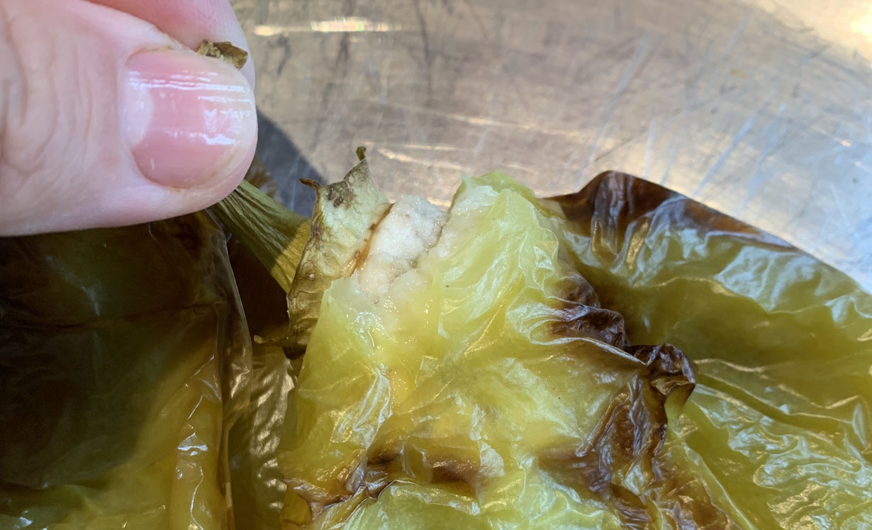 Preheat your oven to 350°F and the rack in the middle position. Place your peppers on a pan and cook for 1 hour and then turn over and cook for another hour. As soon as the peppers come out of the oven, cover them with silver foil. This will make it easier to remove the skin.