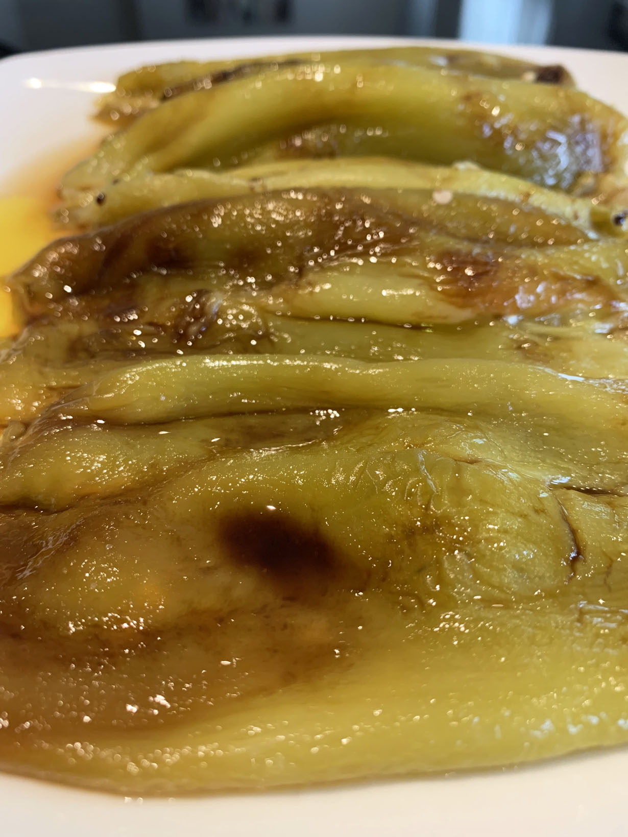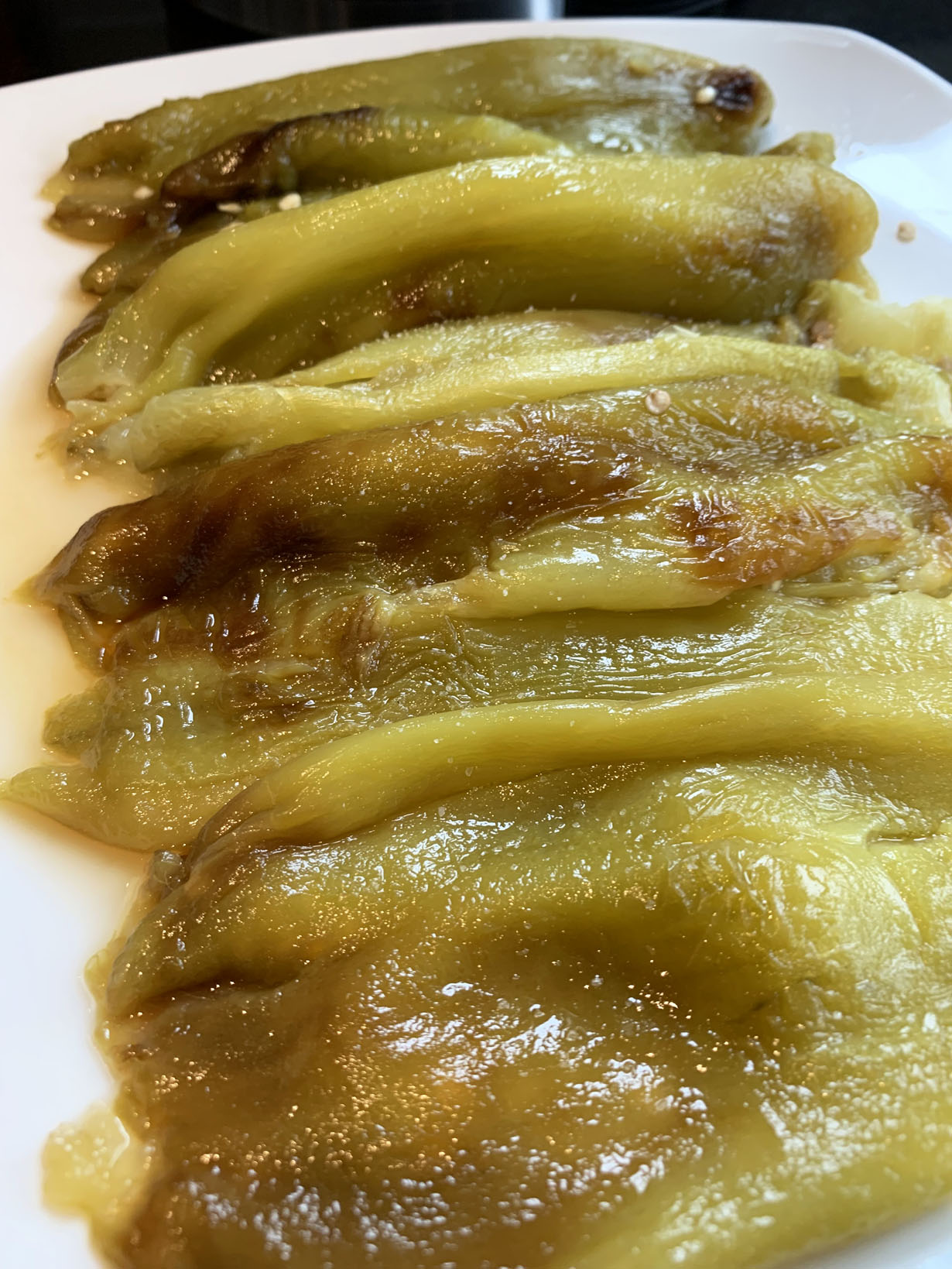 Start by pulling out the stem from the top. Lift a corner of the pepper’s skin and peel away until all the skin is gone. Remove any seeds and place the clean pepper onto a serving dish. Once all peppers are done, sprinkle with salt. Drizzle the balsamic vinegar and the oil over the peppers. Allow to rest for 1/2 hour before serving (the juices from the peppers and the oil and vinegar will blend nicely).