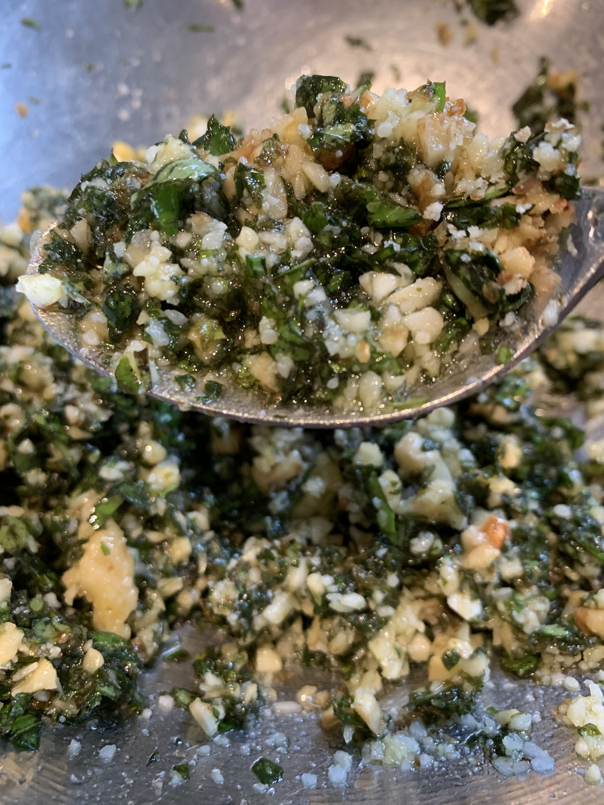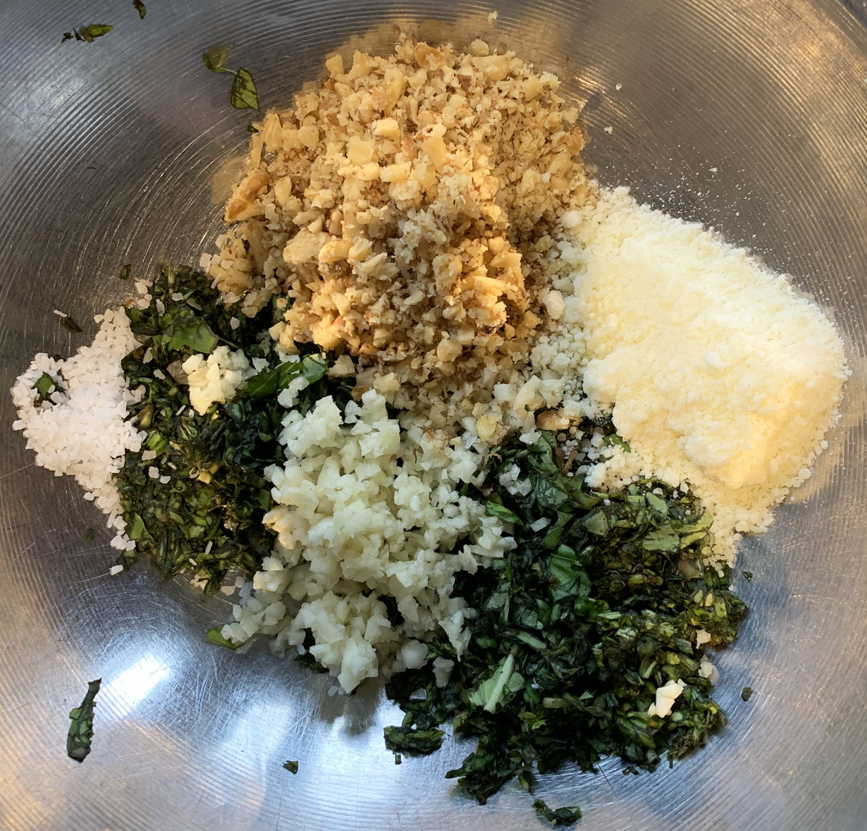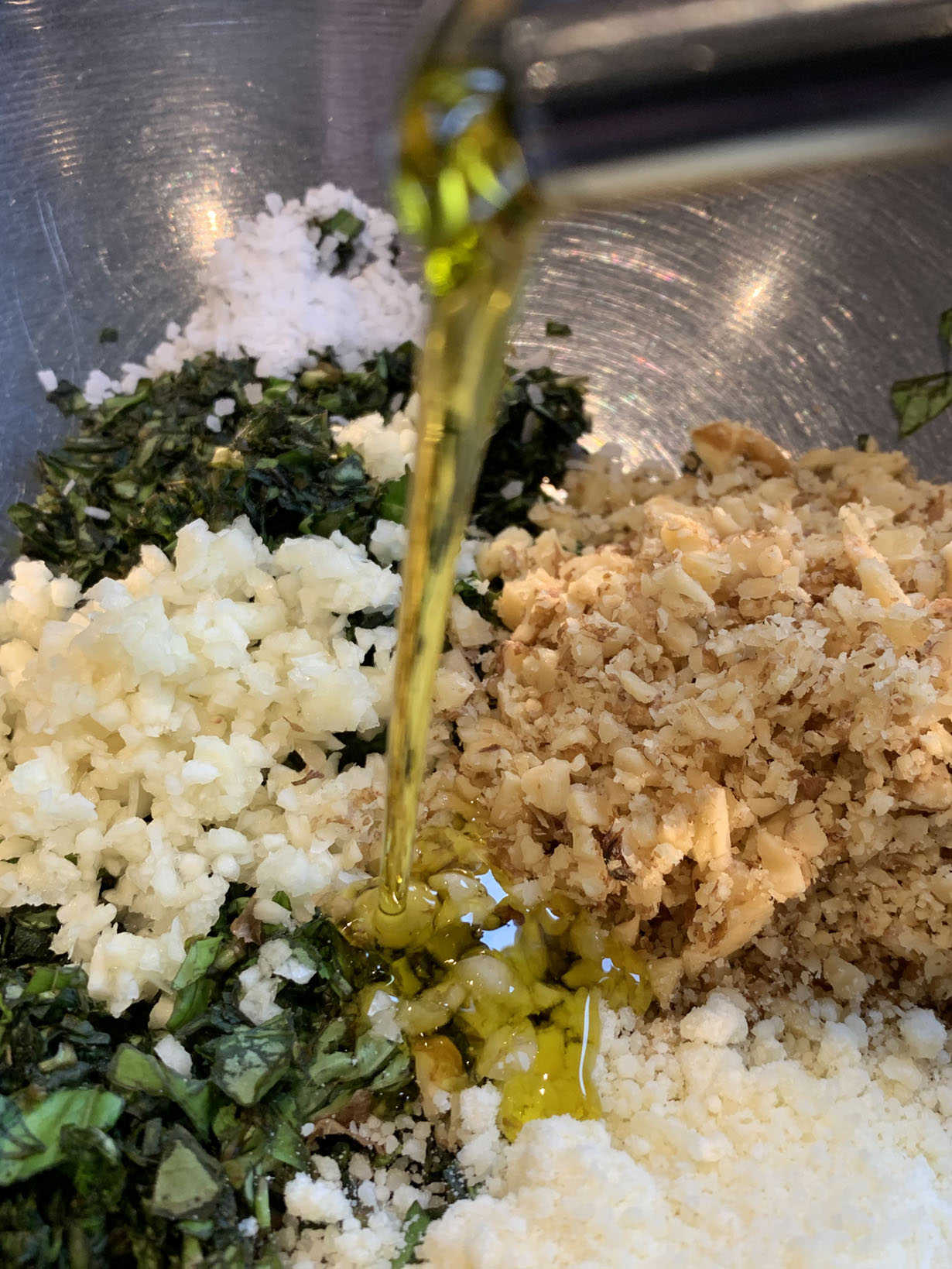 Prepare the pesto by mixing the chopped basil, garlic, walnuts, salt and Parmesan cheese. Add the olive oil and mix until incorporated. Set the pesto aside.