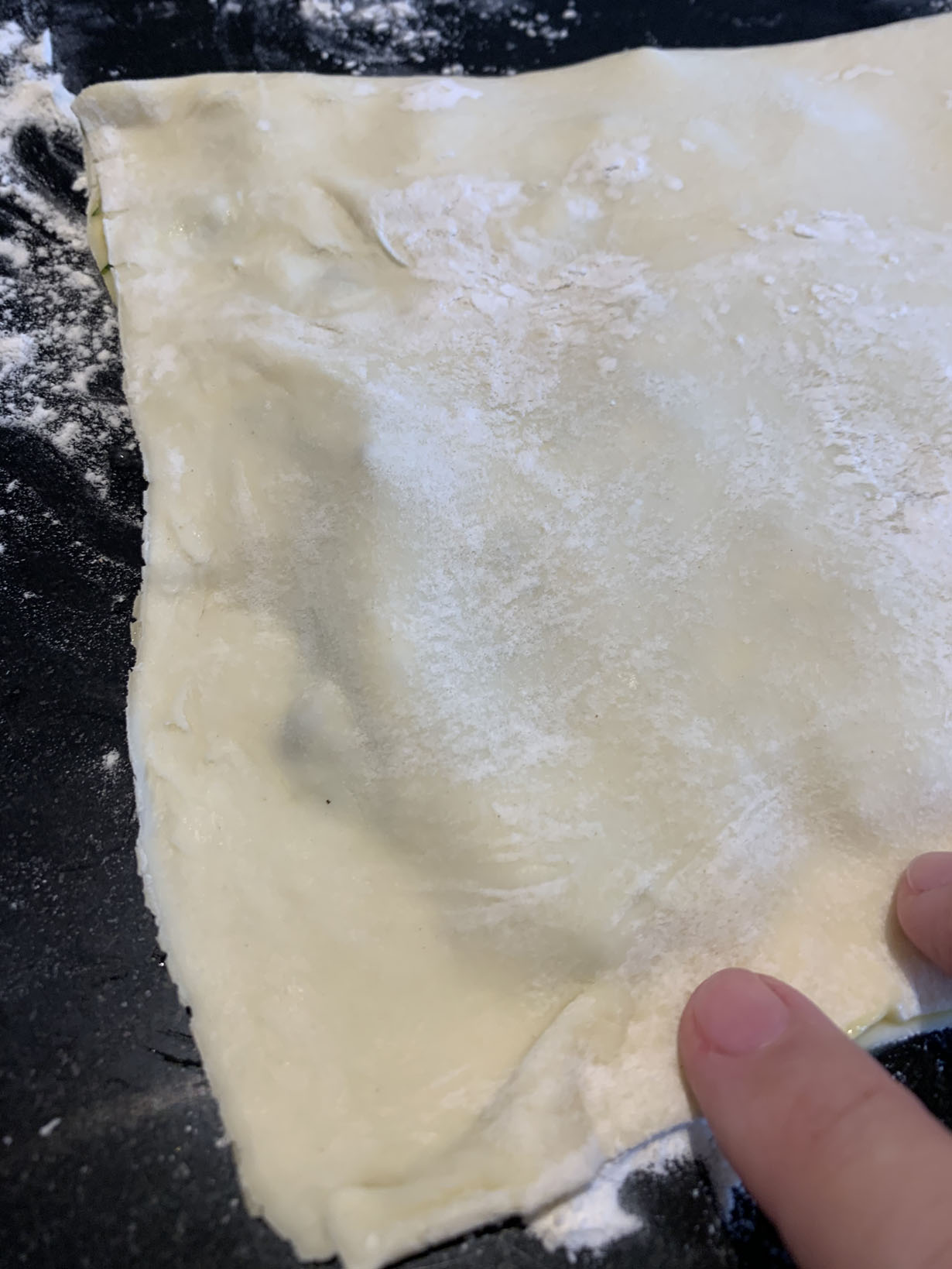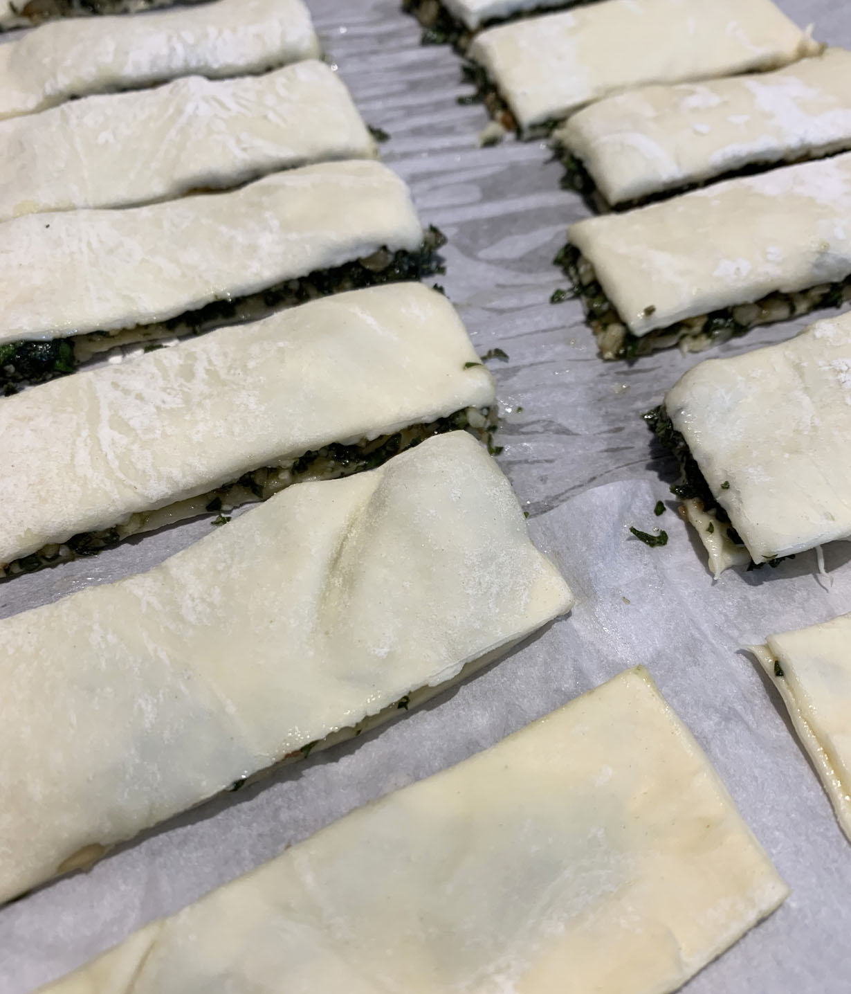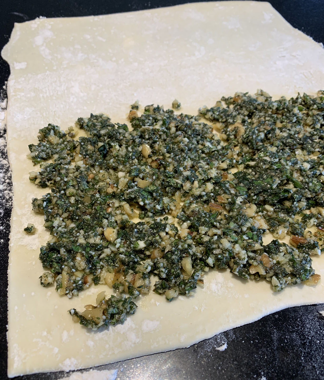 Roll out the puff pastry on a surface dusted with flour. Spread the pesto over half of the rolled out puff pastry. Brush the edges of the puff pastry with egg and fold over to cover the pesto. Refrigerate filled pastry for 15 minutes on a parchment lined baking sheet.