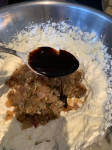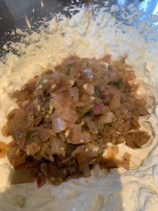 In the meantime, whip the cream cheese until fluffy. Add the sour cream and vinegar, stirring into the cream cheese until combined. Mix in the onion by hand. Refrigerate at least 1 hour before serving.