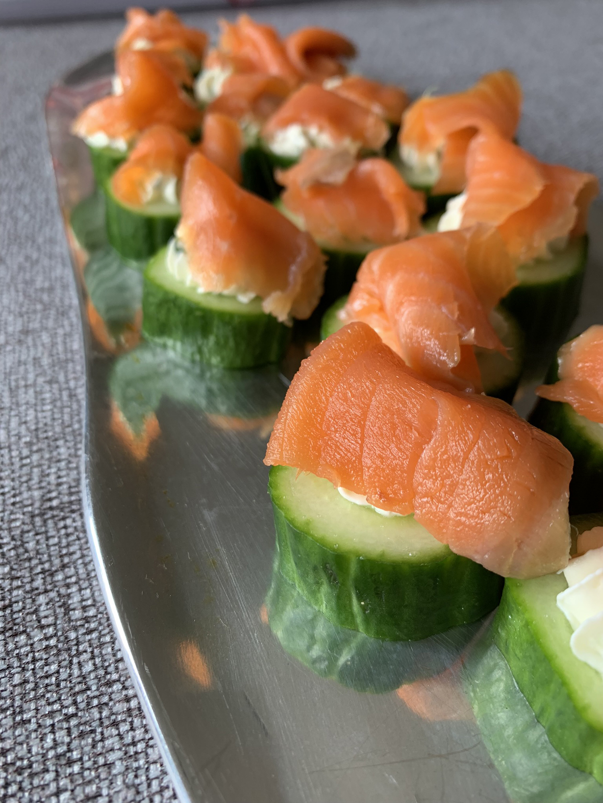 Prepare the filling by beating the cream cheese with the lime juice until smooth. Grate in the coriander and add the chopped shallots. Fill a piping bag fitted with a star tip and fill each cucumber with approximately 1/2 tsp of the filling. Cut the salmon into about 3-inch x 1/2-inch slices. Roll up the salmon strip and rest on the cream cheese filling.