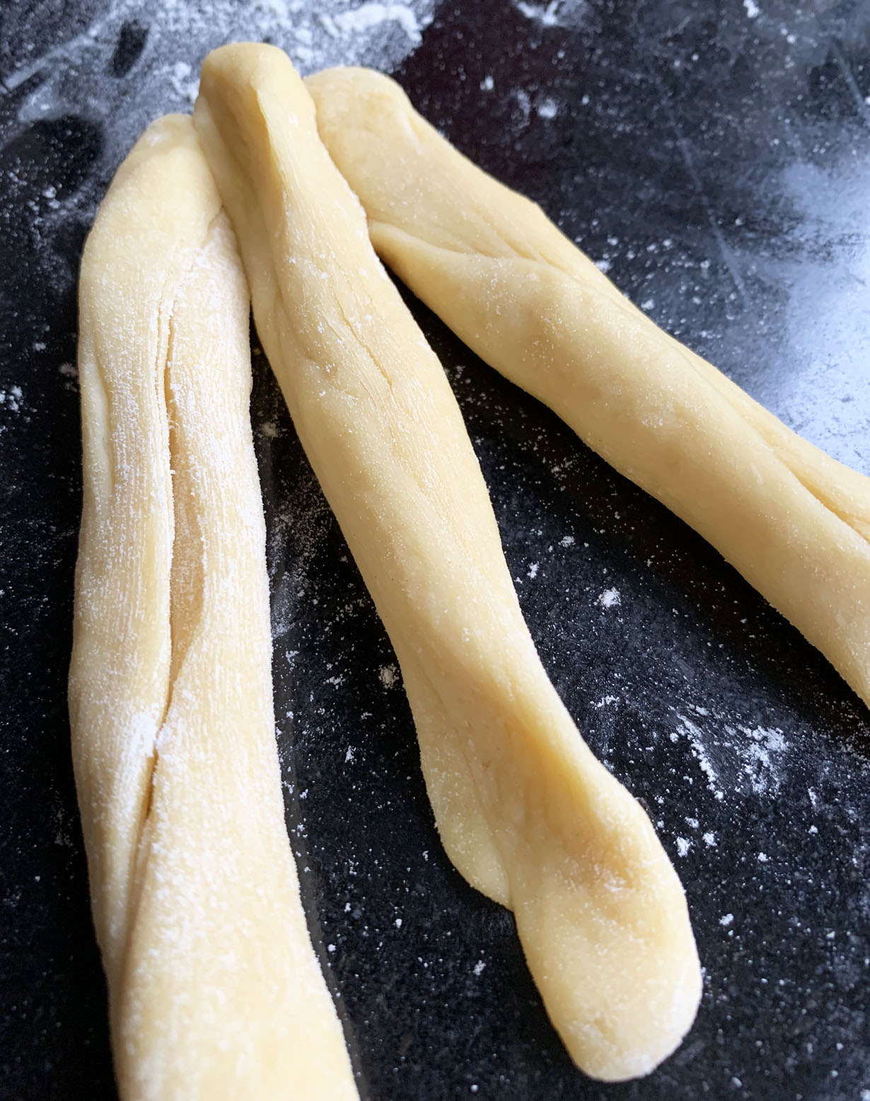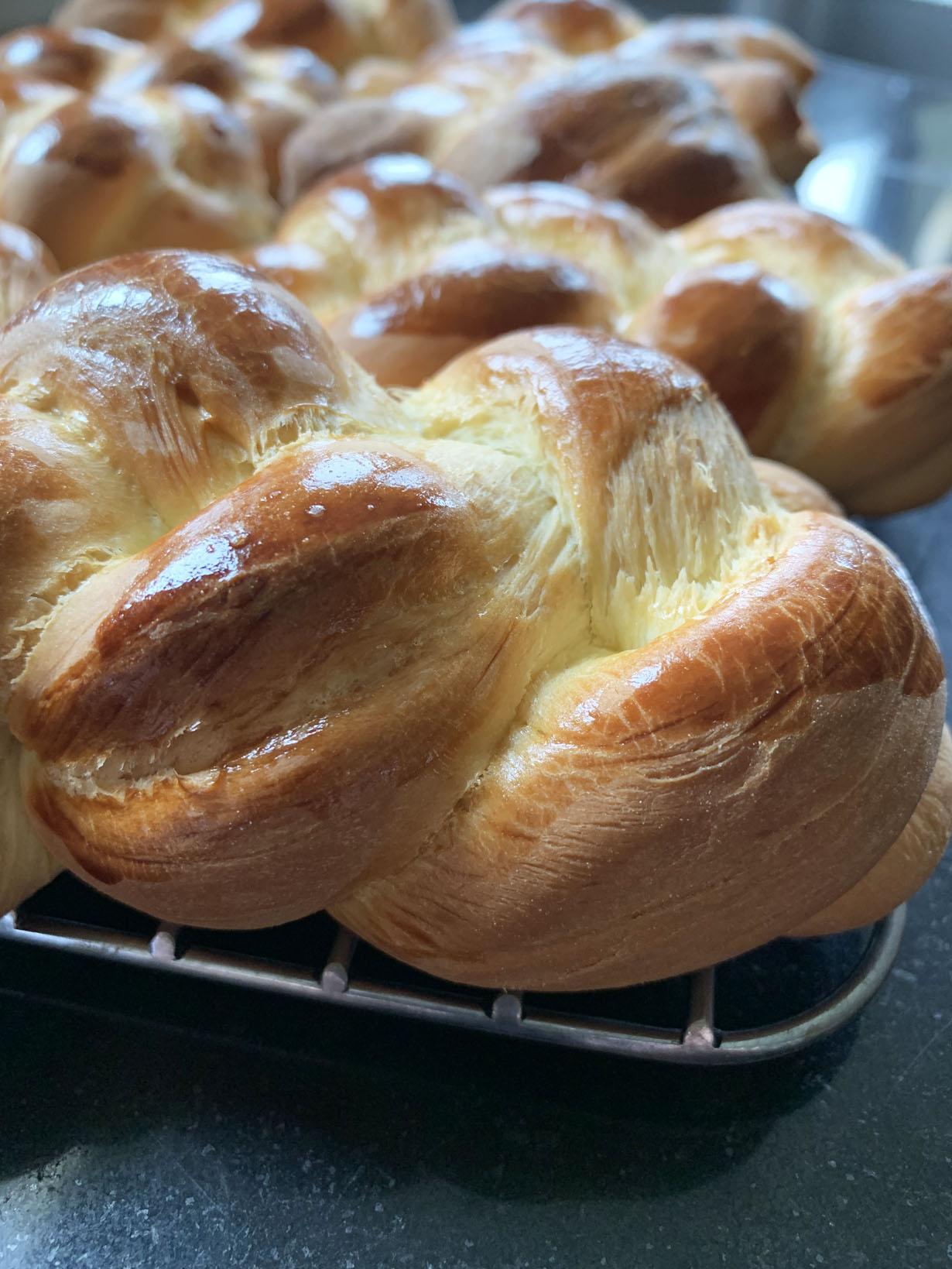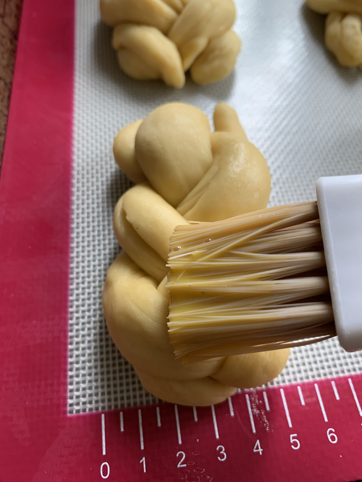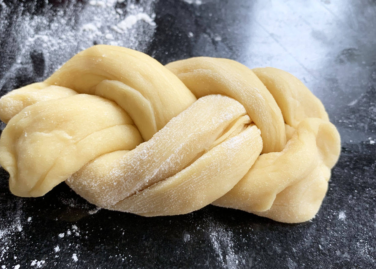 Once it has risen, you will knead the dough a second time and roll it into a log shape. Cut the log into 8 equal pieces and each of the 8 pieces into 3 pieces. Roll the three small pieces out into a thin log shape and braid by placing one log over the other. Tuck the ends in under the braid and place on a lined baking sheet. Repeat process until all eight braided logs are formed. Brush the tops with an egg wash and allow them to rest for 1 to 2 hours (until they double in size).