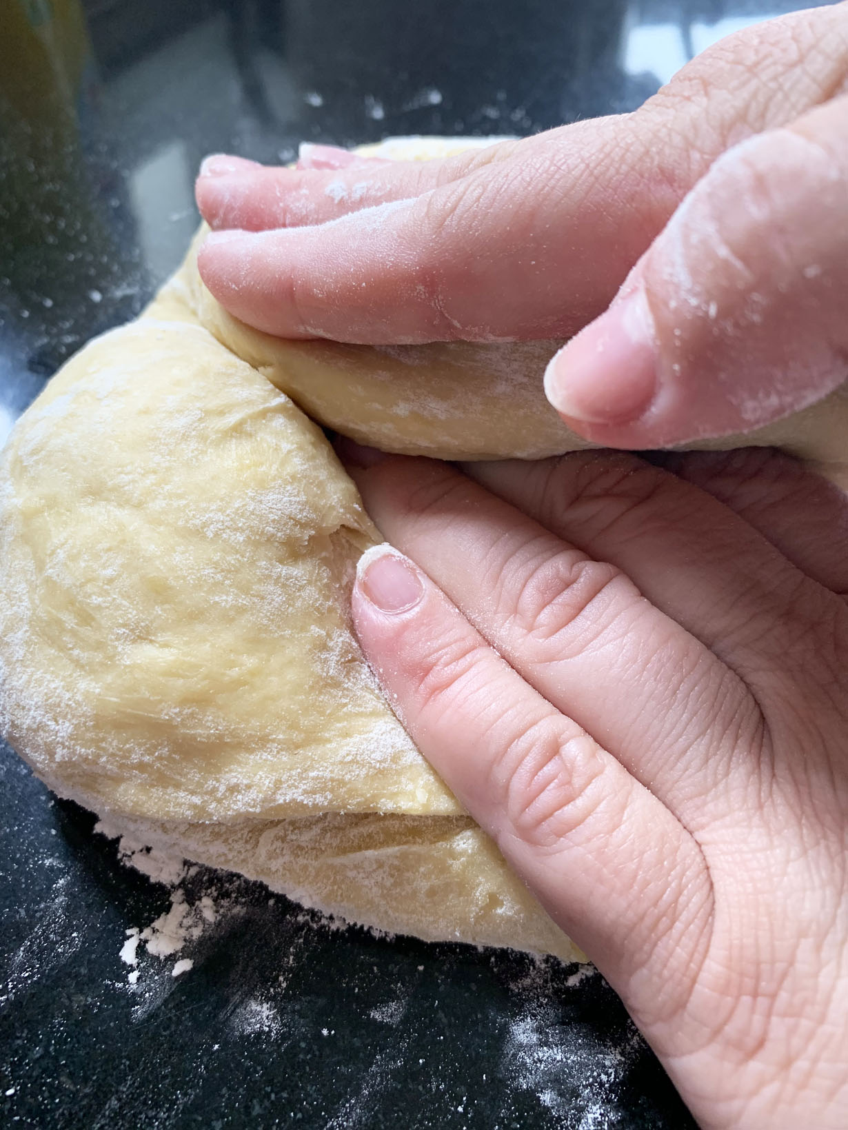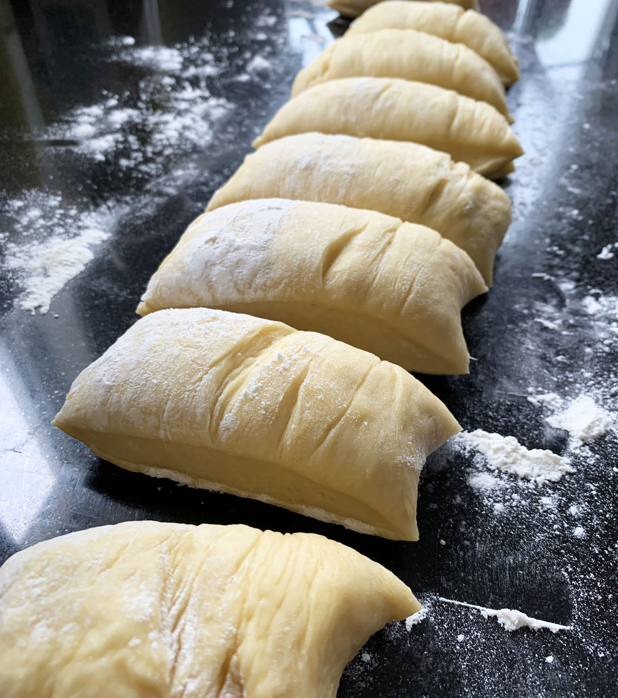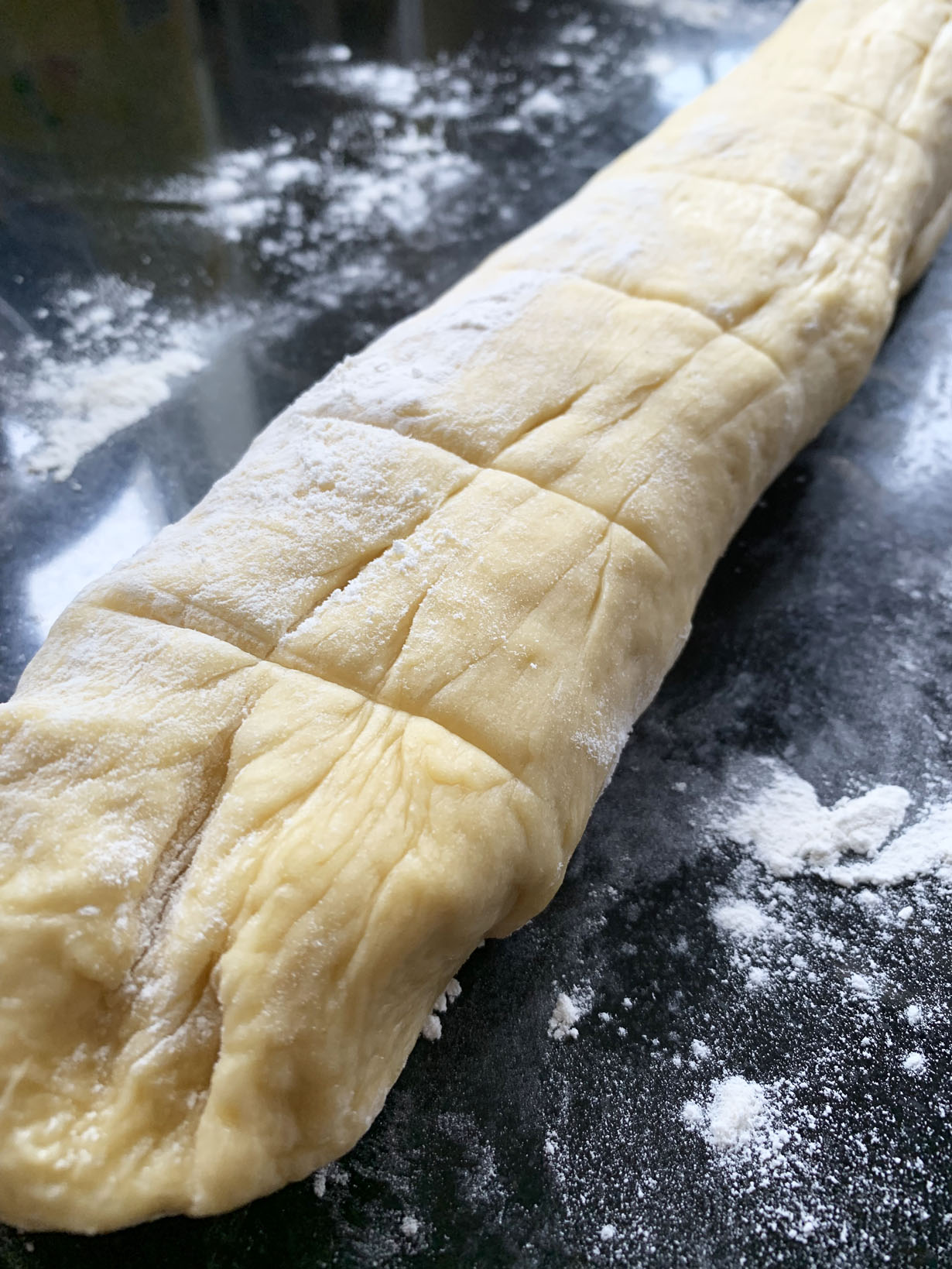 Once it has risen, you will knead the dough a second time and roll it into a log shape. Cut the log into 8 equal pieces and each of the 8 pieces into 3 pieces. Roll the three small pieces out into a thin log shape and braid by placing one log over the other. Tuck the ends in under the braid and place on a lined baking sheet. Repeat process until all eight braided logs are formed. Brush the tops with an egg wash and allow them to rest for 1 to 2 hours (until they double in size).