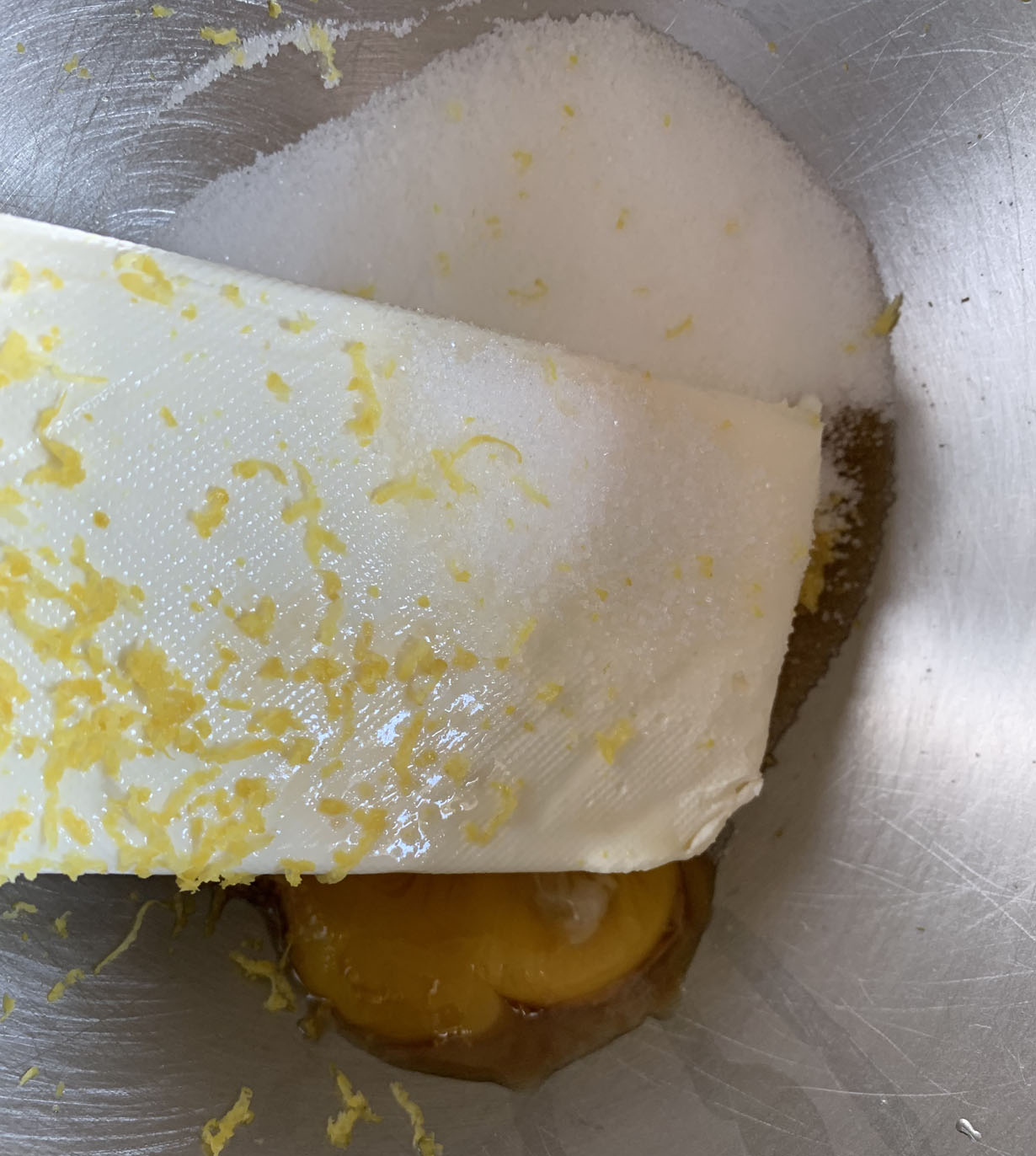 Preheat the oven to 400°F and line a baking sheet with a silicone mat or parchment paper. In a mixing bowl, combine the cream cheese, sugar, egg yolk, extracts, and zest. Beat together until smooth and fluffy.