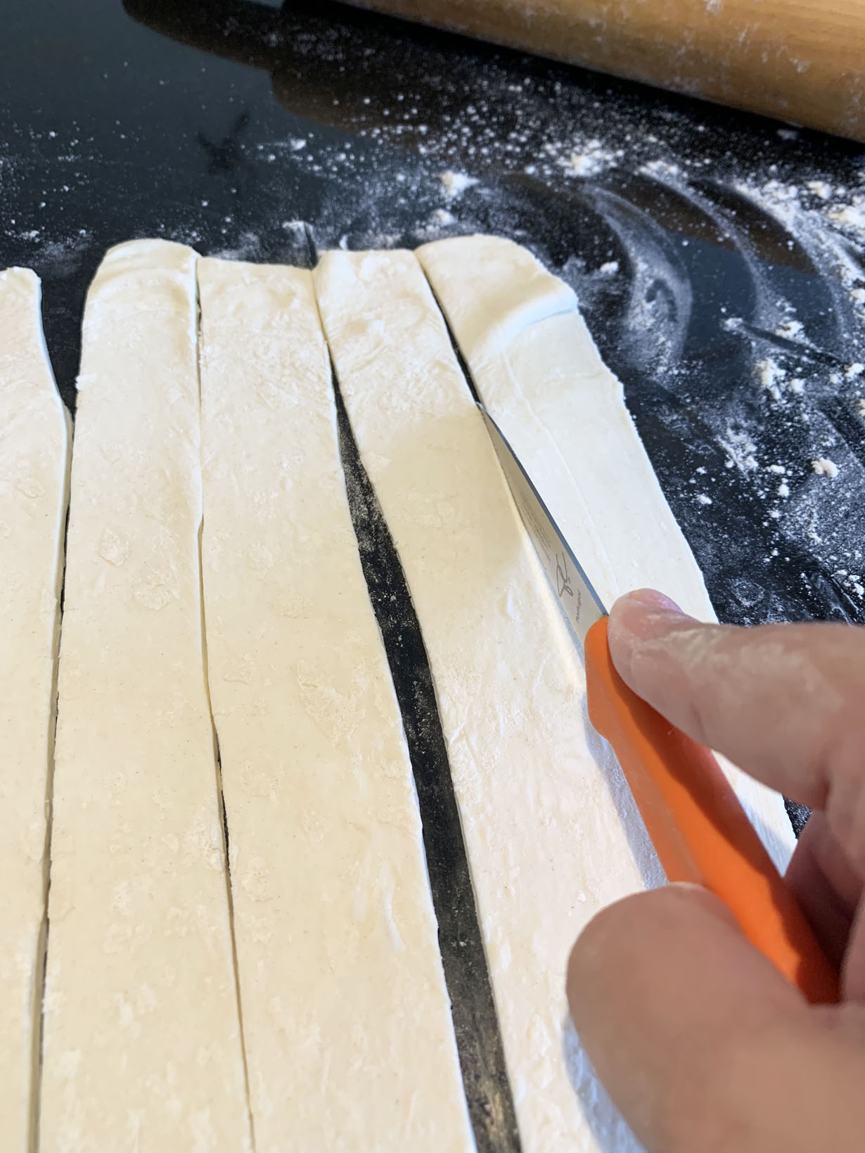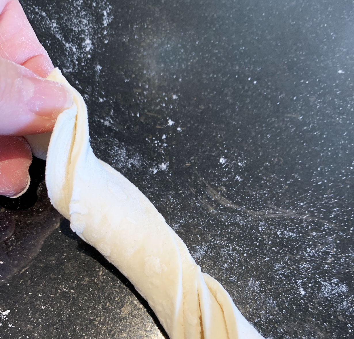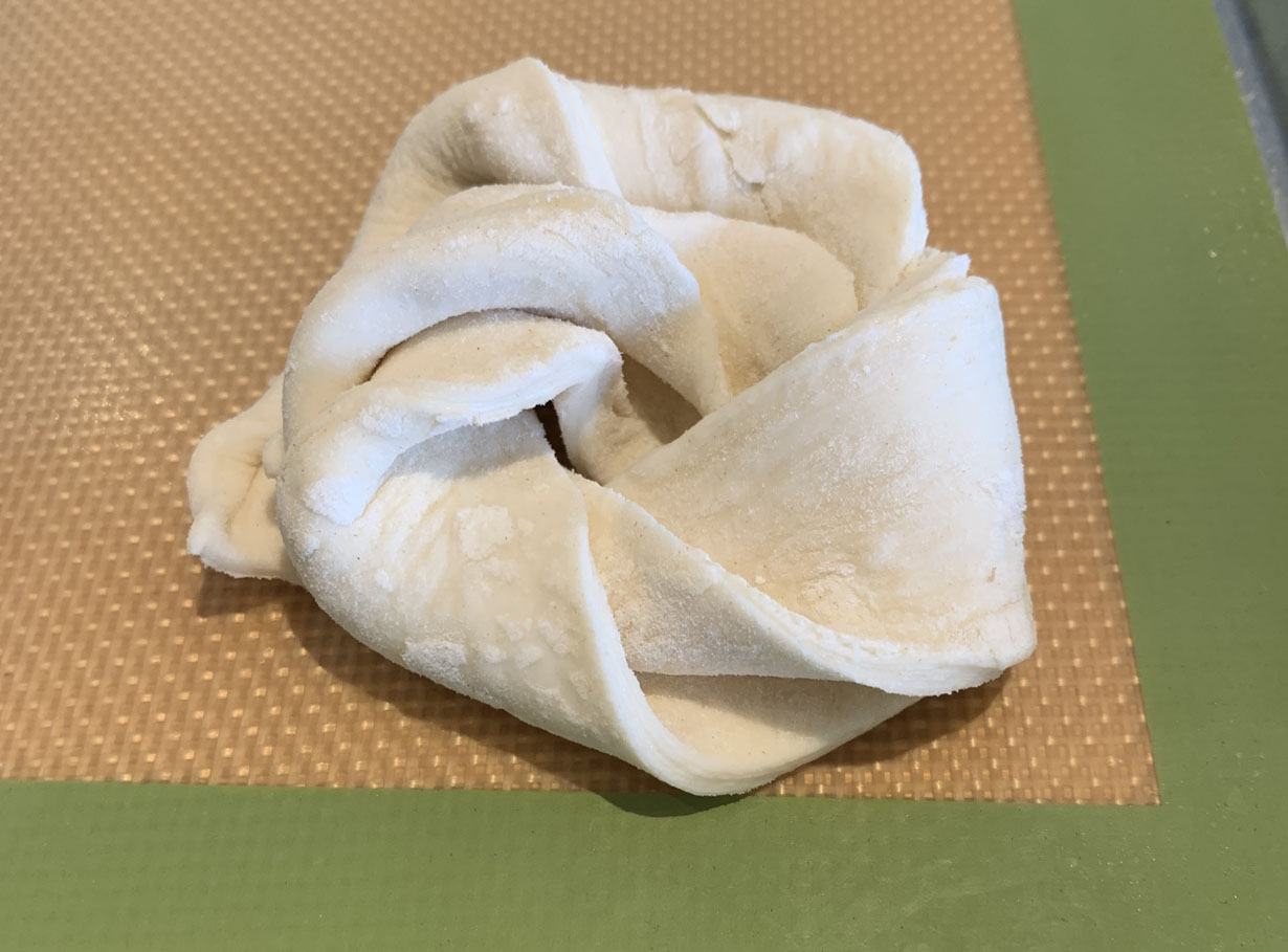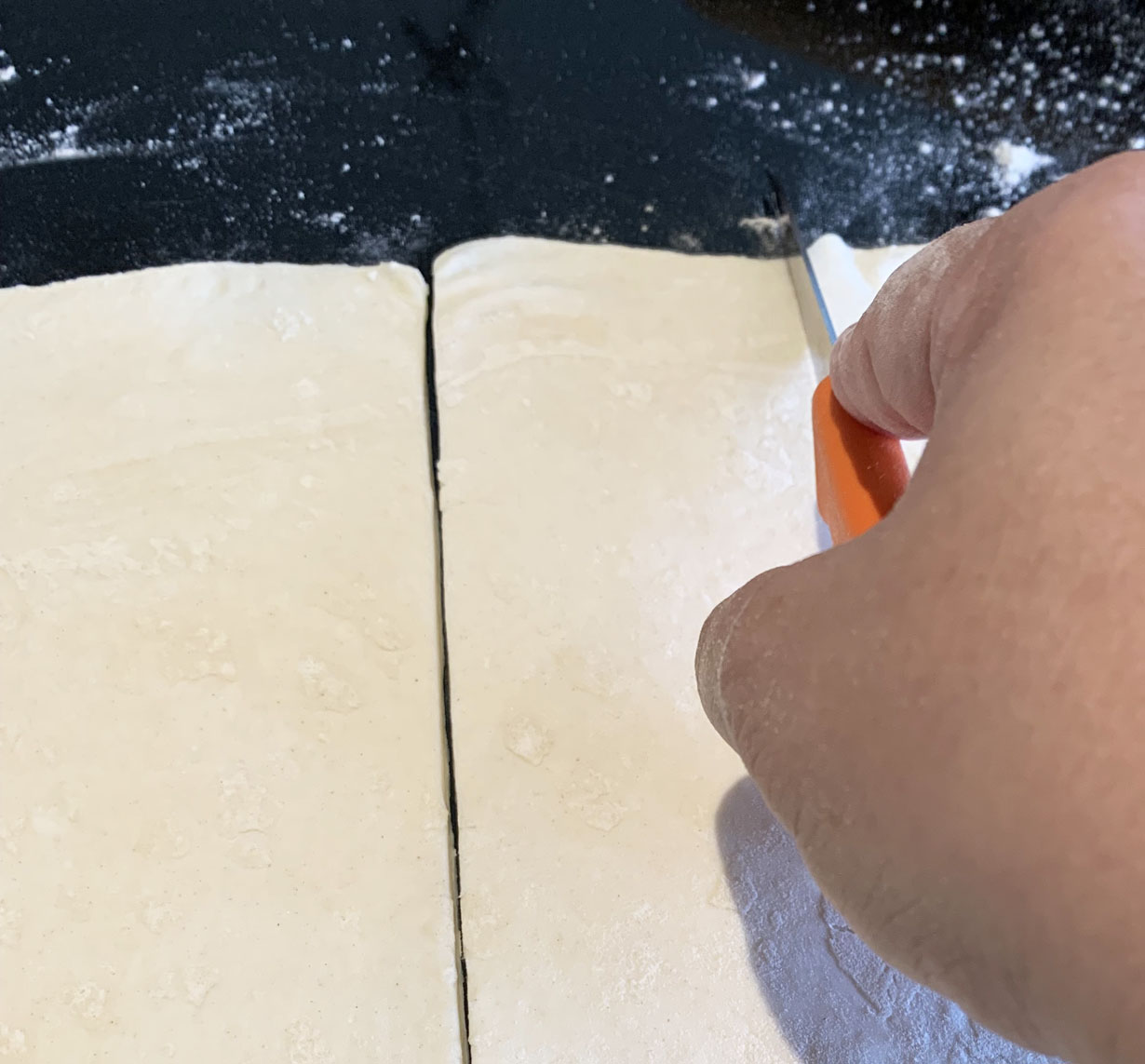 Roll out the first section of puff pastry into a 10” by 10” square. Cut each piece in half and then cut the halves again into two pieces. Cut each of the four pieces in half. Hold two of the pieces on one end and twist the other end. Create a spiral by placing rolling one end around the other. Do not make a tight roll as the puff pastry will puff up. Repeat for the remaining puff pastry until all the shells are complete.