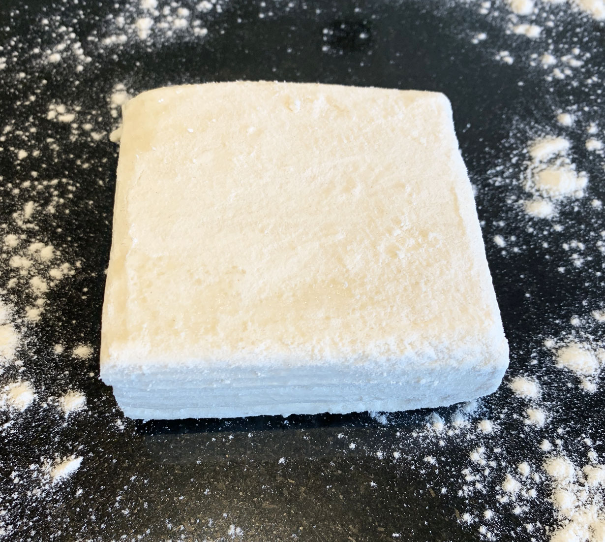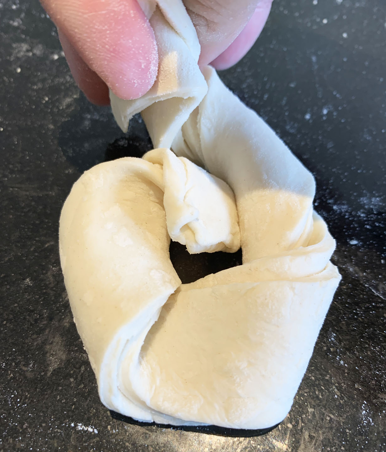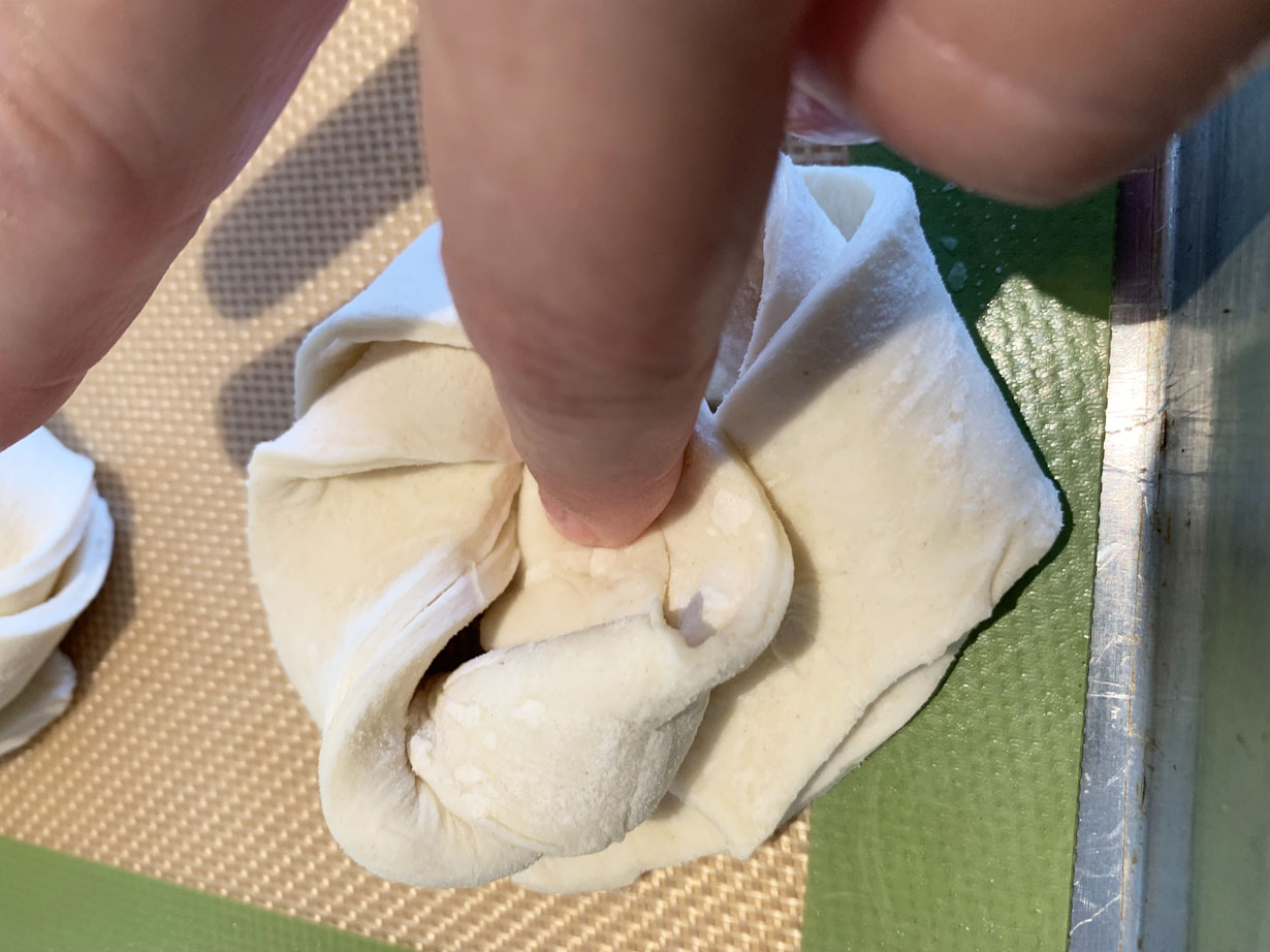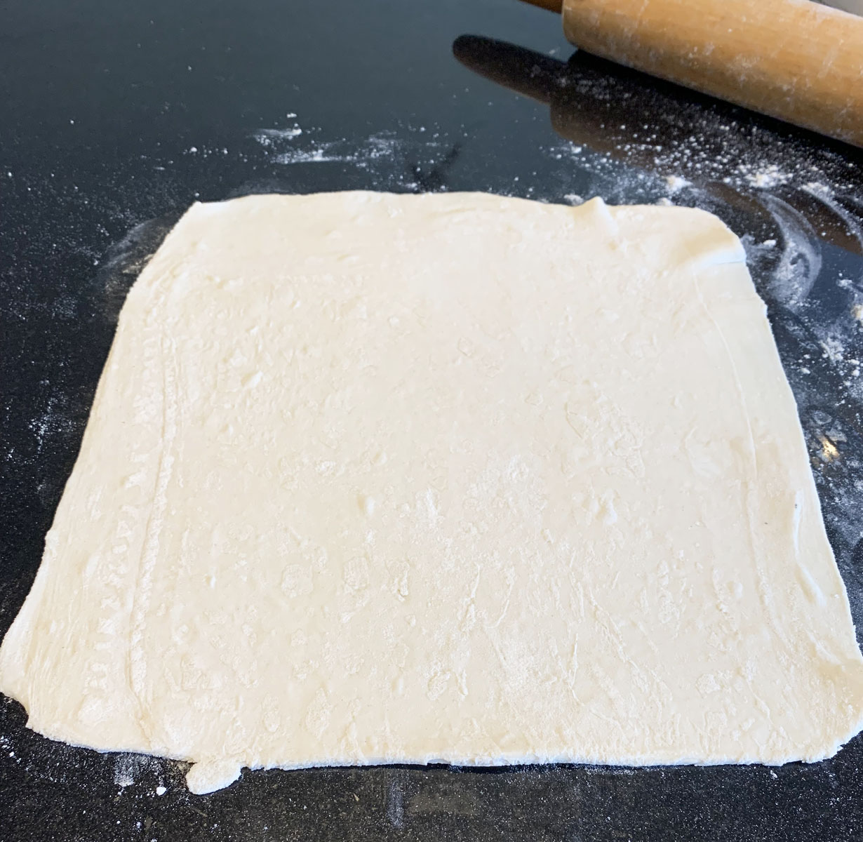 Roll out the first section of puff pastry into a 10” by 10” square. Cut each piece in half and then cut the halves again into two pieces. Cut each of the four pieces in half. Hold two of the pieces on one end and twist the other end. Create a spiral by placing rolling one end around the other. Do not make a tight roll as the puff pastry will puff up. Repeat for the remaining puff pastry until all the shells are complete.