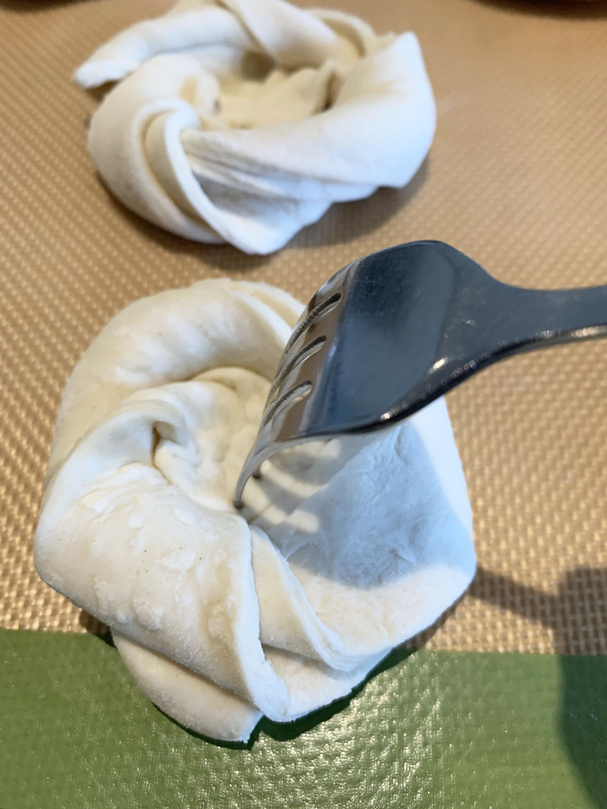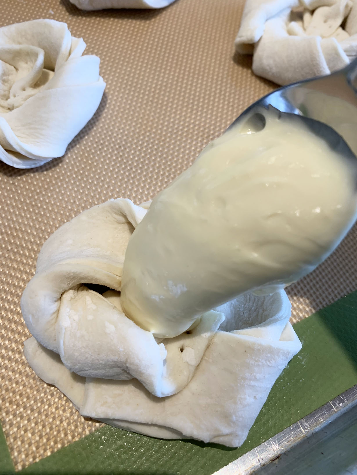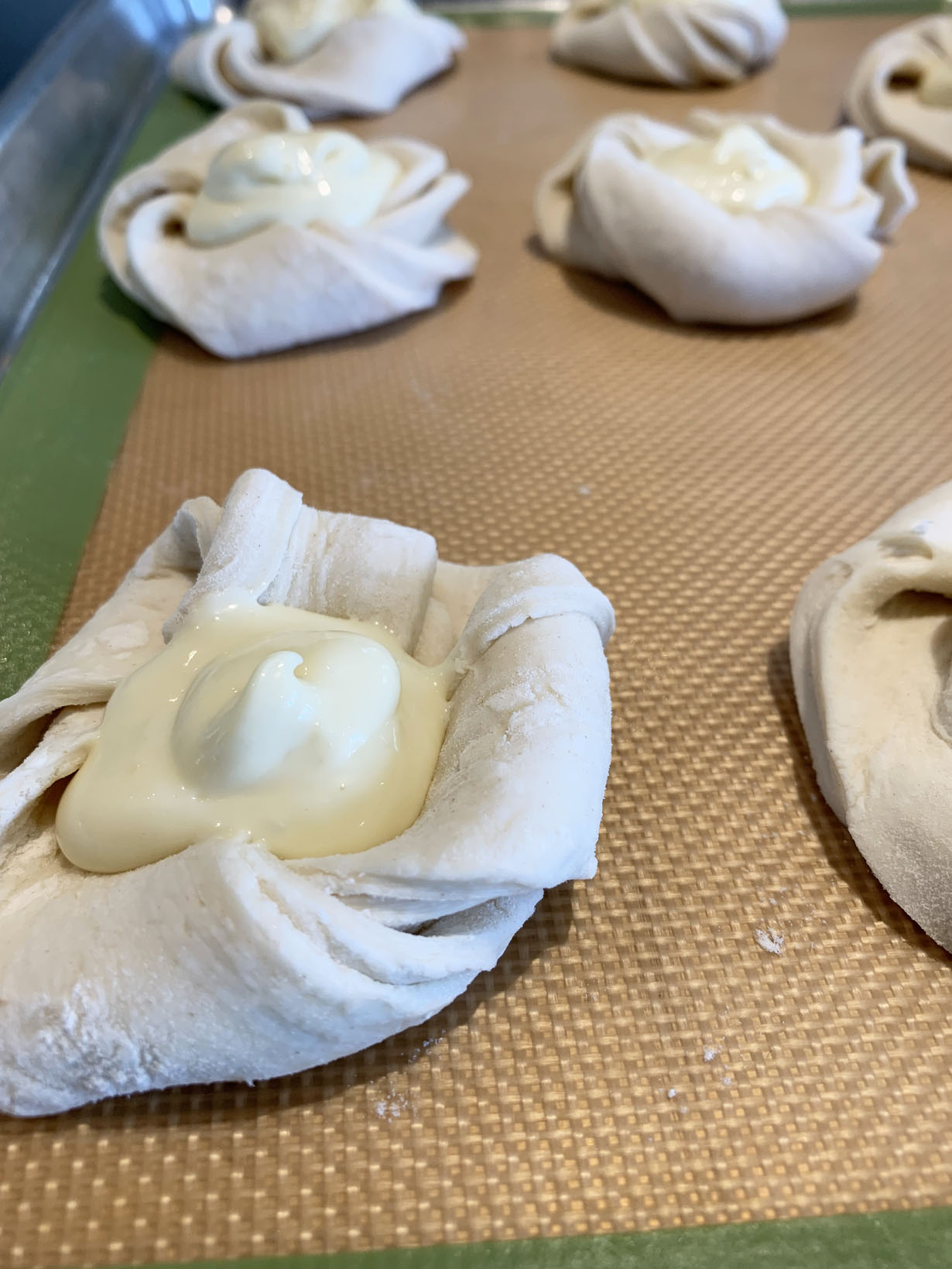 Press down the center of each danish with your fingers to create a spot for the filling. Poke with a fork a few times to prevent it from puffing up. Add one heaping tablespoon full of the filling in each center.