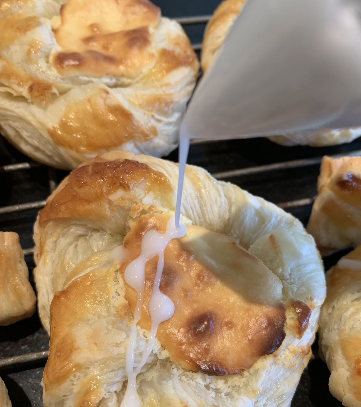 Bake for 20 minutes and cool on a wire rack before glazing. To prepare the glaze, simply mix together the confectioners sugar and lemon juice, adding a few drops of water at a time until it reaches a drizzling consistency. Drizzle each danish with the glaze and serve.