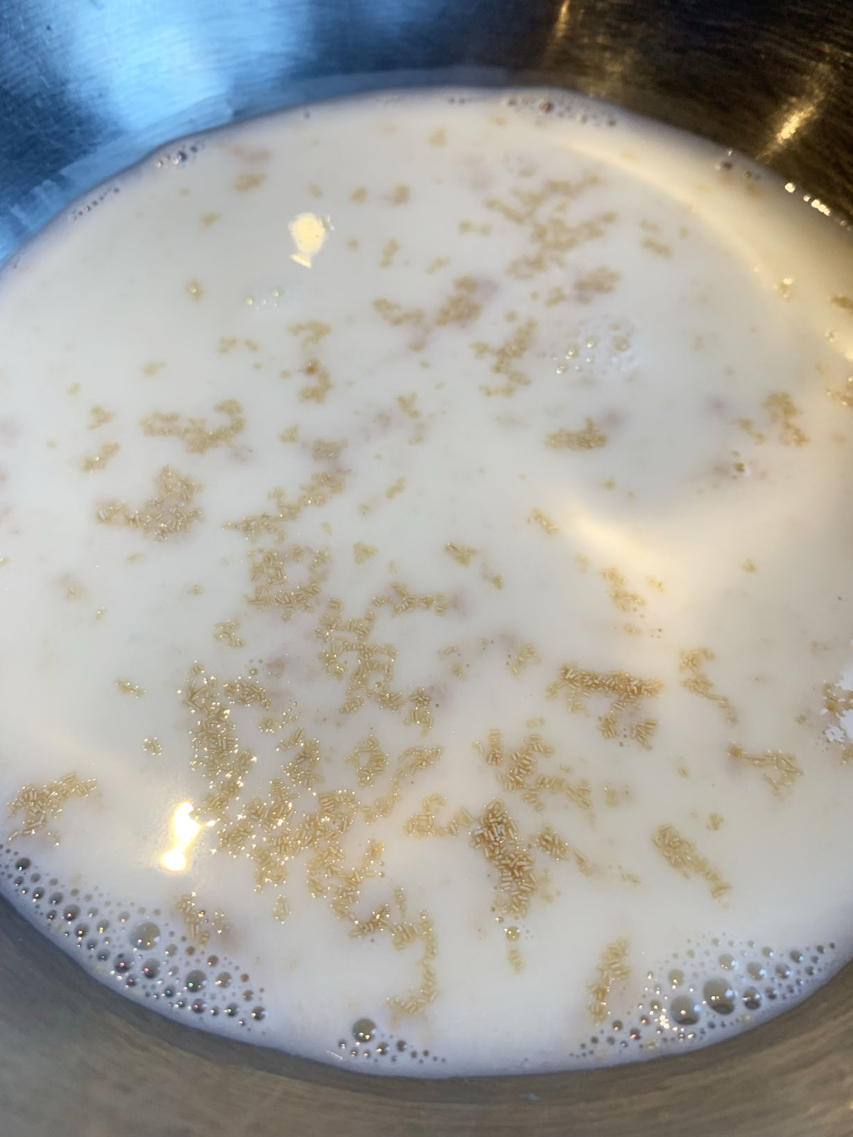 Mix the dry yeast and sugar in a bowl and pour the warmed milk and water over it. Allow it to rest for 10 minutes to activate. In a large bowl, whisk the flour, Splenda Keto sweetener, salt, and nutmeg. Set aside. Mix together 4 tablespoons of butter with the egg yolk and vanilla extract.