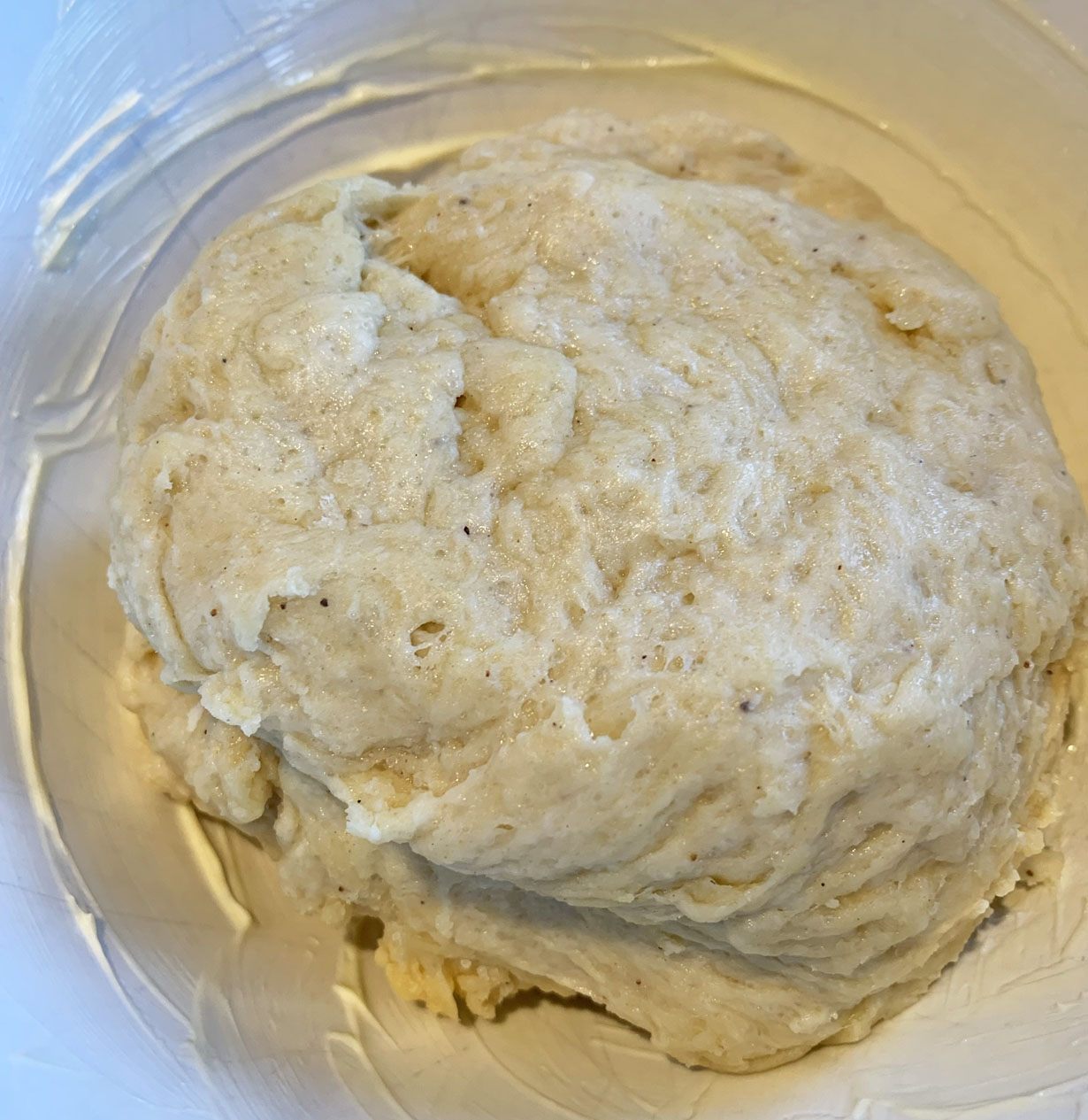 Make a well in the center of the flour mixture and add the yeast mixture and butter mixture. Mix together and knead for a few minutes. The mixture is slightly sticky, even after kneading. Place the dough in a buttered bowl and cover. Let it rise for 1 hour until it is doubled in size.
