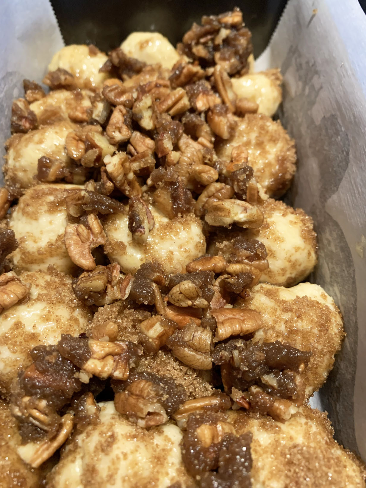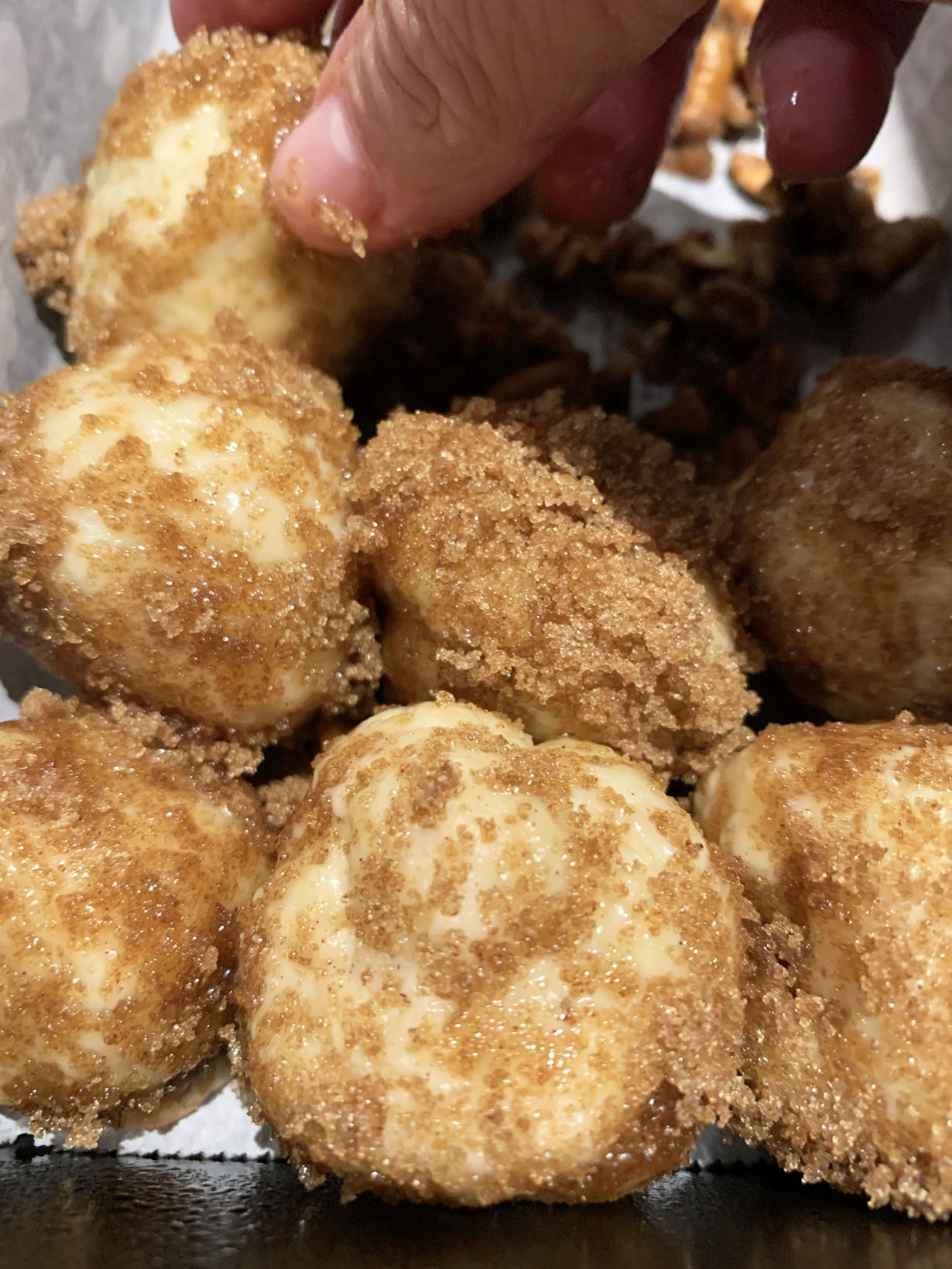 When the dough has risen, cut into equal portions and roll into 1 1/2” balls. While you are rolling the dough, you will be kneading it. Place the prepared rolls onto a tray. Prepare a coating for the balls by mixing together the cinnamon and 1/3 cup of Splenda. Place the remaining melted butter next to the coating in another bowl. Dip each ball into the melted butter and then into the coating. Place each ball into the prepared pan.