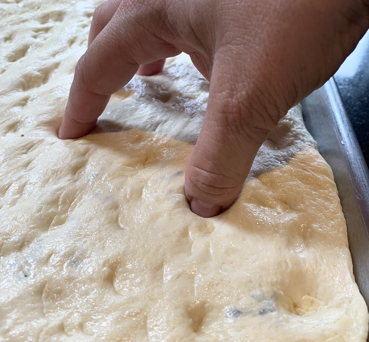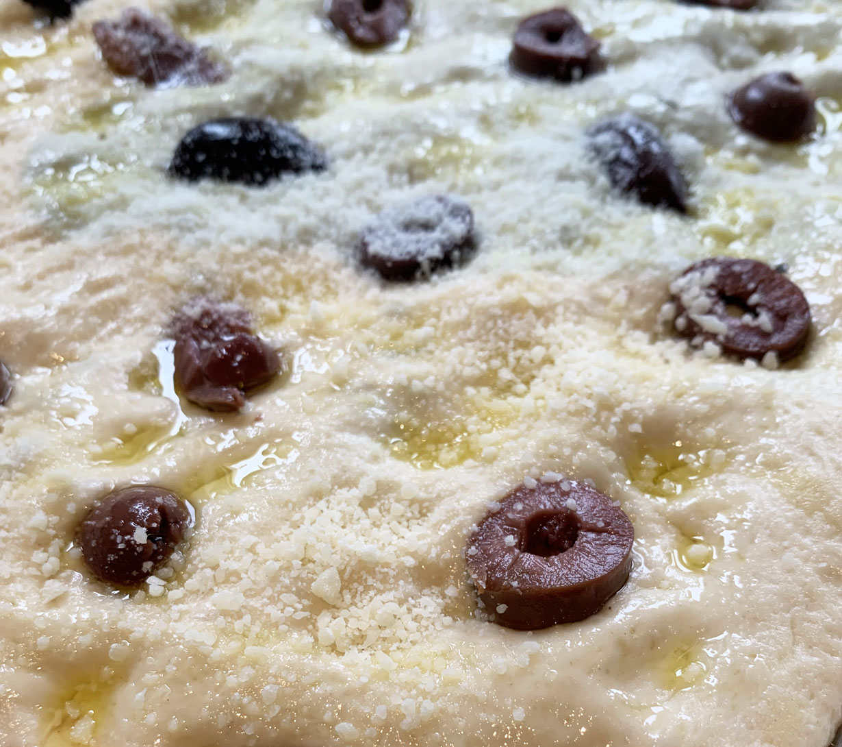Place the dough in a greased bowl and allow it to rise for 2 hours. The dough will double in size. Grease a baking sheet and spread out the dough. Using your fingers, punch into the dough to create dips and valleys. Brush the surface with the remaining oil and press the olive slices into the bread with your finger. Sprinkle the entire surface with the Parmesan cheese and let it rest for 30 minutes. In the meantime, preheat your oven to 425°F.