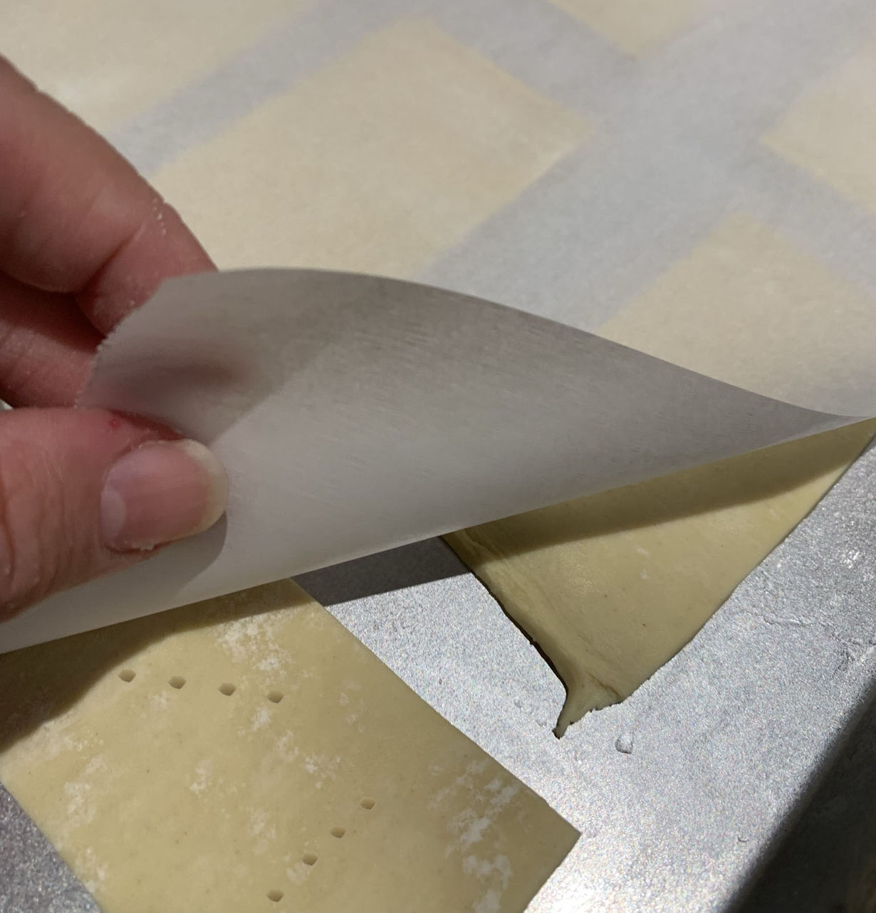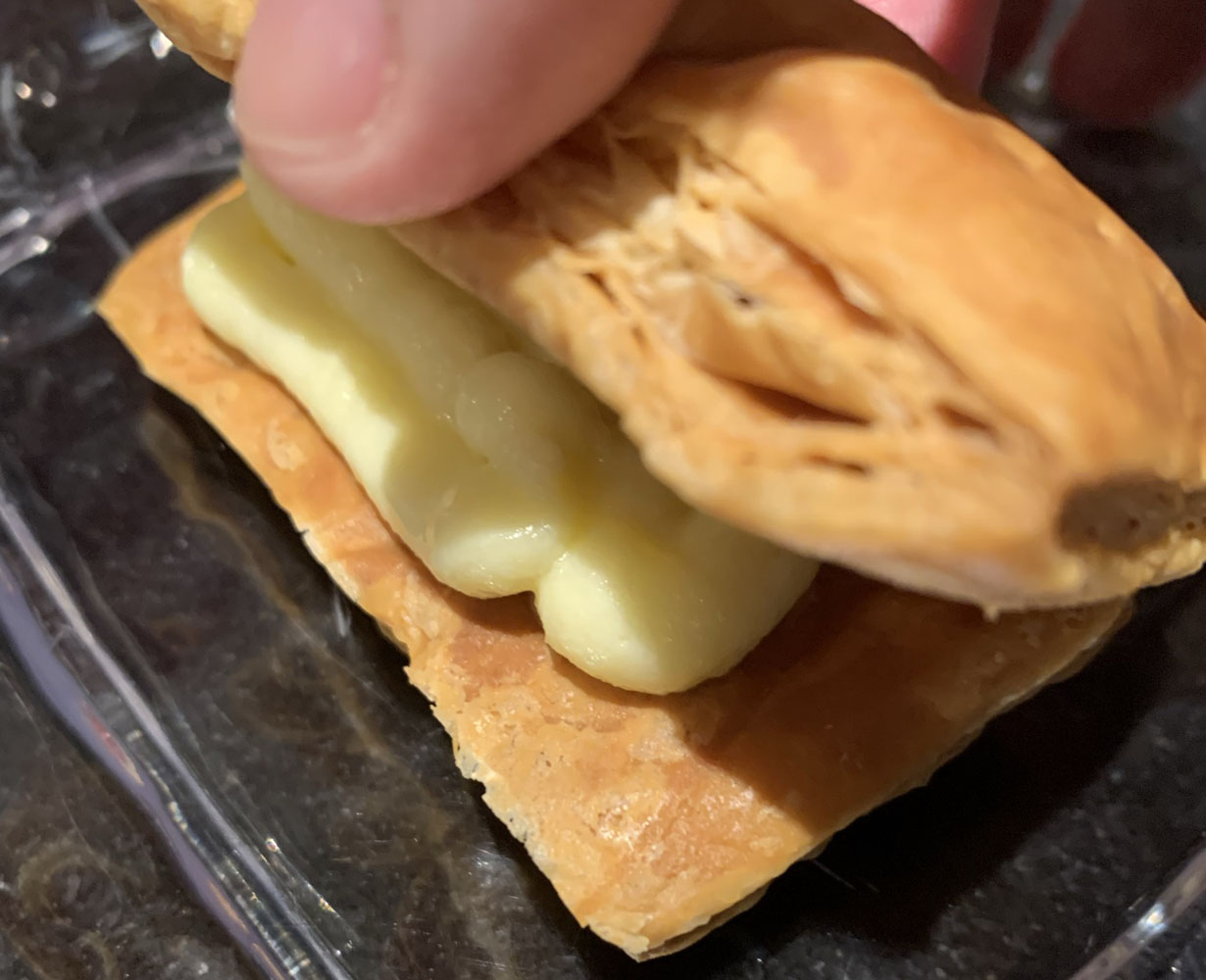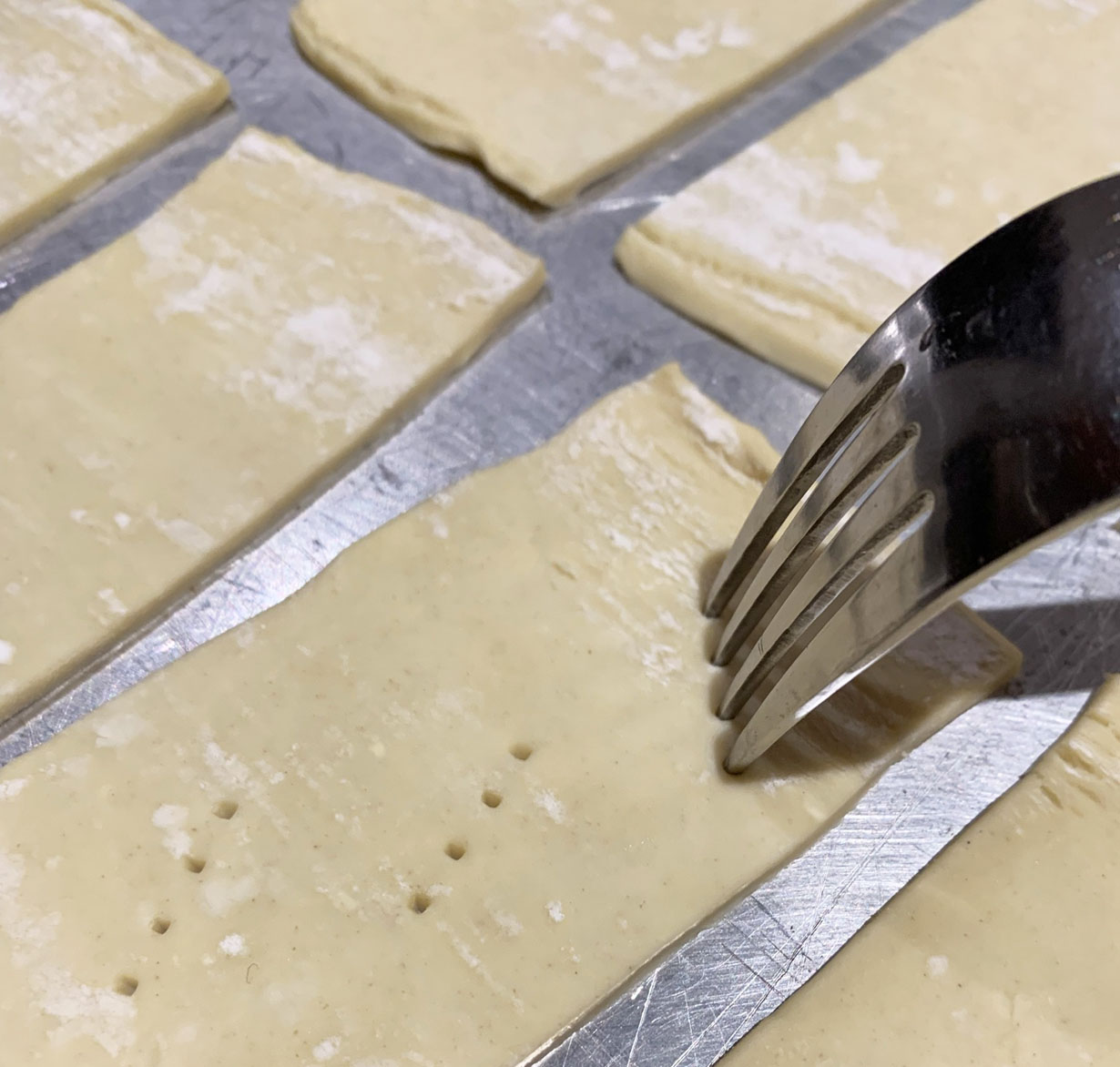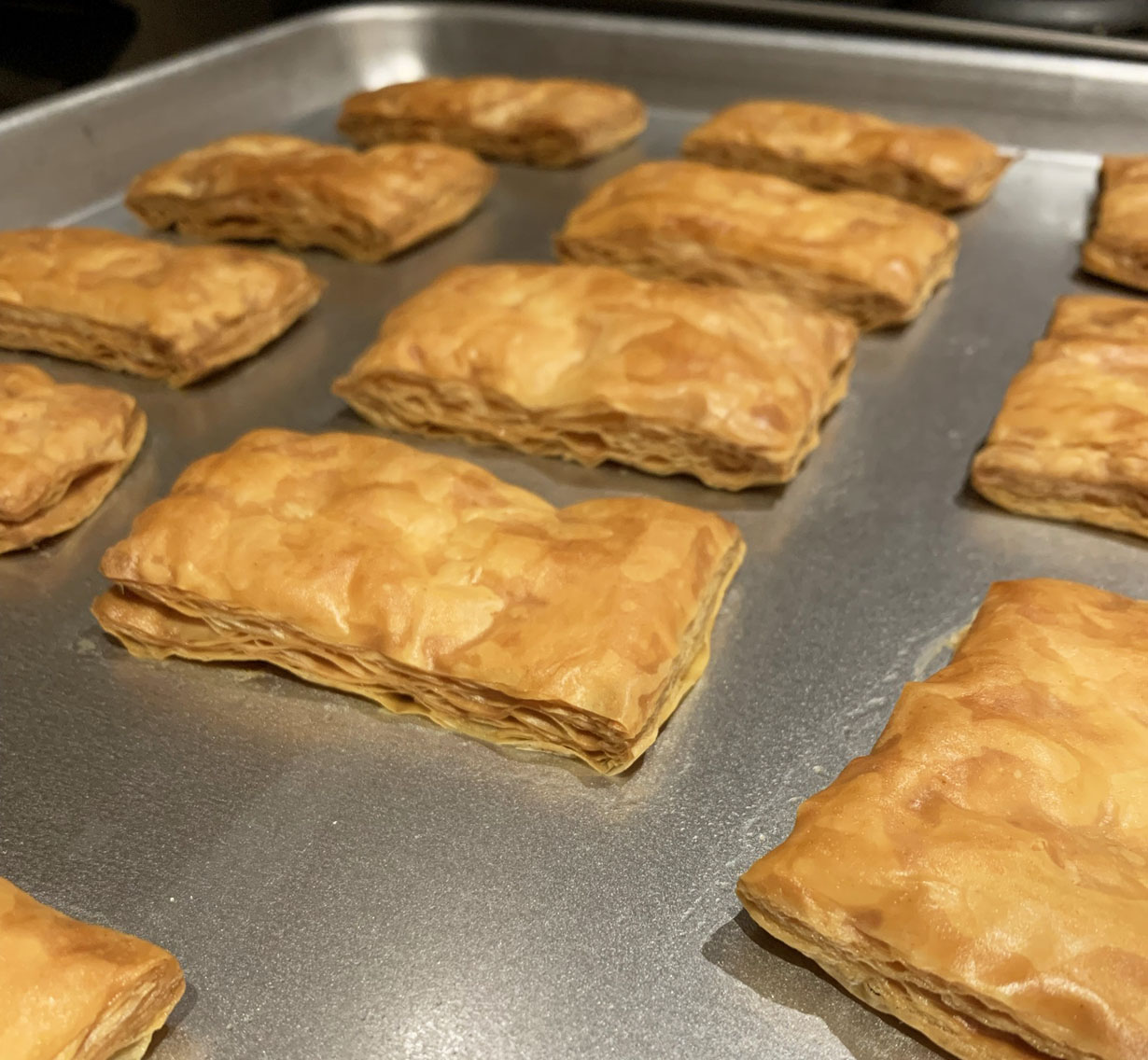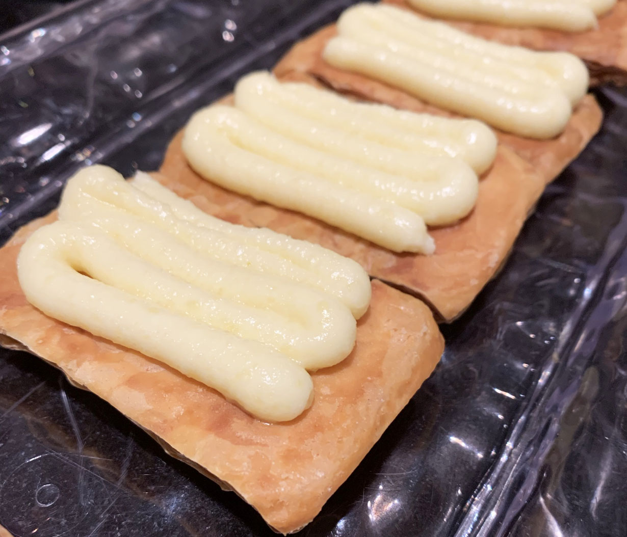 Prepare the puff pastry by preheating your oven to 400°F and lining a baking sheet with a silicone mat. Cut each puff pastry sheet into 16 equal pieces (approximately 2” x 3” in size) and place them on the baking sheet. Score the dough with the tines of a fork and cover with a sheet of parchment paper. Place three sheets of aluminum foil over the parchment paper and nest another baking sheet on top to apply pressure. Bake for 15 minutes and remove from the oven. Take off the top pan, aluminum foil, and parchment paper and return to the oven. Bake for an additional 15 minutes until golden brown and crunchy. Transfer to a cooling rack and cool completely before filling and frosting.