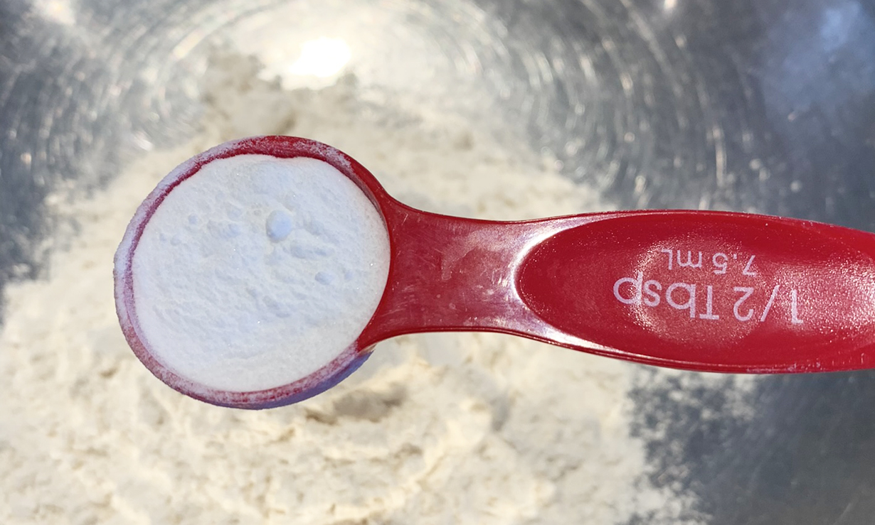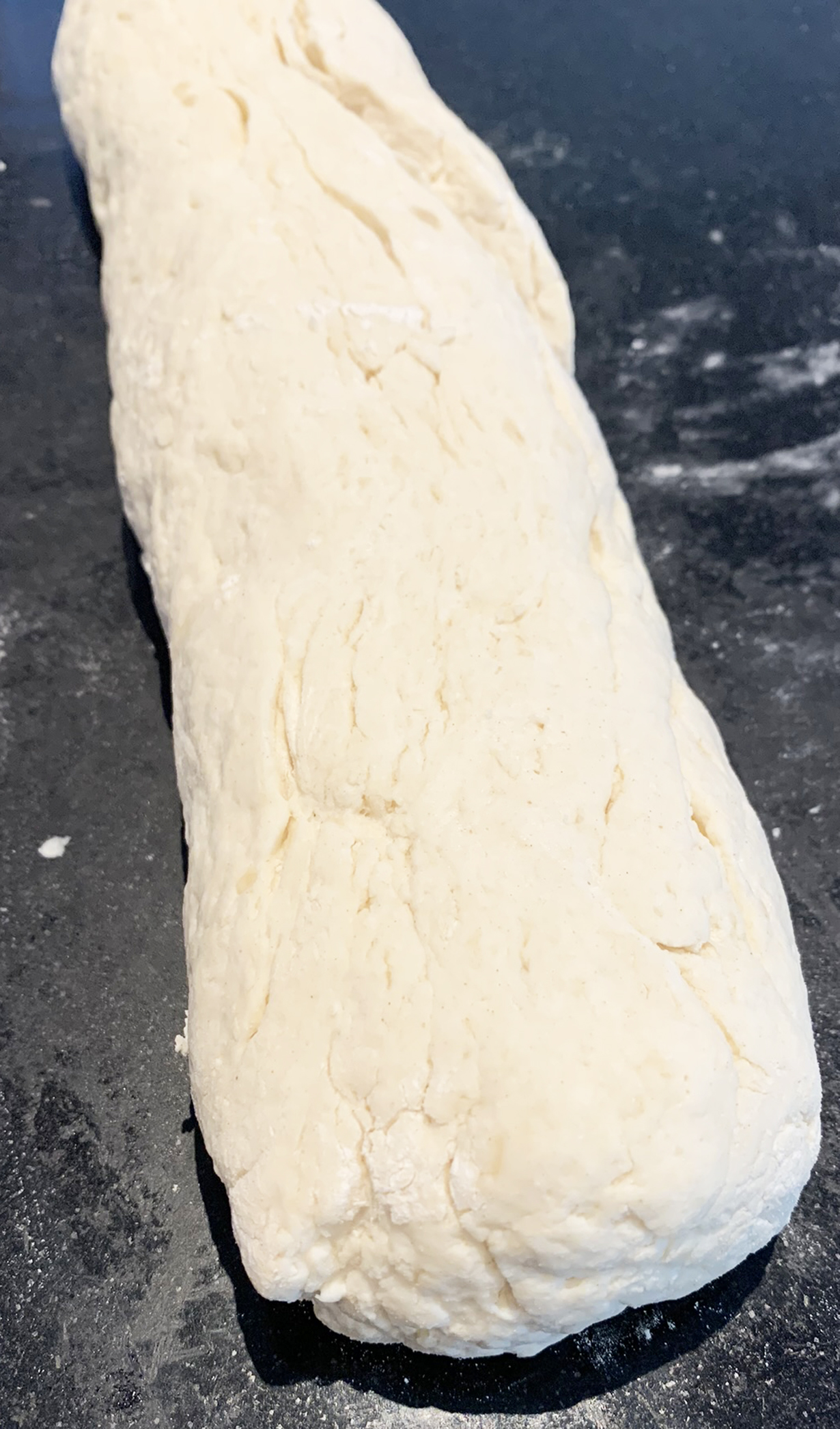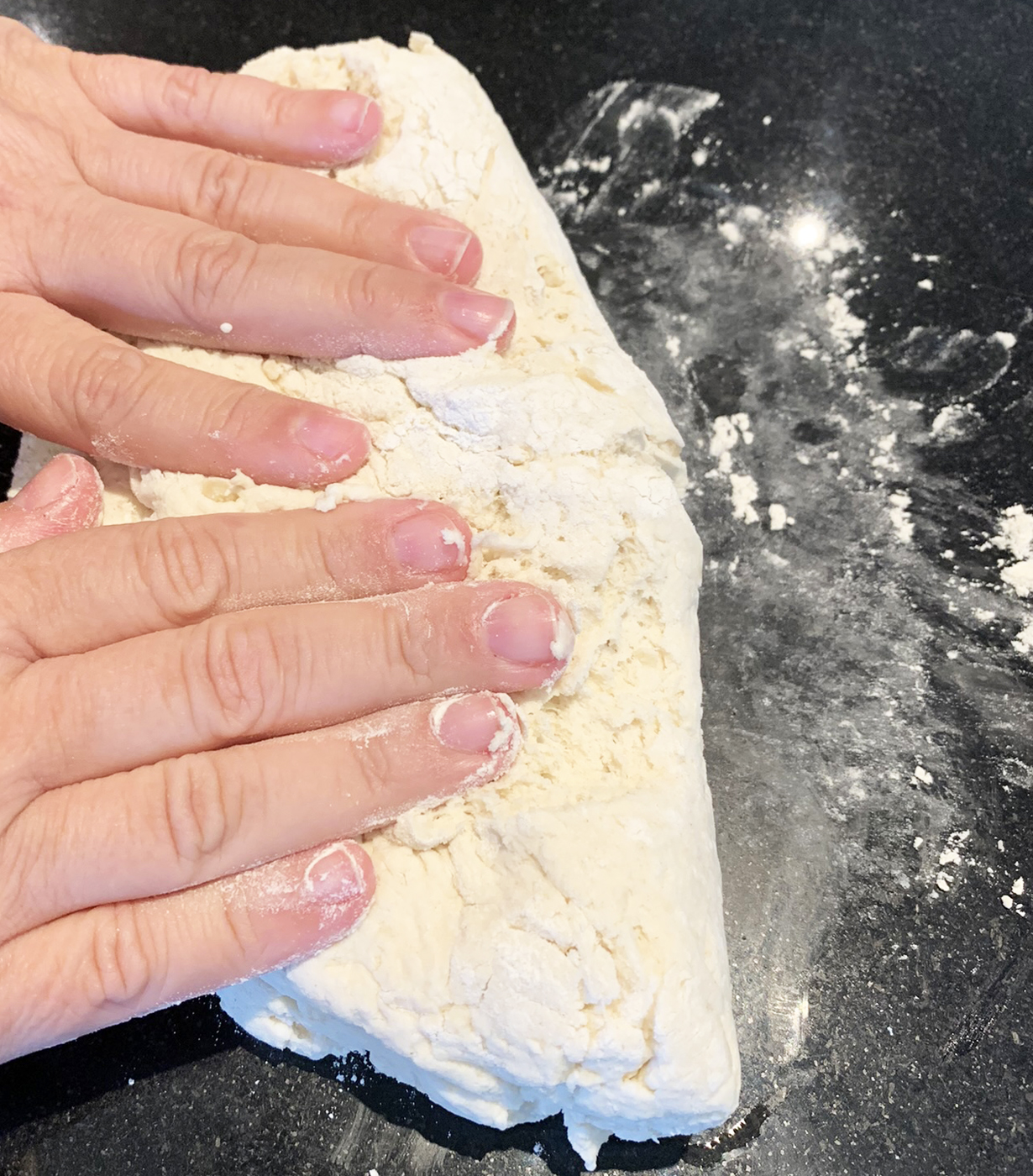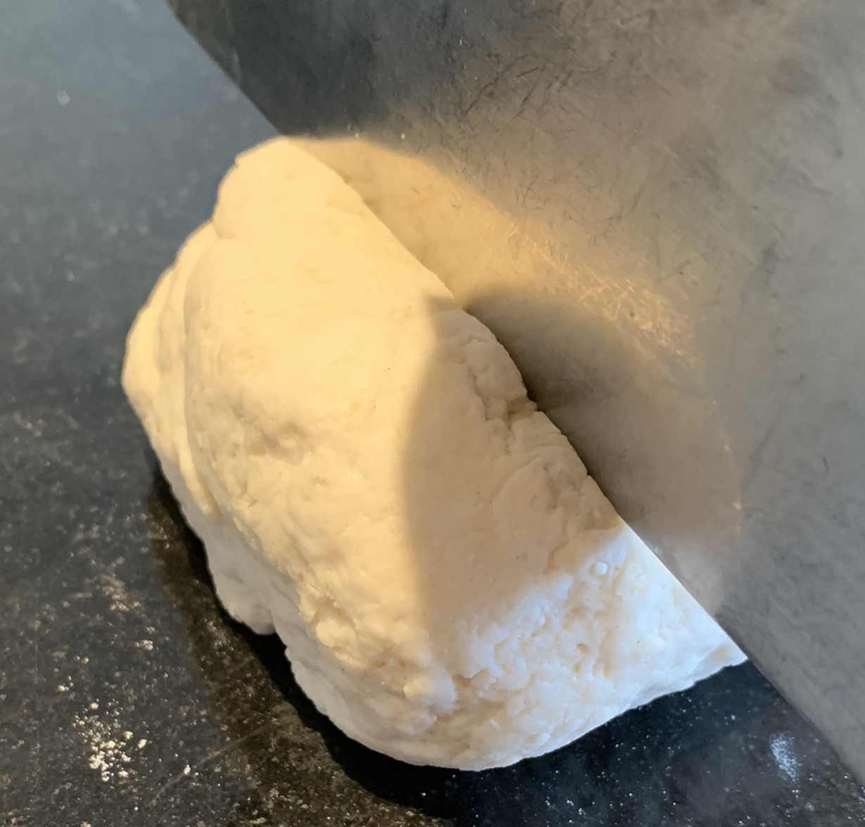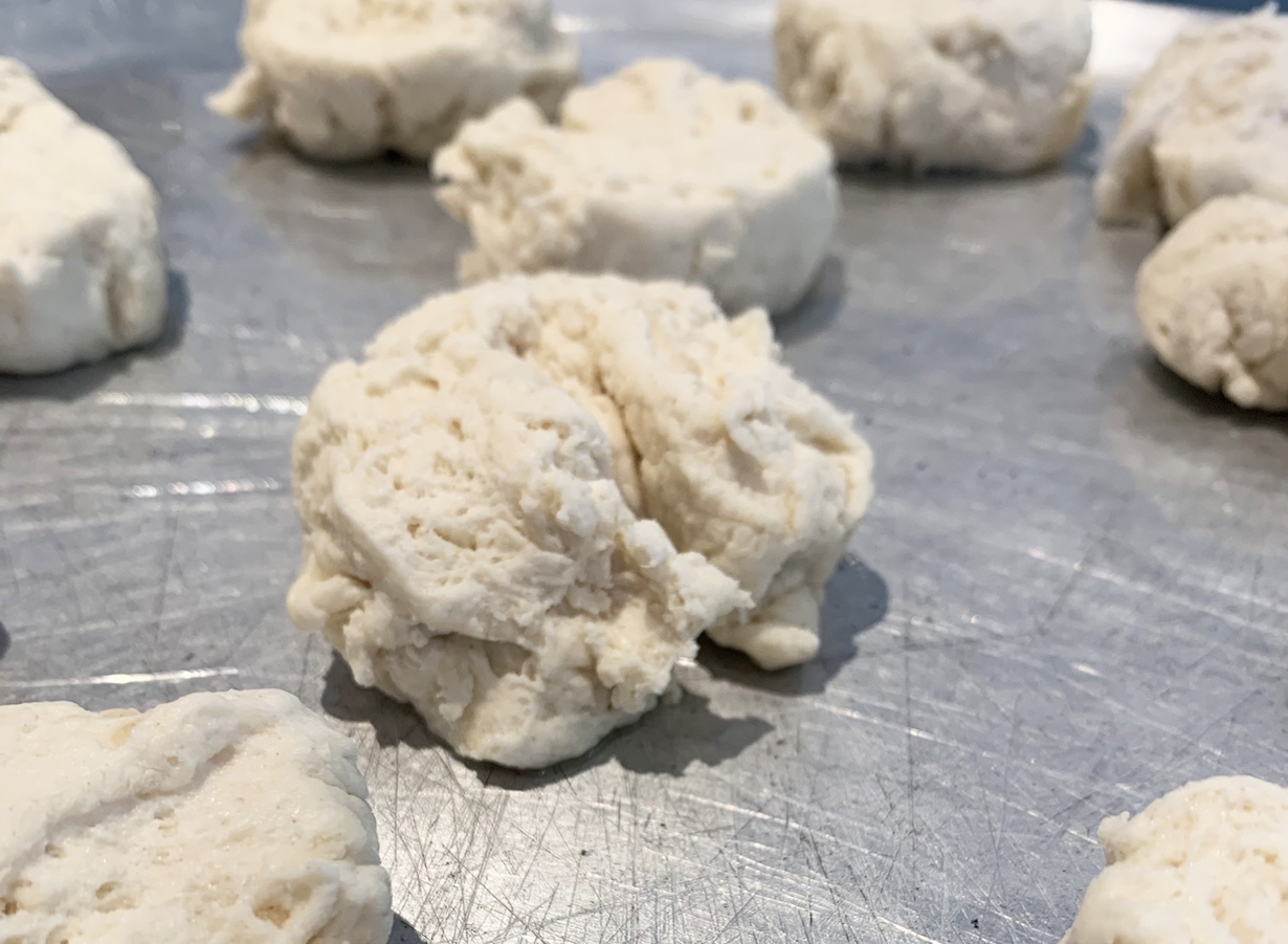 Transfer the mix to a lightly floured surface and knead by hand no more than six times. Roll into a log and cut into 1/2” rounds. Alternatively, roll out dough to a 1/2” thickness and cut with cookie cutters.