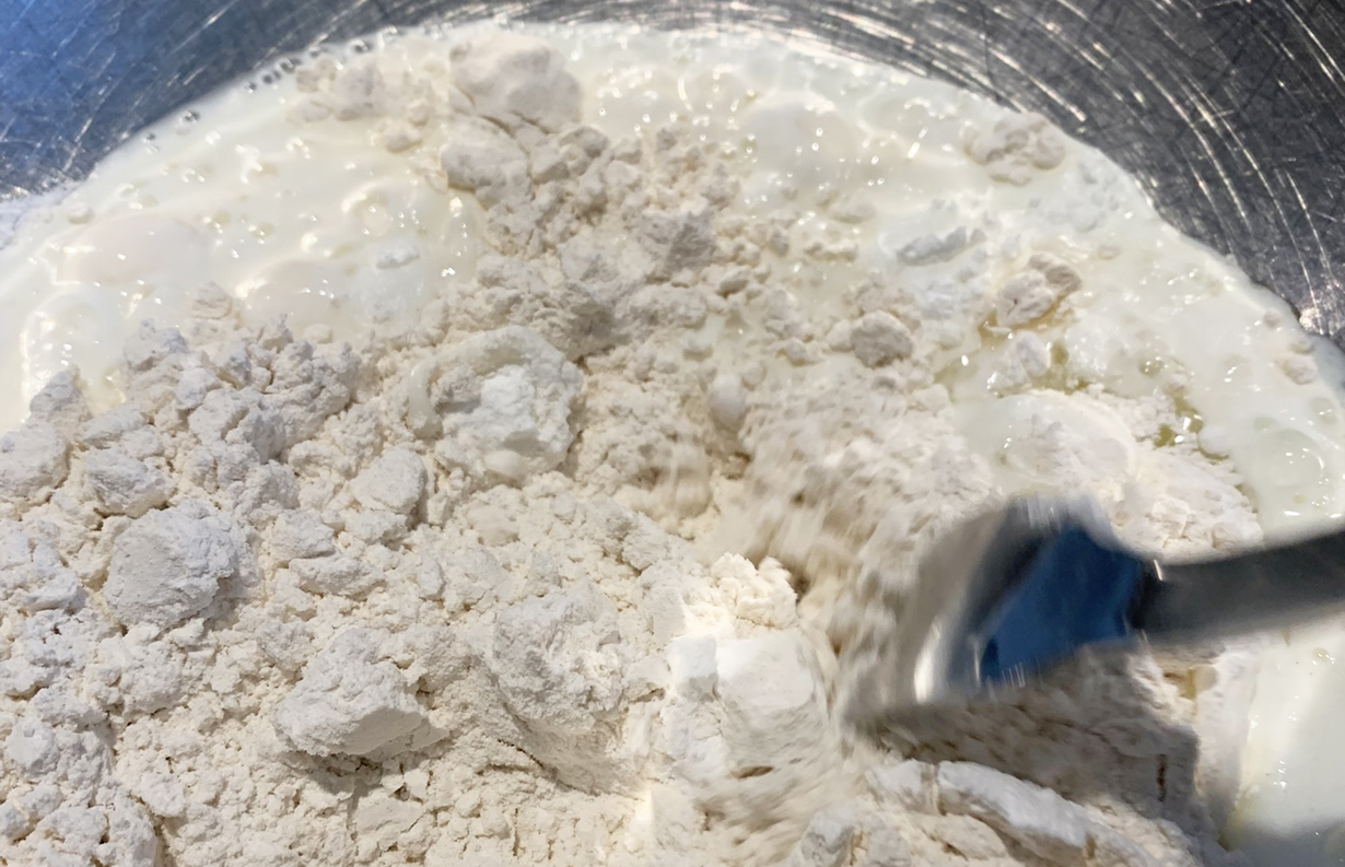 Preheat your oven to 450°F and grease the bottom of an 8” pan with oil. Mix all the ingredients together with a fork in a large bowl until just combined.