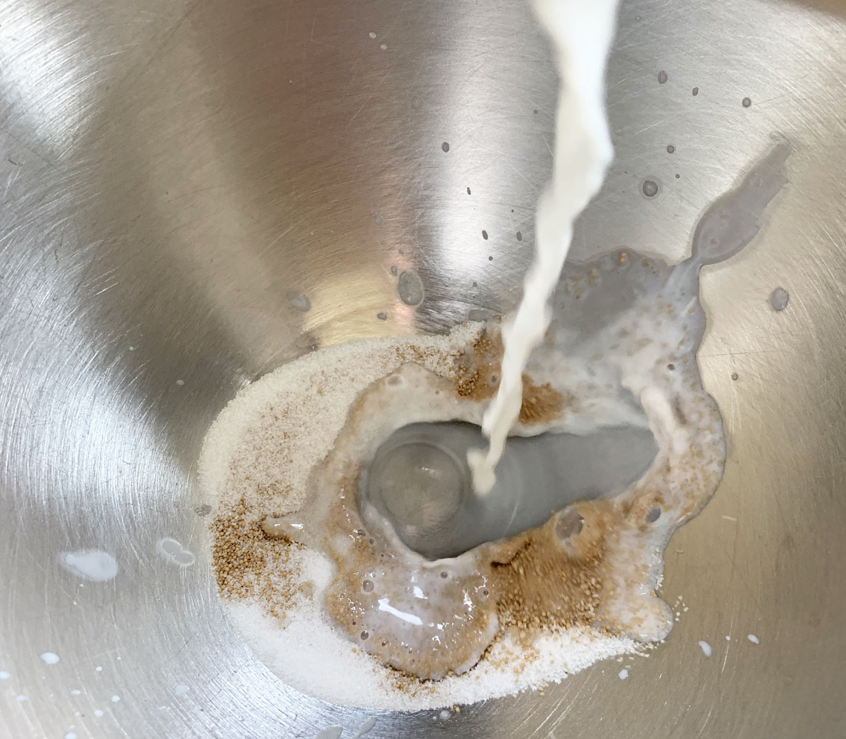 Place yeast and 2 tablespoons of sugar in the mixing bowl. Heat the milk and pour over the yeast mixture. Let rest for 10 minutes. In the meantime, mix together the egg, egg yolk and remaining sugar until light and frothy. Add to the yeast mixture and combine well.