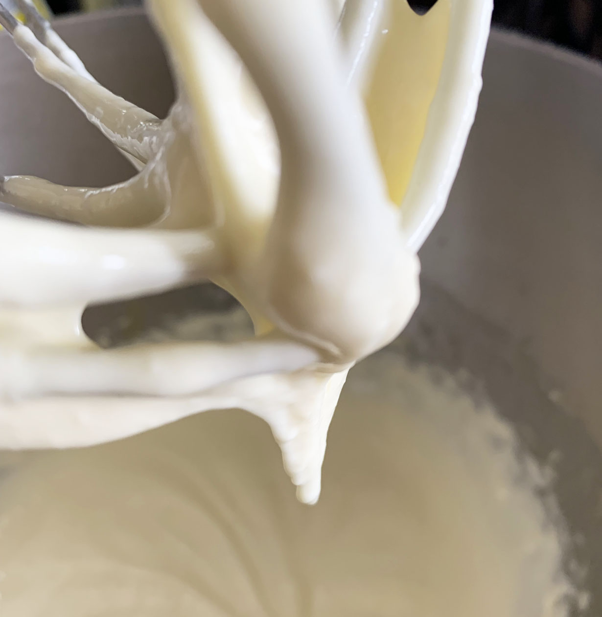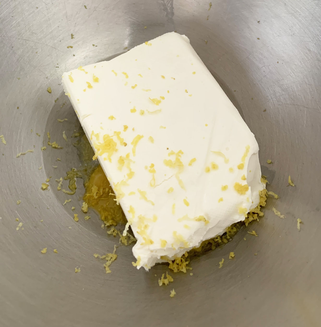 While the dough is resting, prepare the cream cheese filling by mixing together the cream cheese, egg yolk, sugar, sour cream and lemon zest. Beat on low speed until smooth. Set aside. Prepare the egg wash by lightly beating together the egg and cream. Set aside. Prepare the glaze by mixing together sugar and cream until smooth. Transfer to a piping bag and set aside.