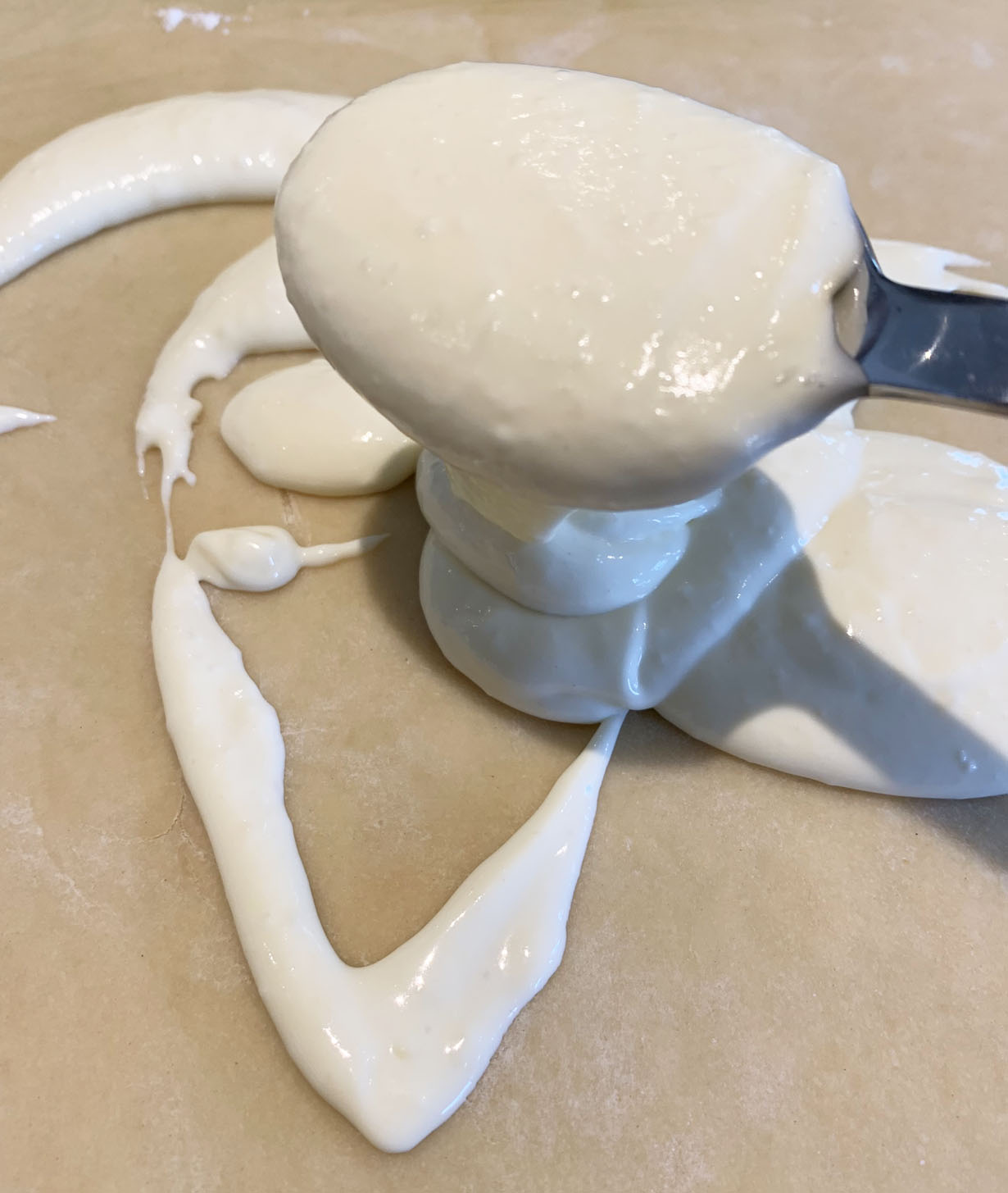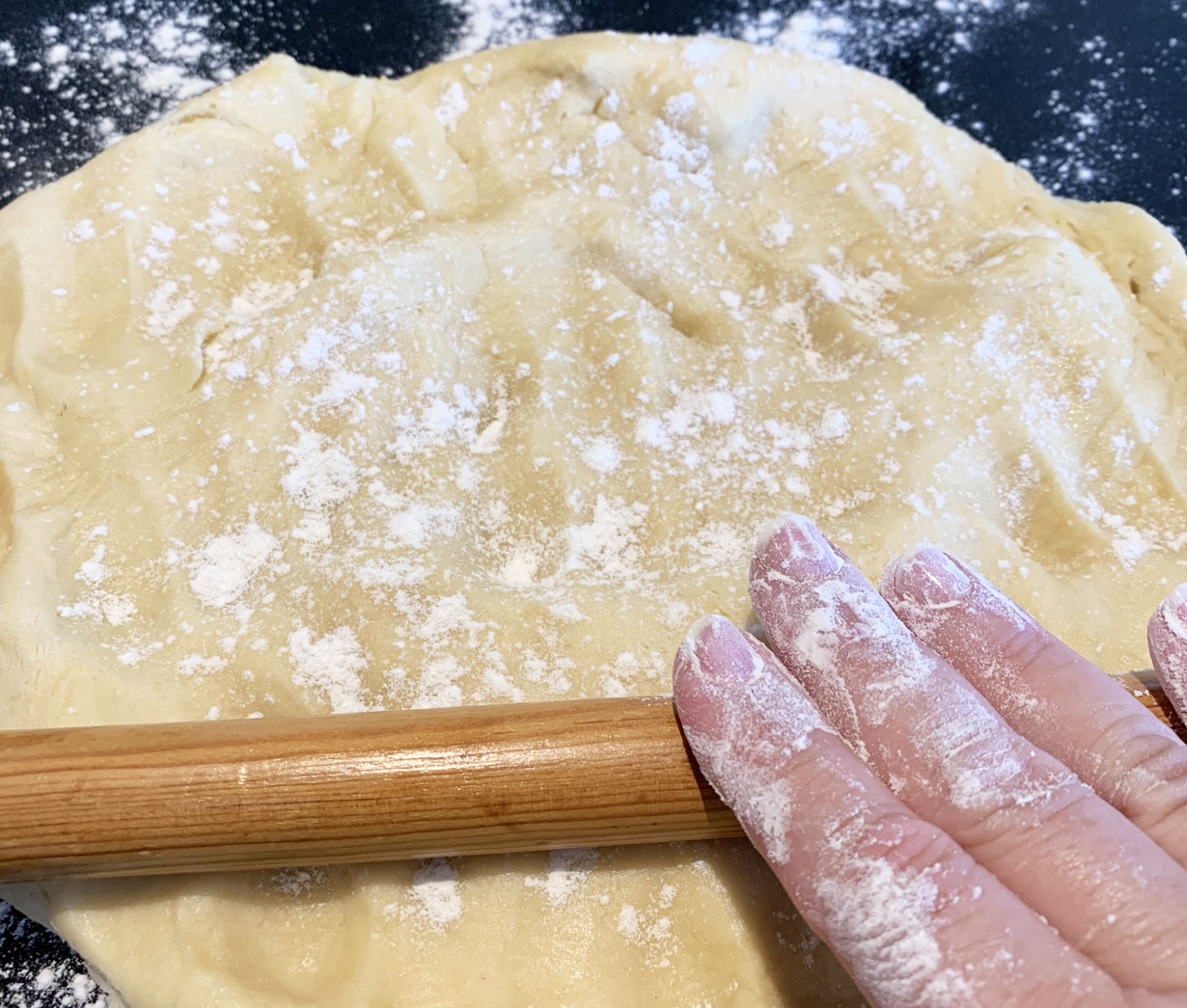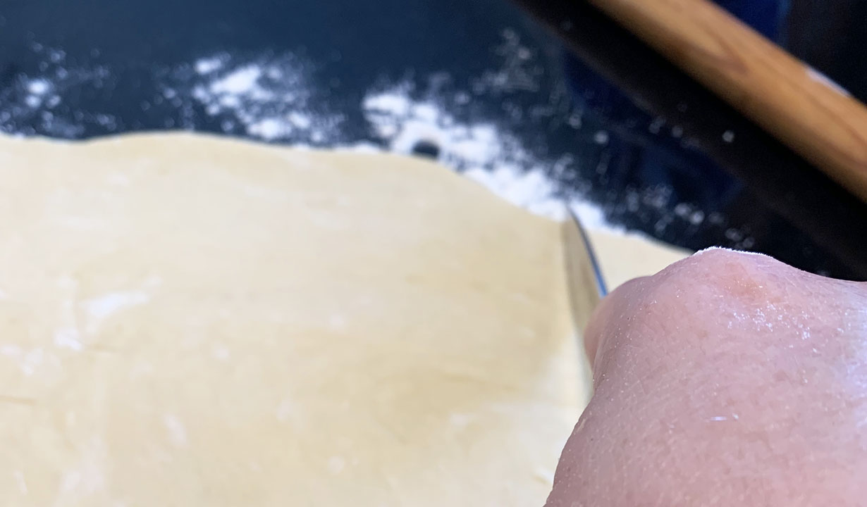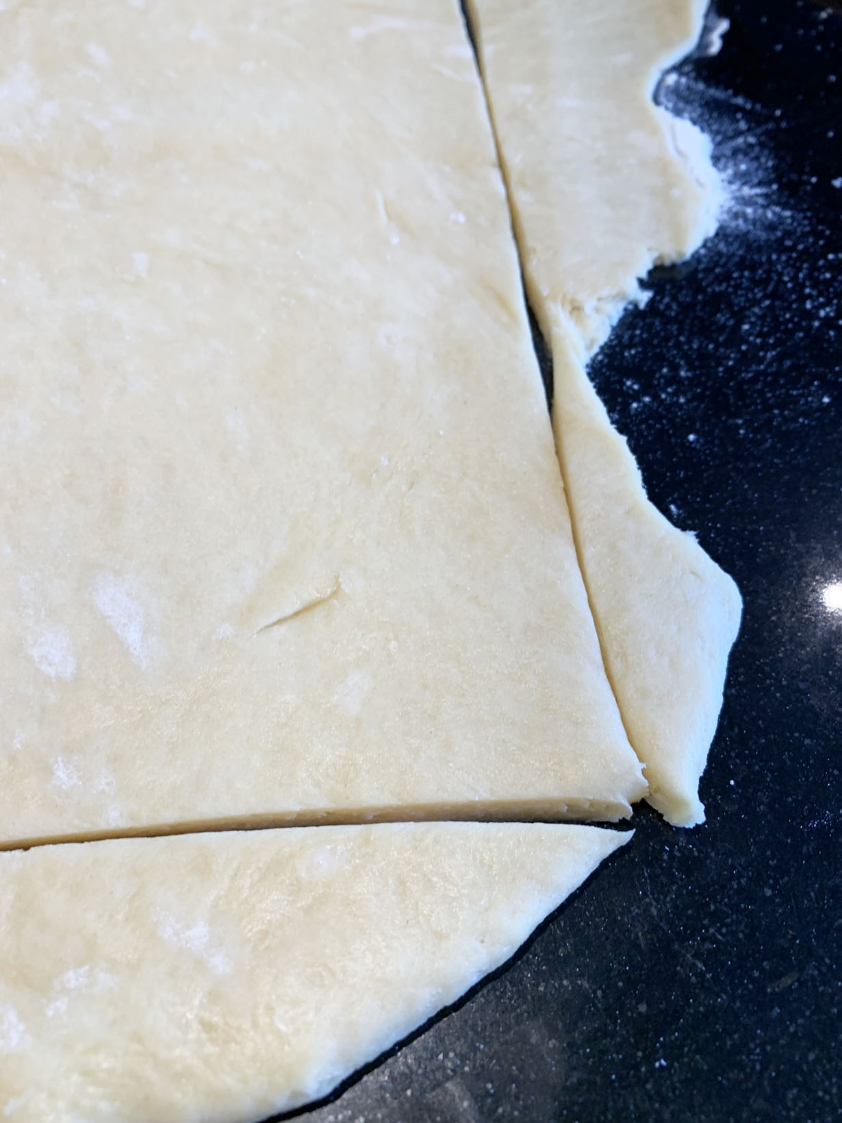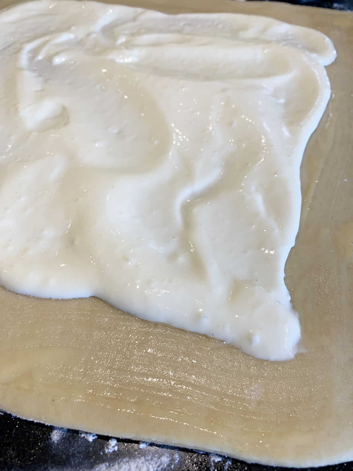 After the dough has rested, remove from the bowl and place on a lightly floured surface. Punch it down and dust the top with flour. Roll out the dough and cut the edges to create an even 12” square (these edges will be rolled out again to make a smaller strudel). Brush the edges with the egg wash and spread the cream cheese filling over the dough. Do not worry about going close to the edge as the filling extends when you roll the strudel. Using a tablespoon, drop dollops of the sour cherry preserve over the cream cheese.