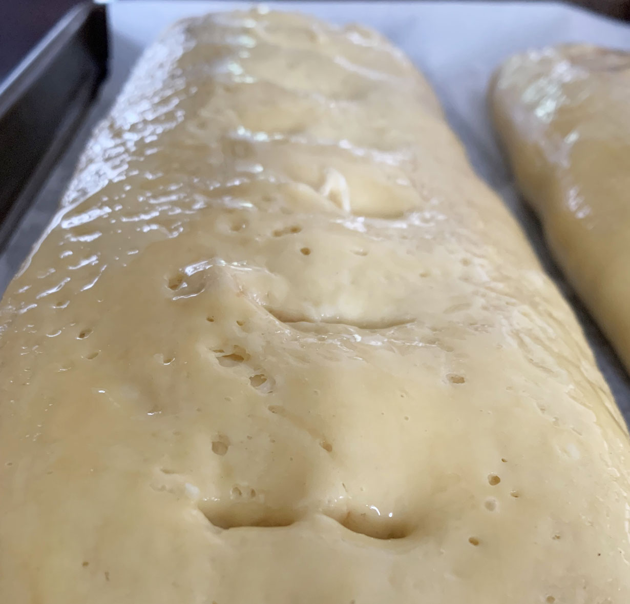 Roll the strudel loosely and pinch the edges. Brush the entire surface with egg wash and cover with plastic wrap. Let it stand in a warm place until it has doubled in size (1/2 hour to 2 hours). Preheat the oven to 350°F. When the strudel has risen, remove the plastic wrap and cut slits into the top. Bake for 55 minutes, covering the top with silver foil once it has become golden brown. Reduce heat to 325°F and cook for 15 minutes more. Transfer to a wire rack to cool and drizzle with glaze. Makes one 12” strudel and one 8” strudel.