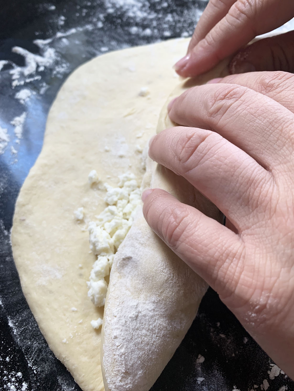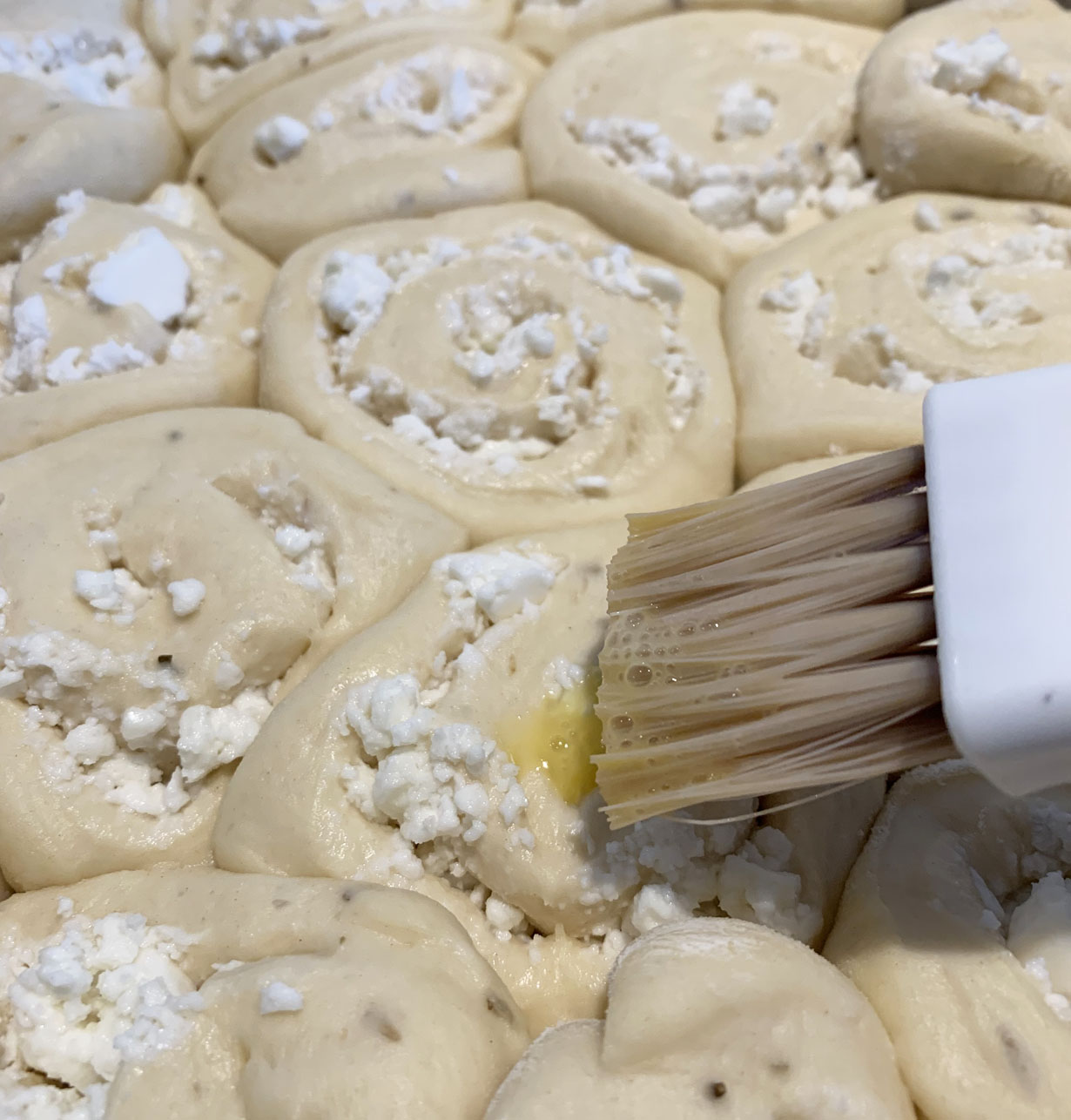 Dust your working surface with flour. Divide the dough in half and, using a rolling pin, roll out to a 1/4” thickness. Place crumbled feta on the surface leaving a small border. Starting at the end closest to you, roll the dough. Once rolled, use your hands and slightly press it together to help push the feta into the dough. Use a pastry cutter and cut into eight 1” thick pieces. Turn with cut side up into a greased baking dish (you can also use parchment paper to line the baking dish). Leave a bit of space between the rolls as when the dough rises for the second time, the spaces will fill up.