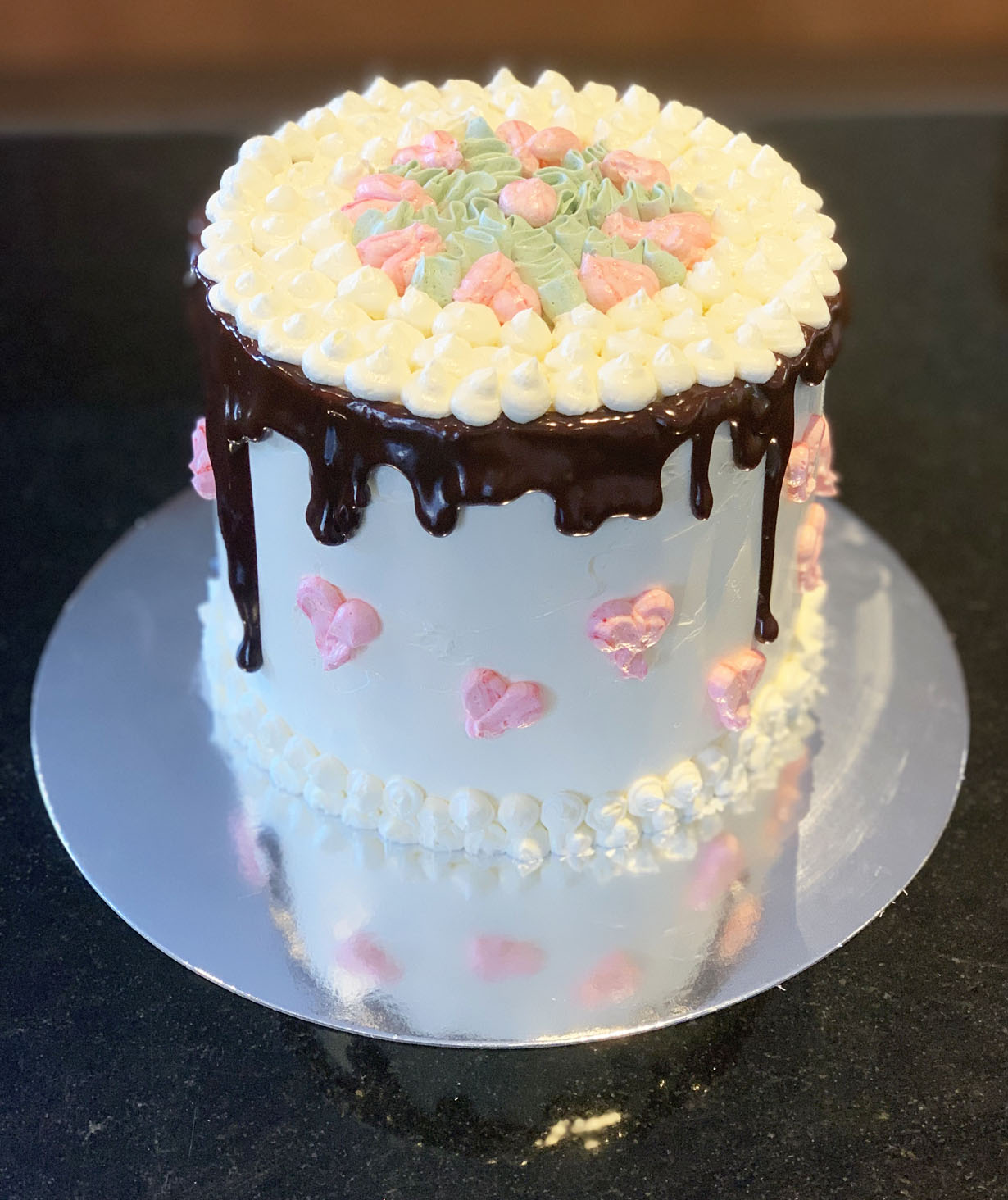 Prepare the chocolate drip by melting the semi-sweet chocolate chips with the cream in a metal bowl over simmering water. Mix until smooth and creamy. Set aside to cool. Once cool, transfer to a piping bag or use a spoon to drop onto the cake edge. Note: If the ganache is too thick, add additional cream 1 teaspoon at a time.