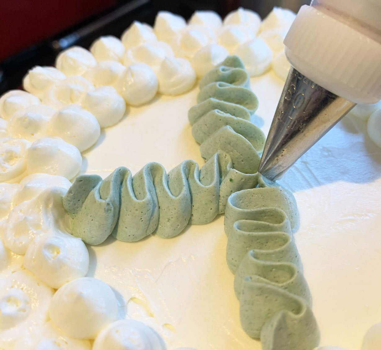 Your decorations will be dependent on the tip used. For the sample shown, the green was made with petal decorating tip (ruffles created by going back and forth while piping) and the pink hearts with a round tip (created by pressing down at the top from one side, pulling down at an angle, and then repeating from the opposite direction to overlap at the end).