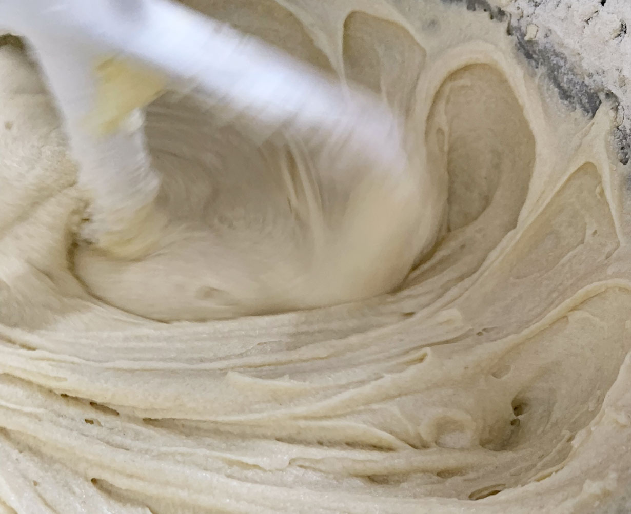 To make the batter, cream the butter and sugar on medium speed in a mixer fitted with a paddle attachment for 10 minutes. After 10 minutes, turn the mixer speed to low and add the eggs one at a time. Add the vanilla extract. Alternatively, add the flour mixture with the milk mixture into the batter. Mix until just combined.