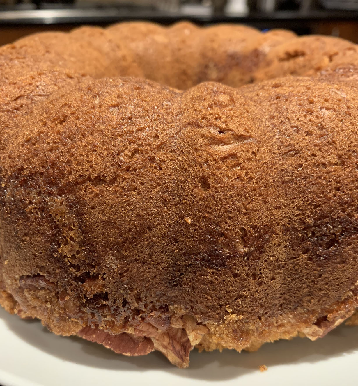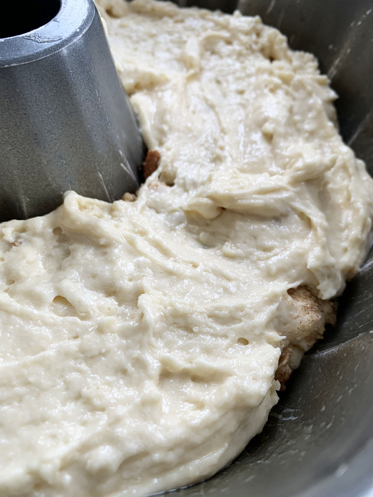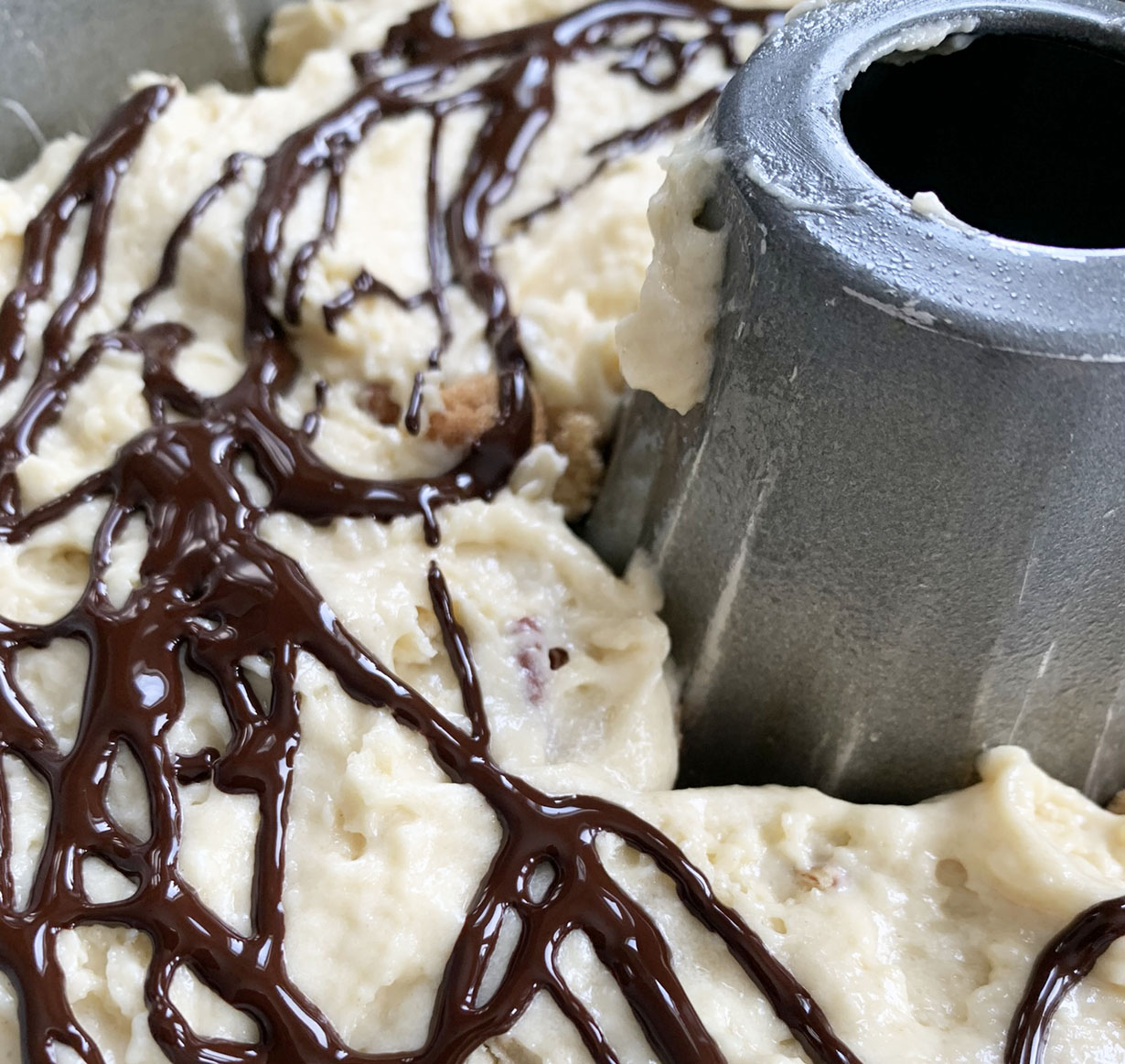 Preheat your oven to 350°F and spray a bundt or ring cake pan with non-stick spray. Melt the chocolate in the microwave in 10-second intervals and set it aside to cool (the amount of time needed to melt the chocolate will depend on the microwave). Stir the milk and vinegar together and set aside. Sift the flour, baking powder, baking soda, and salt and set aside. Prepare the crumble by mixing together the brown sugar, cinnamon, and pecans. Set the crumble aside.