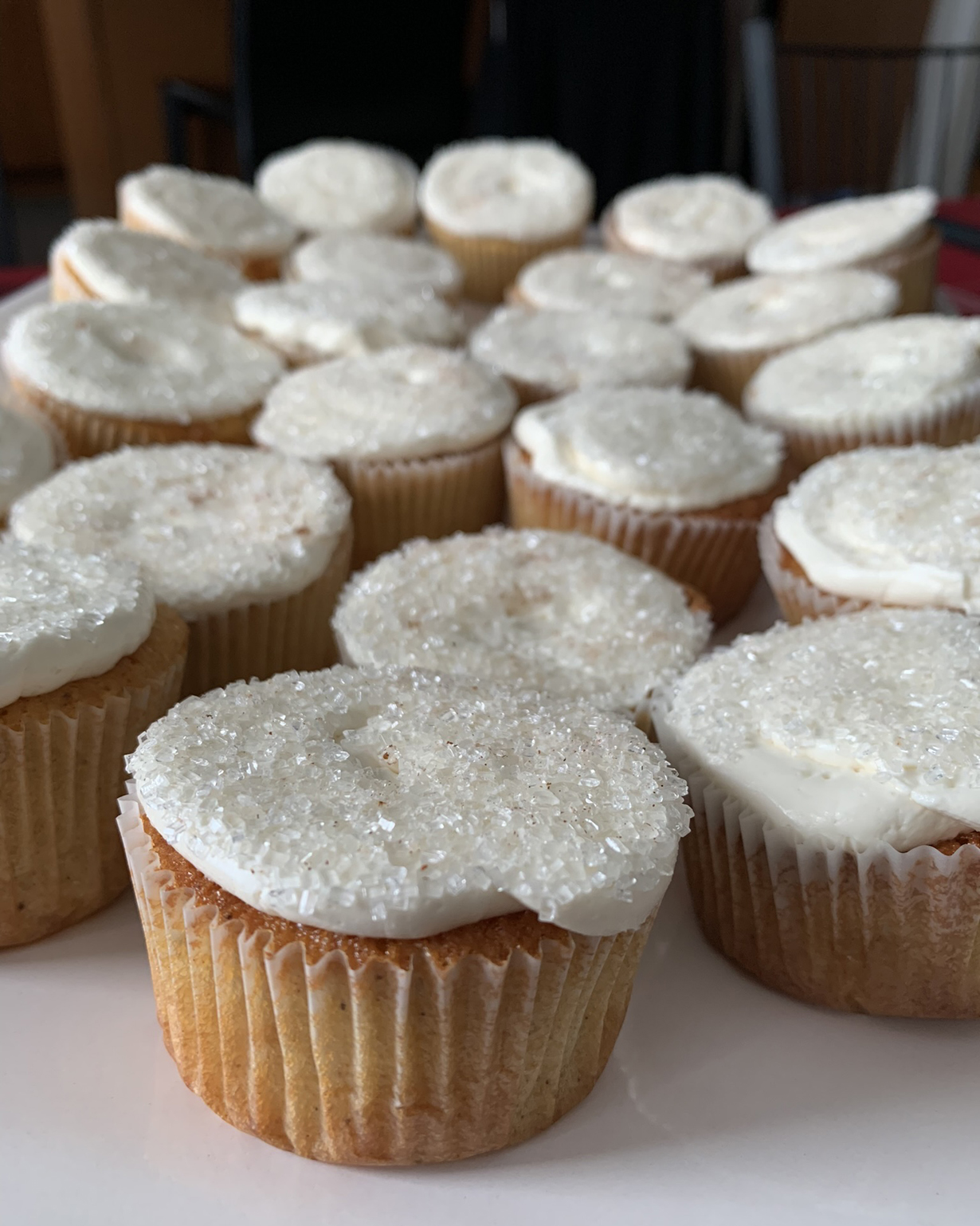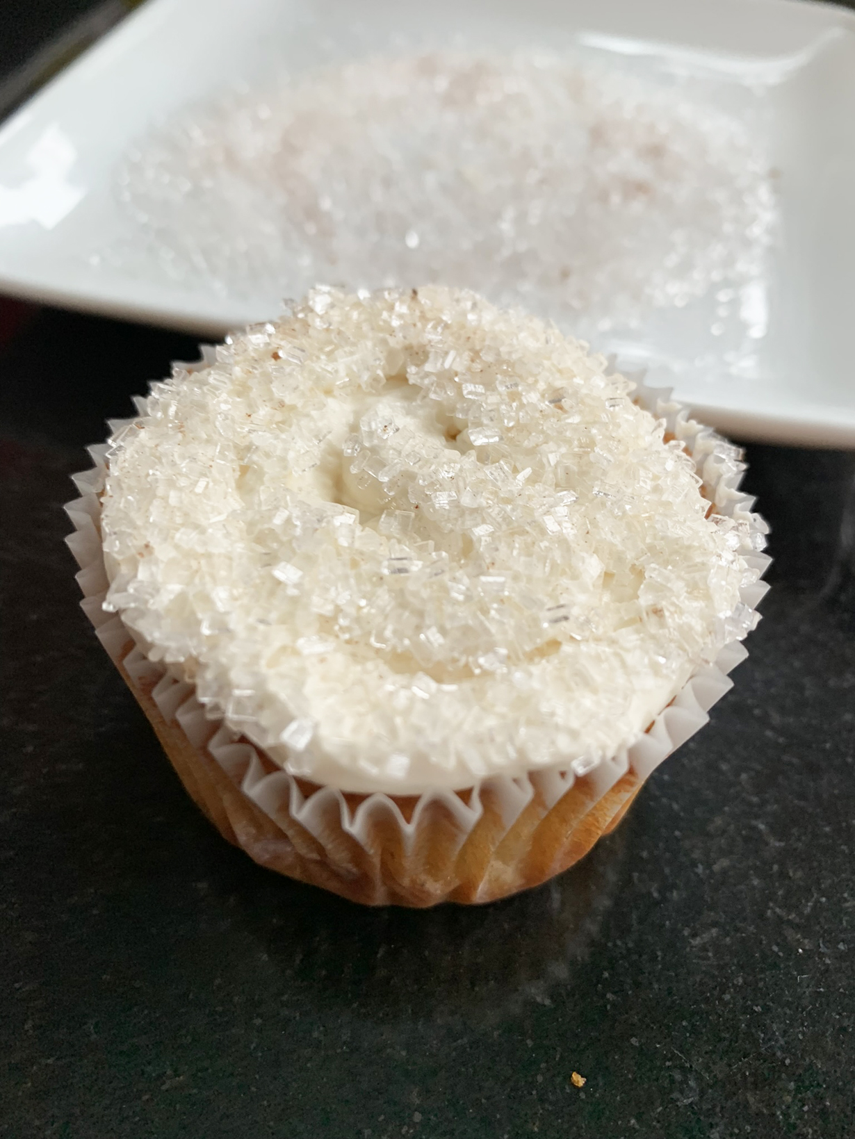 Cover the top of the cupcake with the frosting by creating a spiral pattern. Don’t worry about being exact. You will flatten the top, and any spaces will be filled. Mix together the sprinkles and the eggnog spice and pour onto a flat plate. Invert the cupcake onto the plate with the mixture to flatten the frosting and cover it with the sprinkles.