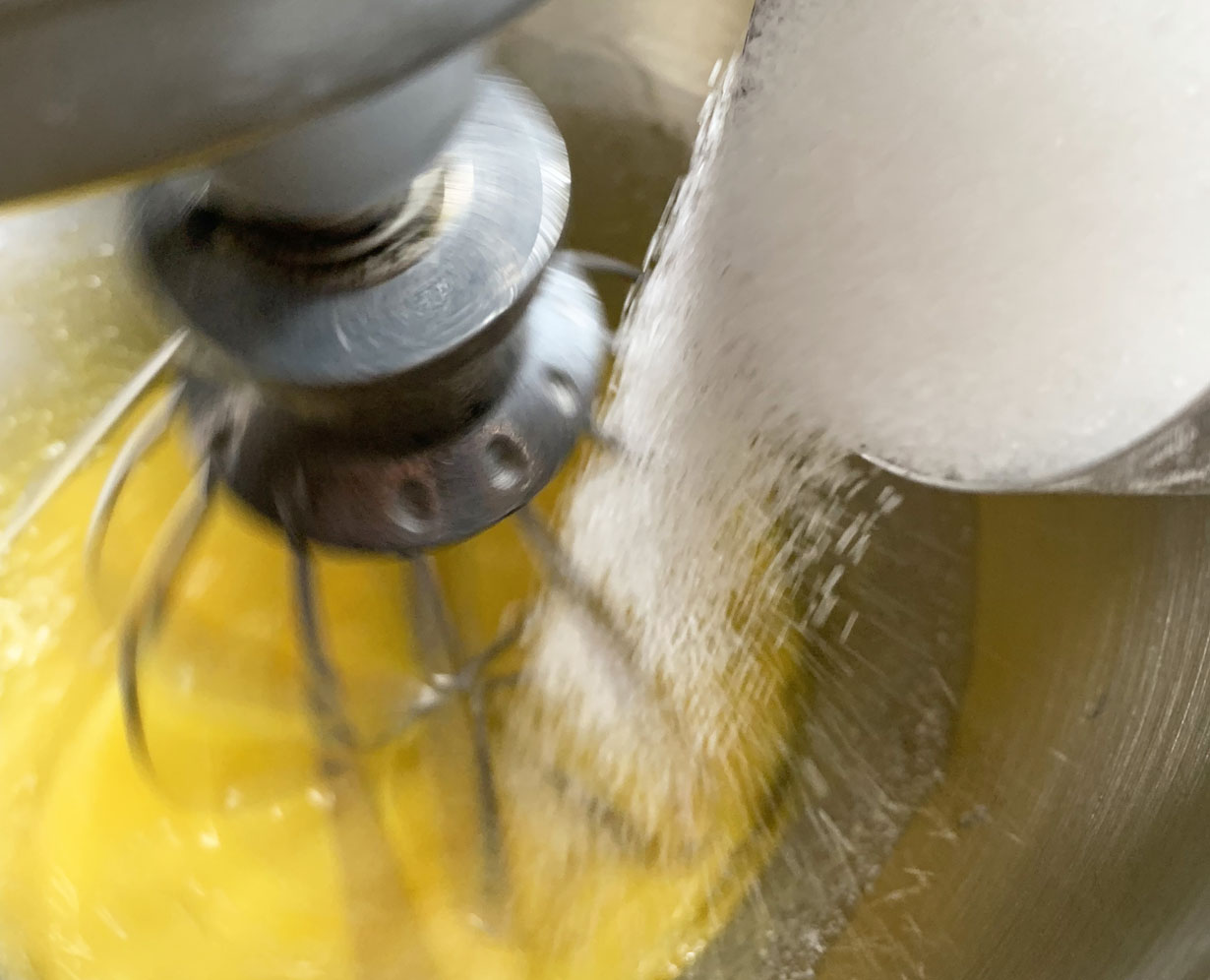 Sift the flour, baking soda, baking powder, and salt in a bowl. Mix until the ingredients are evenly distributed. Set aside. In a mixing bowl, mix the eggs, sugar, and vanilla until doubled in size. Add the butter, lemon emulsion (a more condensed extract), lemon juice, and the oil and blend thoroughly. Make a well in the dry ingredients and pour in the wet ingredients. Fold until just combined.
