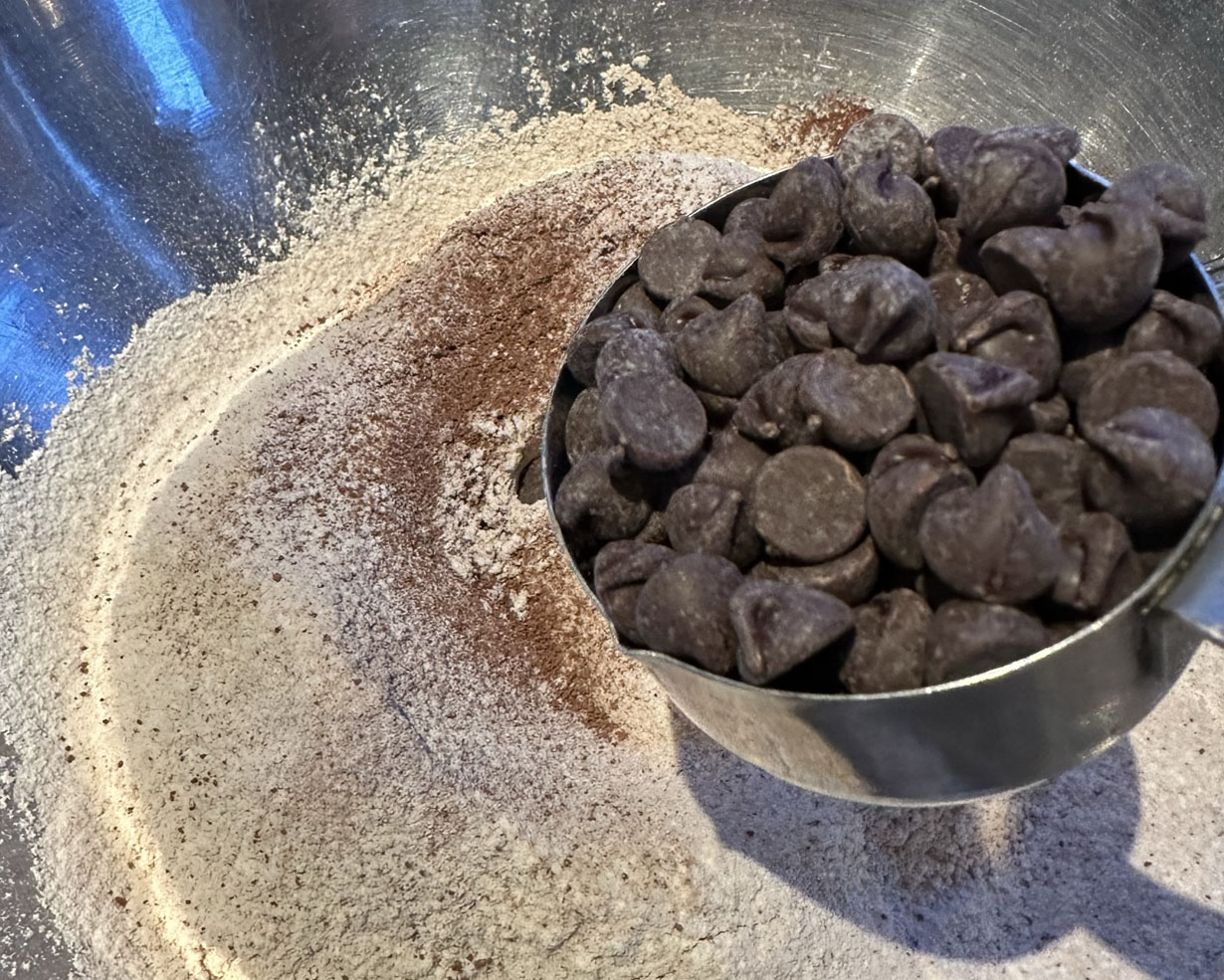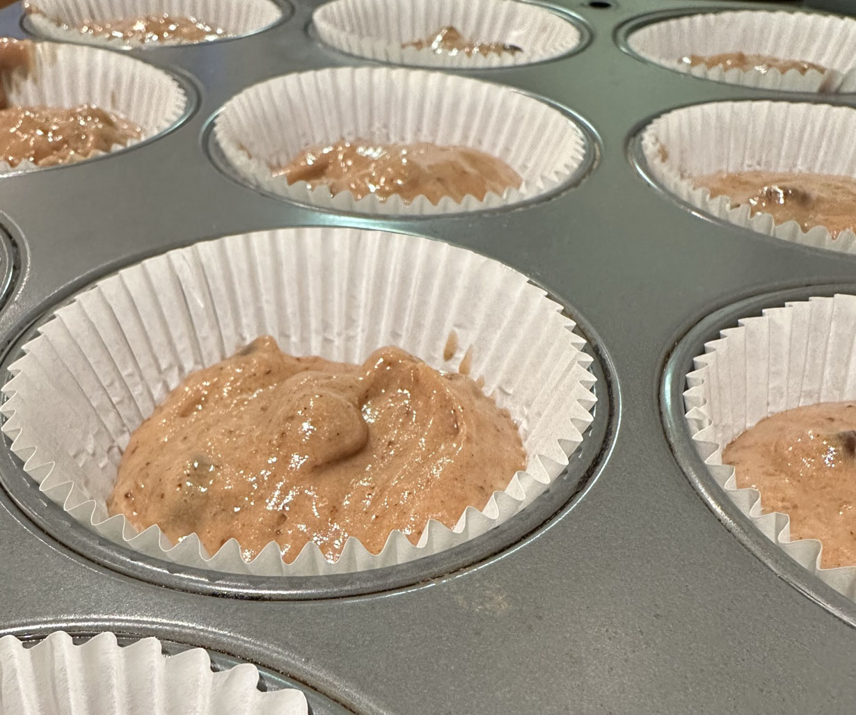 Preheat your oven to 350°F. Line a muffin tin and set aside. Sift the flour, cocoa, baking powder, baking soda, salt, allspice, cayenne, and cinnamon into a large bowl. Stir in the chocolate chips. Make a well in the center of the dry ingredients to hold your wet ingredients.