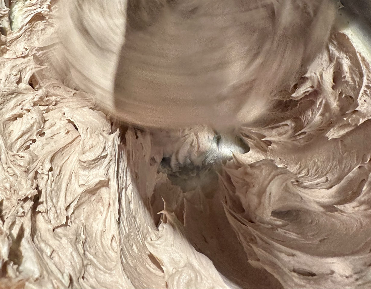 While the cupcakes are cooling, prepare the cream cheese frosting by whipping the butter and cream cheese together until fluffy with a hand mixer. Add in the icing sugar, melted chocolate, pinch of salt, vanilla extract, and whipping cream. Continue to beat until it is well combined. The frosting will double in size. Transfer into a piping bag fitted with a star attachment.