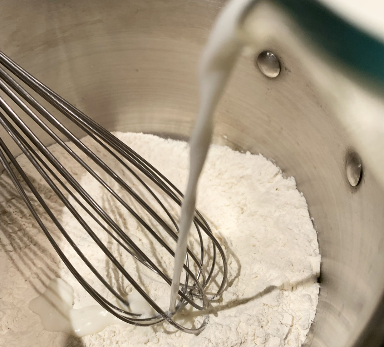 Next, preheat your oven to 350°F and spray and line three round 8” pans with parchment paper. Sift together the flour, cornstarch, sugar, salt, baking powder, and baking soda. Set aside. In a measuring cup, mix together the milk and vinegar and set aside for 10 minutes. After 10 minutes, add the egg whites and vanilla and mix together thoroughly.