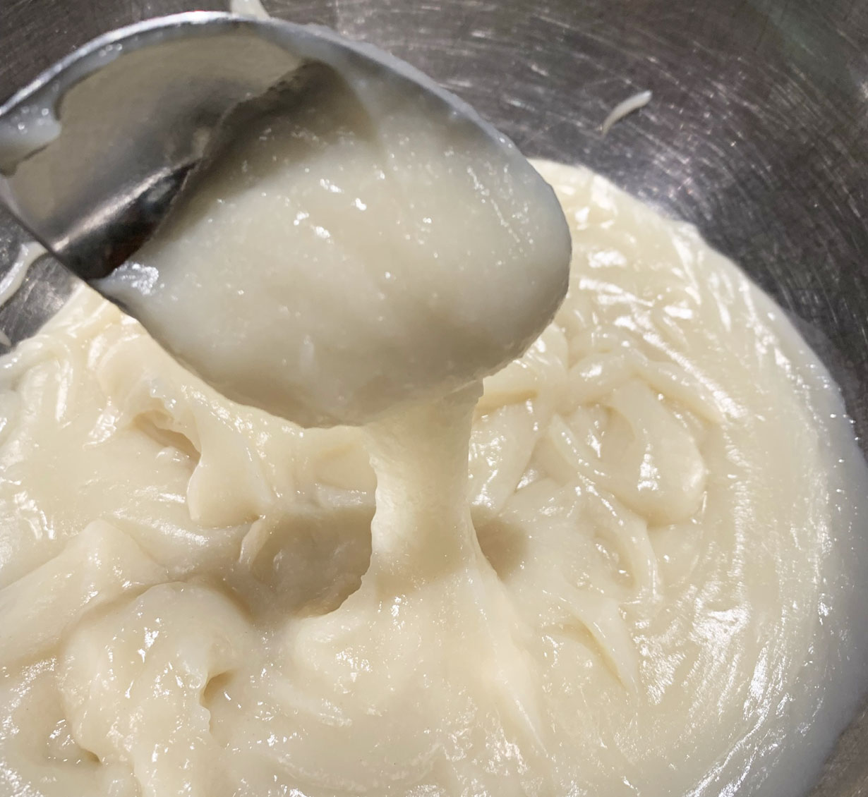 Prepare your frosting first as it needs time to cool. Whisk together the flour and the sugar in a medium saucepan and toast on low heat for one minute. Add the milk slowly until well blended. Return the flour-milk mixture to medium-high heat and bring to a simmer (approximately 1 minute). Whisk it continuously and keep an eye on it. The flour content makes the mixture thicken quite quickly. If your mixture has lumps, press it through a sieve into a bowl. Cover the mixture with plastic wrap resting right on the surface to prevent skin from forming. Allow it to cool completely. (You can also put it in the freezer on a flat tray for 30 minutes to cool faster).