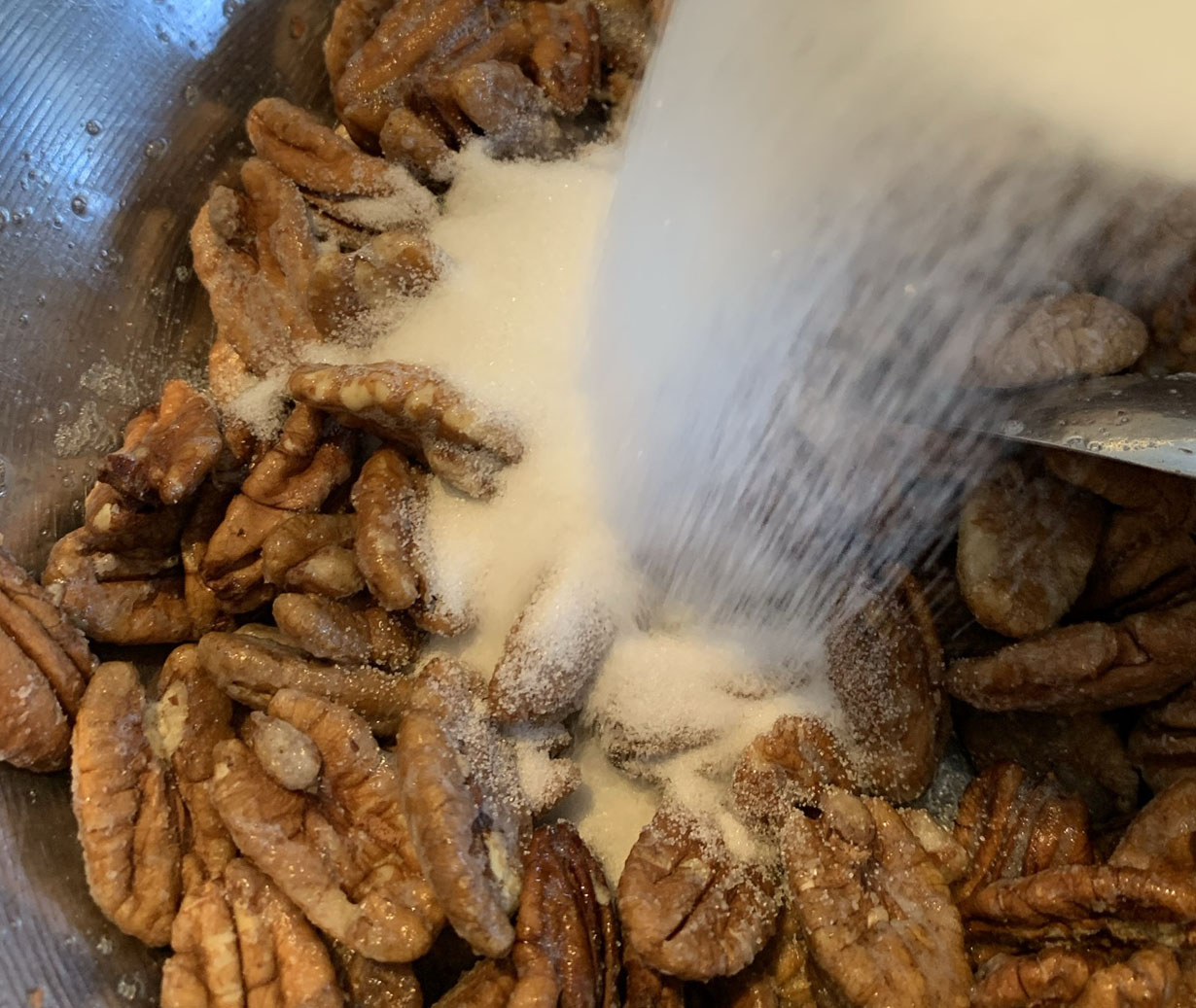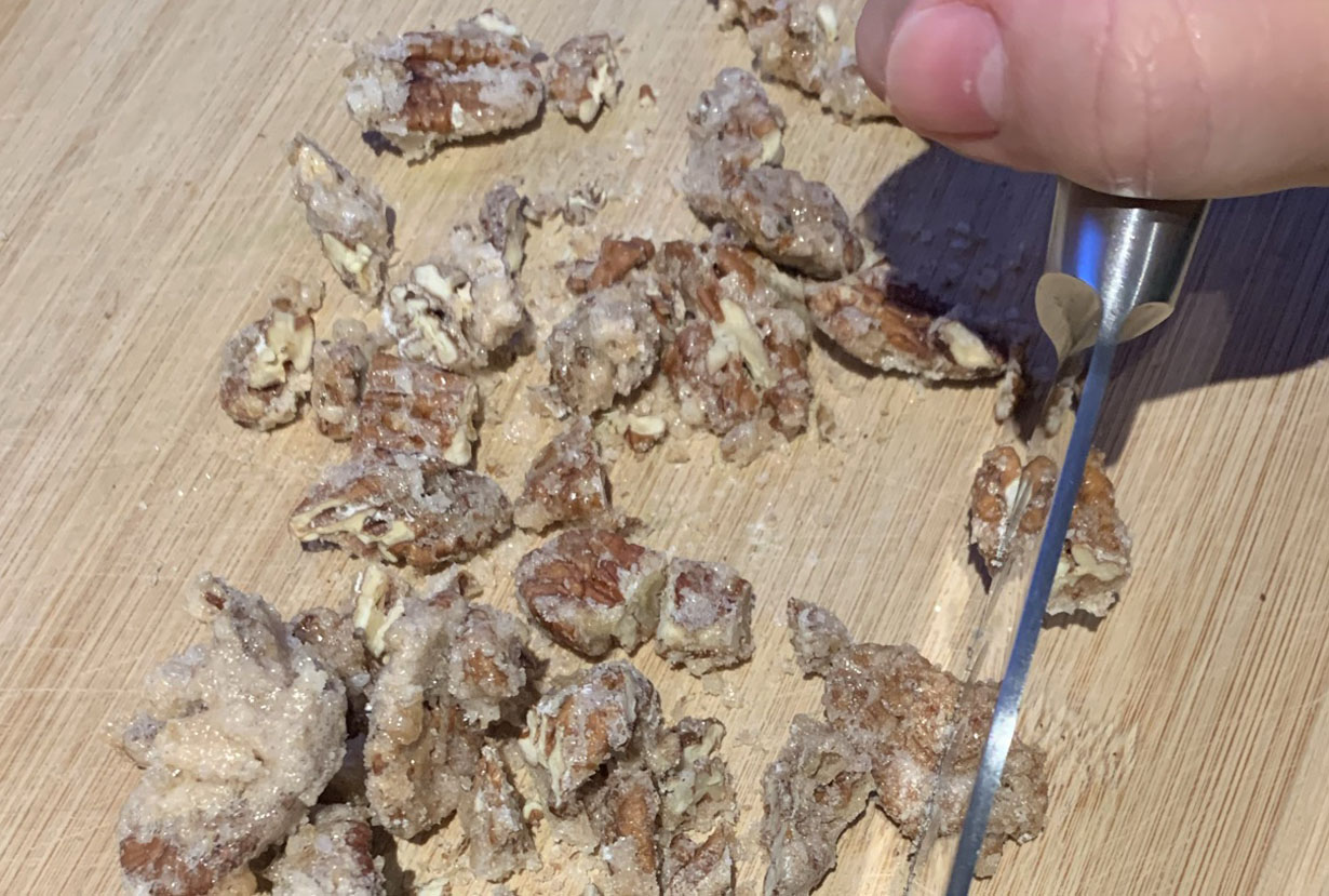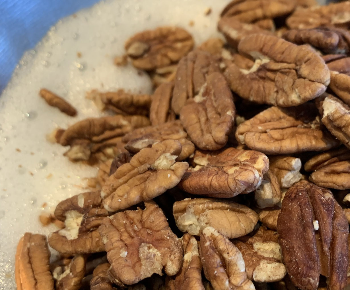 While the cake is cooling, prepare your candied pecan filling (note: you will have more candied pecans than what you need for the cake, but they can be served and eaten on their own). Start by lowering your oven temperature to 250°F. To prepare the candied pecans, whip the egg white until frothy. Toss the pecans into the egg white, coating them completely. Add the water, sugar, and ground cinnamon and toss. Spread onto a baking sheet lined with parchment paper or a silicone mat and sprinkle with the Kosher salt. Bake for 1 hour. Remove from the heat and cool completely. Roughly chop up one cup of the candied pecans for the cake (and enjoy the rest).