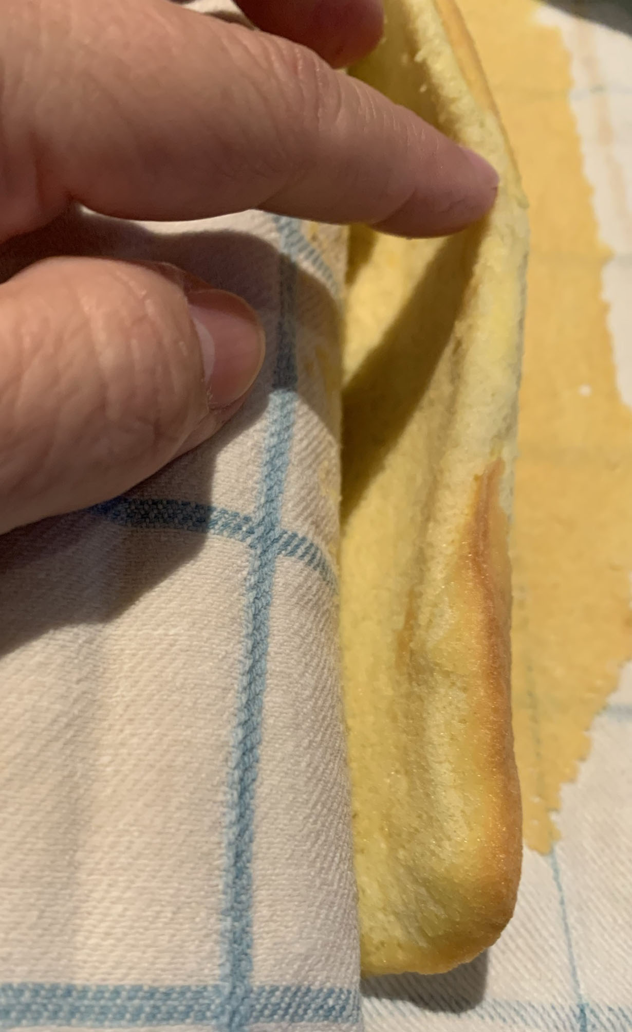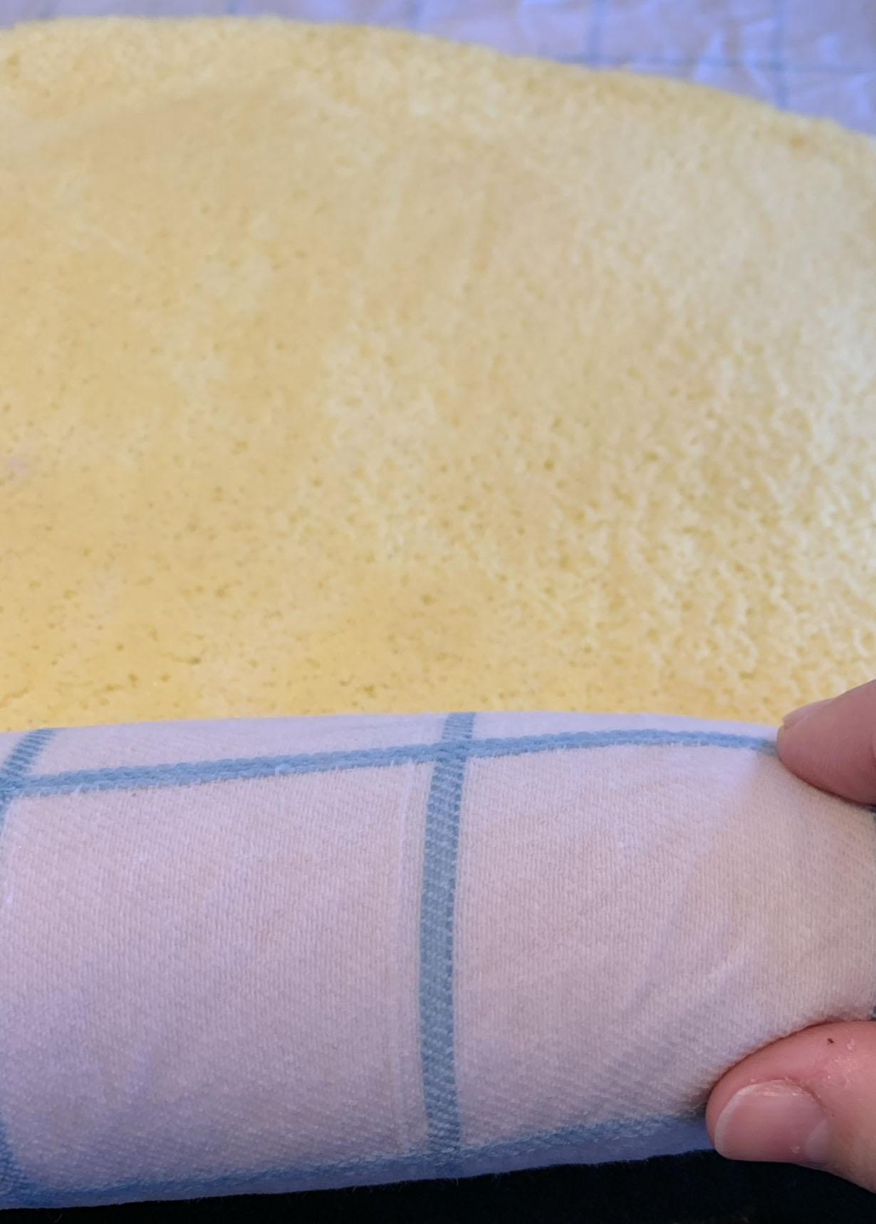 To make your roll, dampen a tea towel with water (note: the tea towel must be wider than the genoise). Sprinkle damp towel with sugar. Flip your cake onto the tea towel and slowly peel back the parchment paper. Fold the bottom edge of the towel over the cake and start to roll the edge tightly using the towel. When it is completely rolled, close the edges and allow the wrapped cake to cool completely on a wire rack.