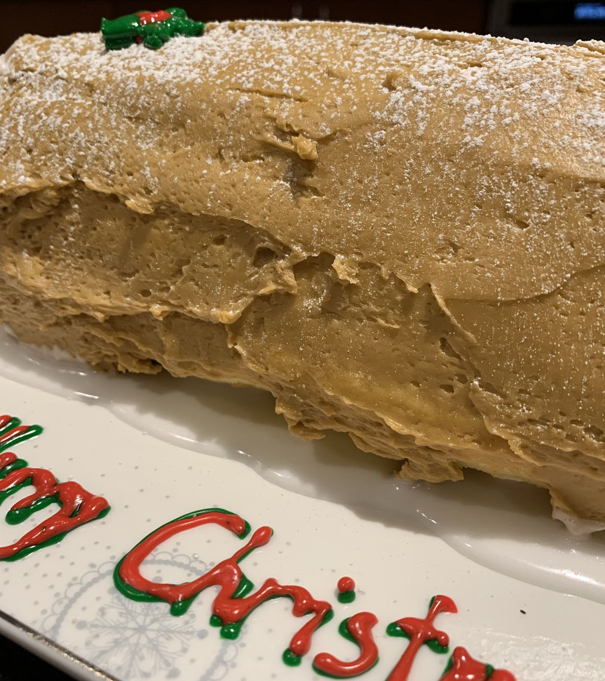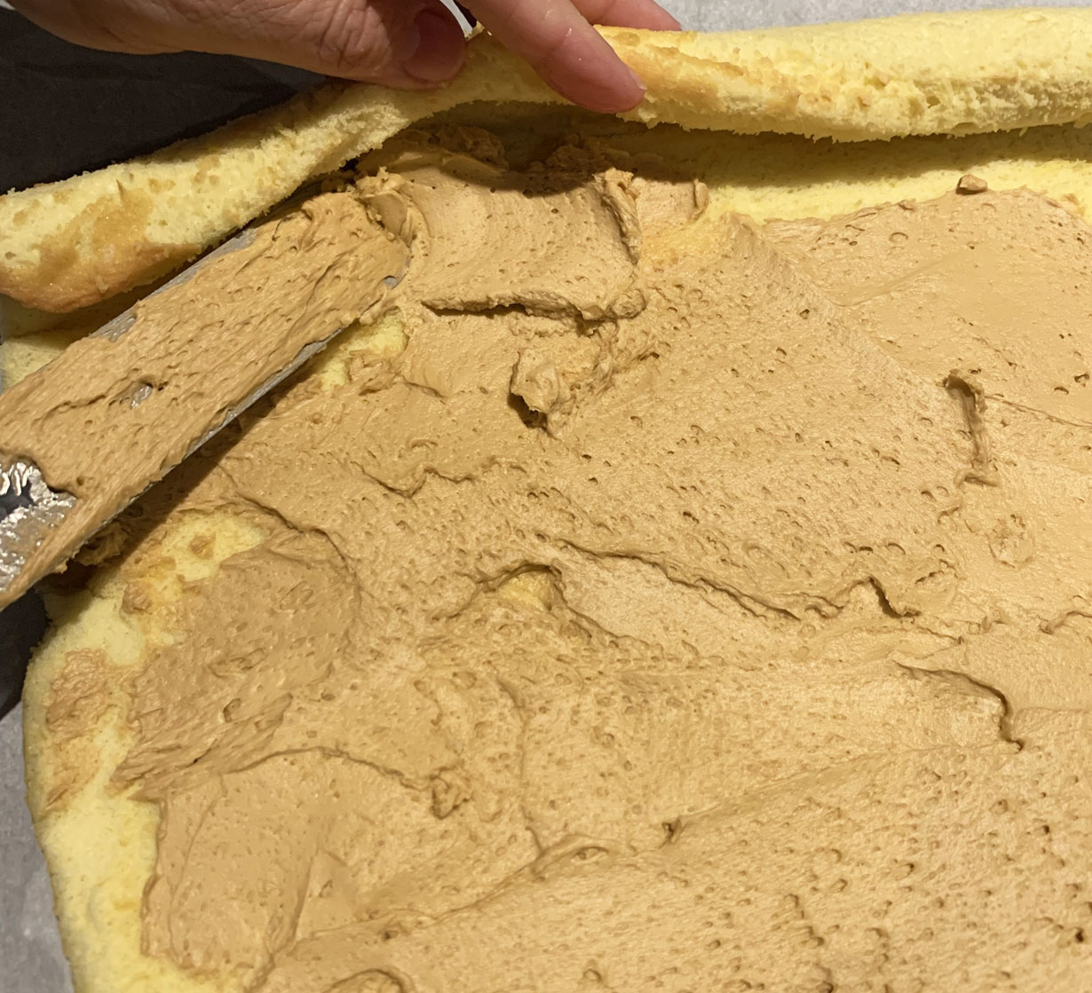 To frost your cake, unroll from the tea towel slowly, taking care not to break the cake. Your cake will have retained the spiral shape. Using your hands to hold the edges open, frost the inside of the cake with the mascarpone buttercream. Sprinkle the candied pecans on top of the buttercream and roll up the cake off the tea towel as tightly as possible to create the log. Transfer the rolled cake to your serving platter.