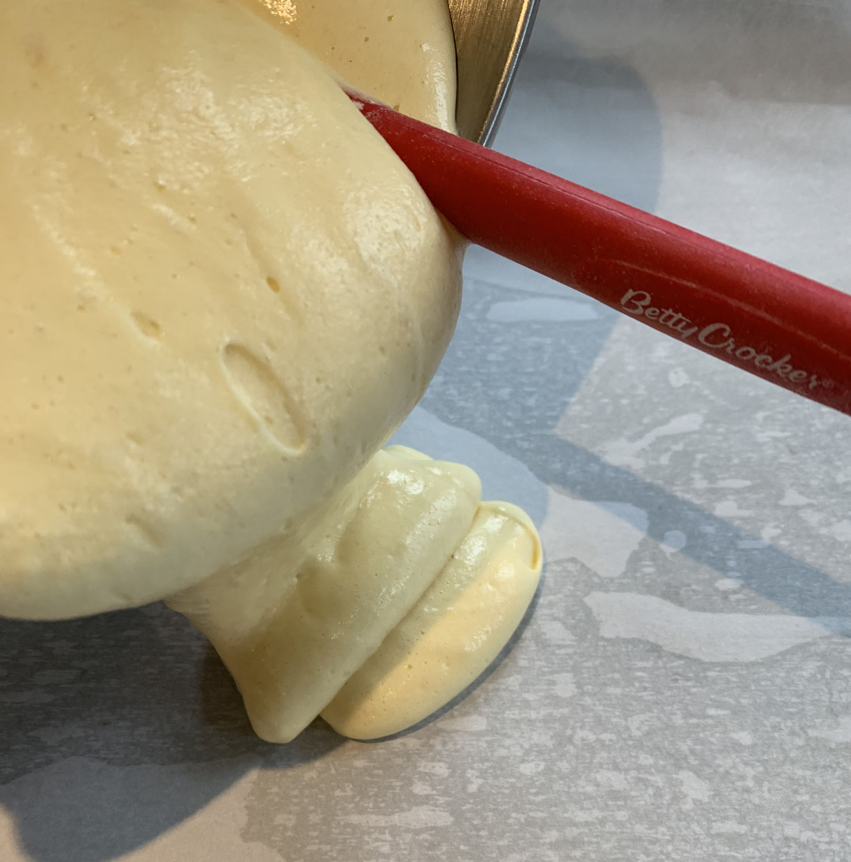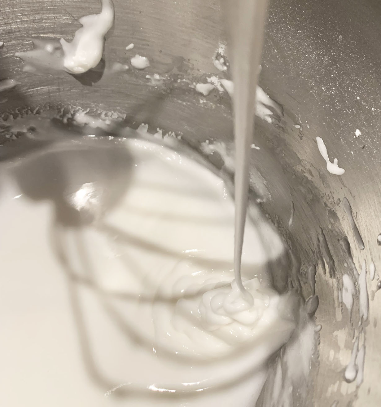 Preheat your oven to 350°F and line a cookie sheet with parchment paper. Separate the egg whites and yolks. In a stand mixer fitted with a whisk attachment, beat the egg whites until frothy and slowly add in the sugar. Add the yolks one at a time. Continue to beat the eggs for 10 minutes.