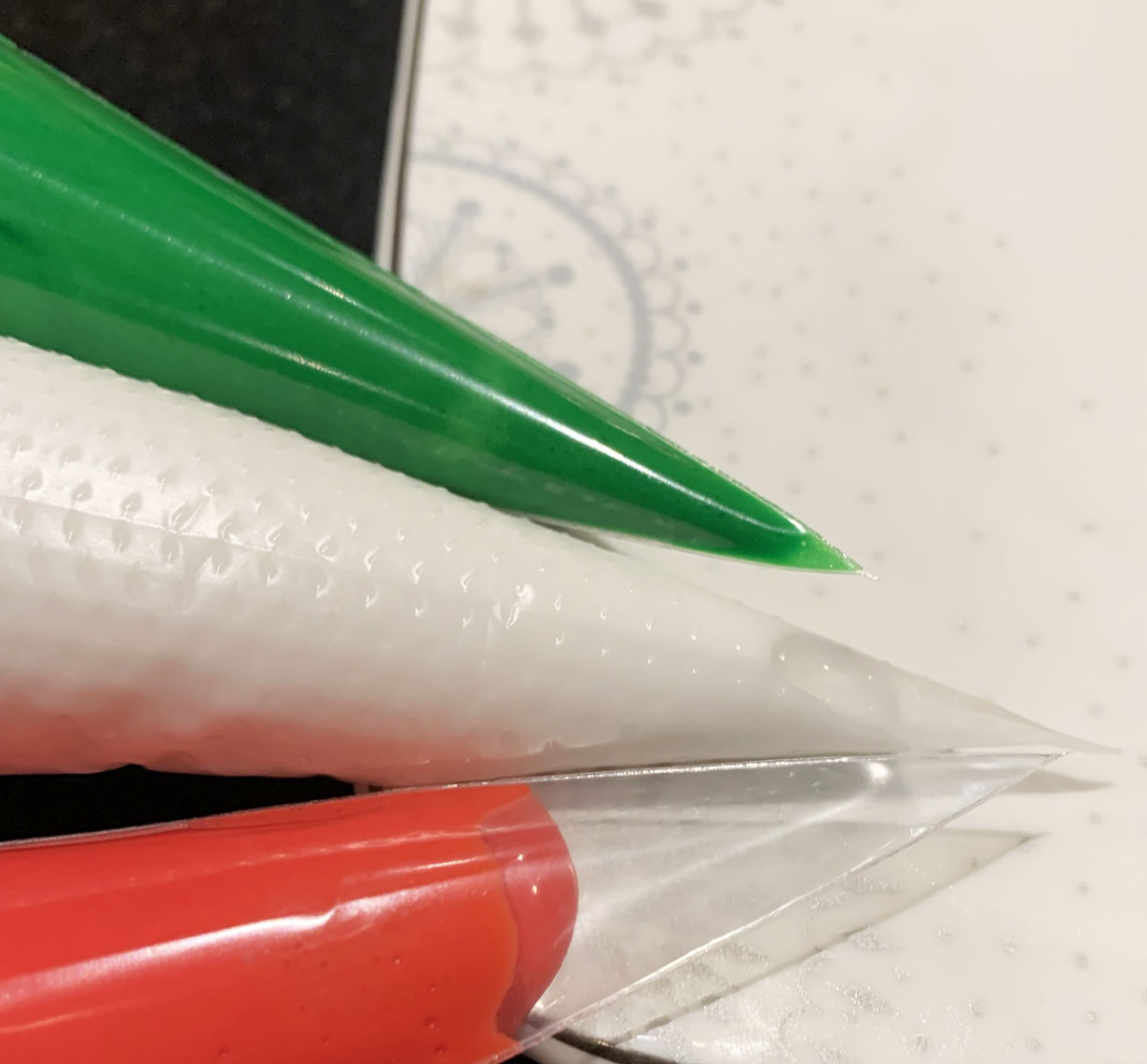 Prepare the icing for decoration by mixing together the confectioner’s sugar, meringue powder, and 6 tablespoons of water. Add additional water to achieve the consistency desired (for this cake, extra water was added to create a drip effect on the side of the cake). To 1/4 of the icing and add red food coloring and to another 1/4 add green. These colors will be used to make the Christmas ivy. Transfer all colors to piping bags and set aside.
