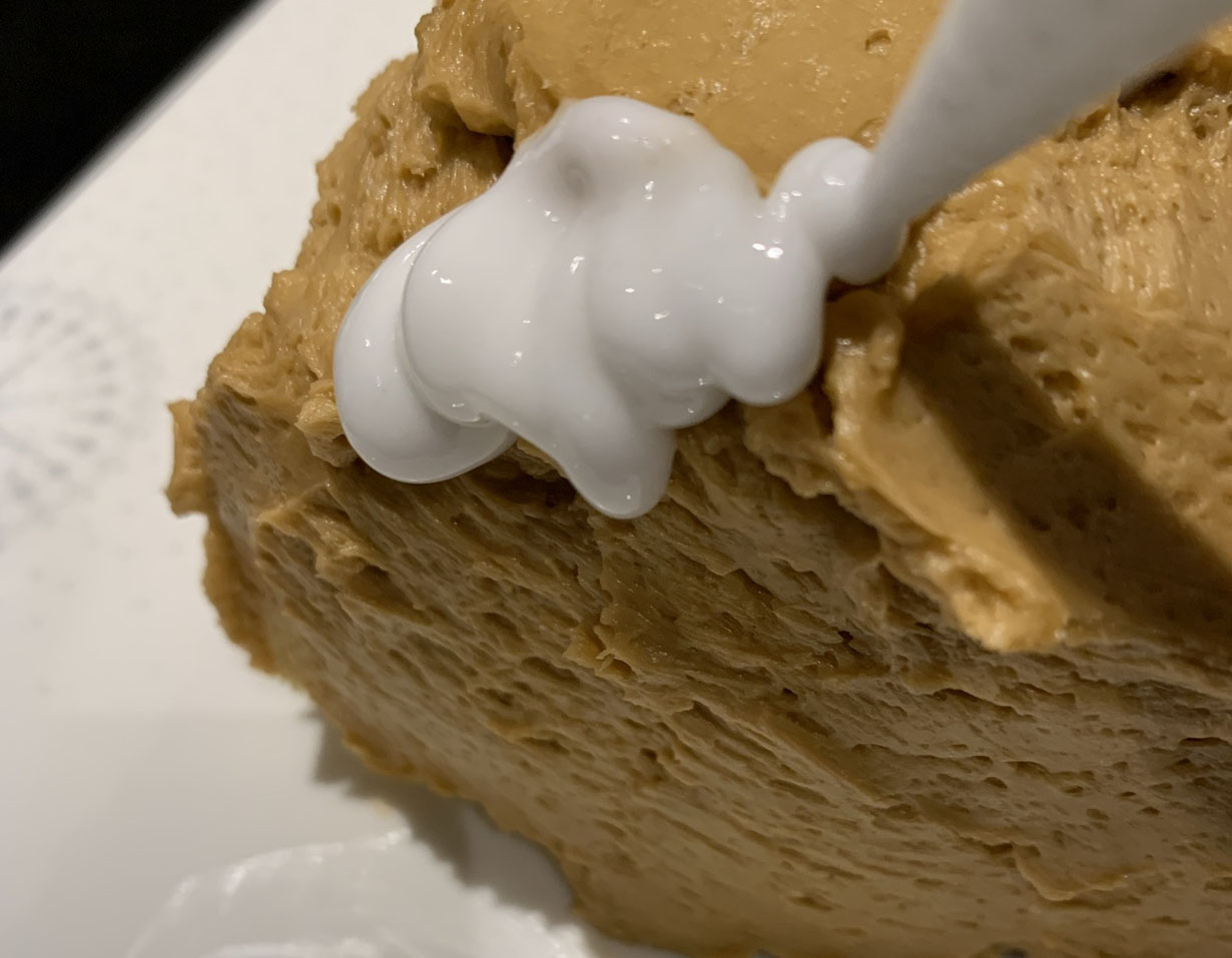 With the remaining buttercream, frost the outside using straight strokes across the length. Frosting the entire outside length in this manner mimics wood. Lightly frost the two end edges to create a crumb coat. Snip the edge of the piping bag with the white royal icing. Using the white royal icing, drip the icing over the edges. Repeat along the bottom edge of the cake that is resting on the platter. Once the entire cake is frosted, sprinkle with confectioner’s sugar through a small sieve.