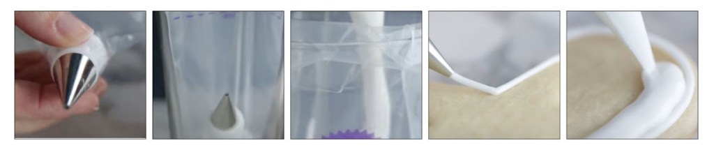 When you have prepared your icing, insert it into a plastic decorating bag. For the piping, insert a coupler along with your tip on the bag before filling it (for the flooding consistency, no tip is required). Insert your bag into a glass to make it easier to fill. Tie the end with an elastic or a knot.