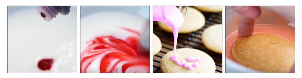 Mix together the sugar, milk, and lemon juice until smooth. The icing should drip consistently from a spoon. Add the desired food coloring. Dip the top of the cookie into the glaze or pour on top. Top with sprinkles or allow to harden and paint with food-safe markers. Note: you can also put the glaze in a piping bag for drizzling on the top of the cookie.