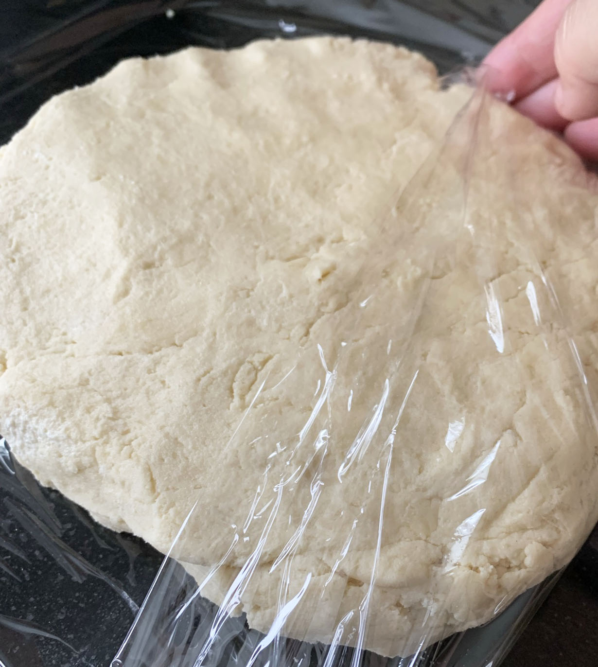 Add the flour in three batches and do not allow the dough to overmix (you should still see some flour). For the last batch, mix it in by hand 3 to 4 times and then let the mixer bring together the dough for 2 to 3 rotations. Divide the dough into 2 discs and wrap in plastic wrap. Refrigerate for at least 1 hour.