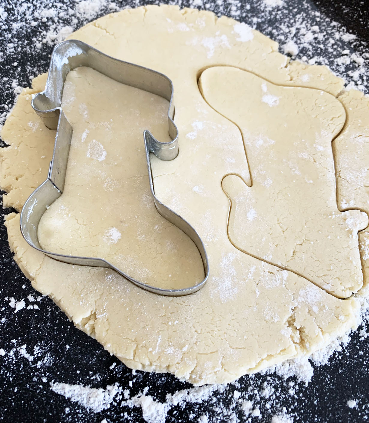 When you are ready to start rolling out your cookies, preheat your oven to 350°F. Prepare your cookie sheet by lining it with parchment paper or a silicone mat. Lightly flour a surface as well as the top of the disc of cooled dough. Using a rolling pin, roll out the dough into a 1/4” thickness. Use any cookie cutter to cut the shapes desired. Roll up and flatten into a disc any remaining dough and cut it with the cookie cutters again.
