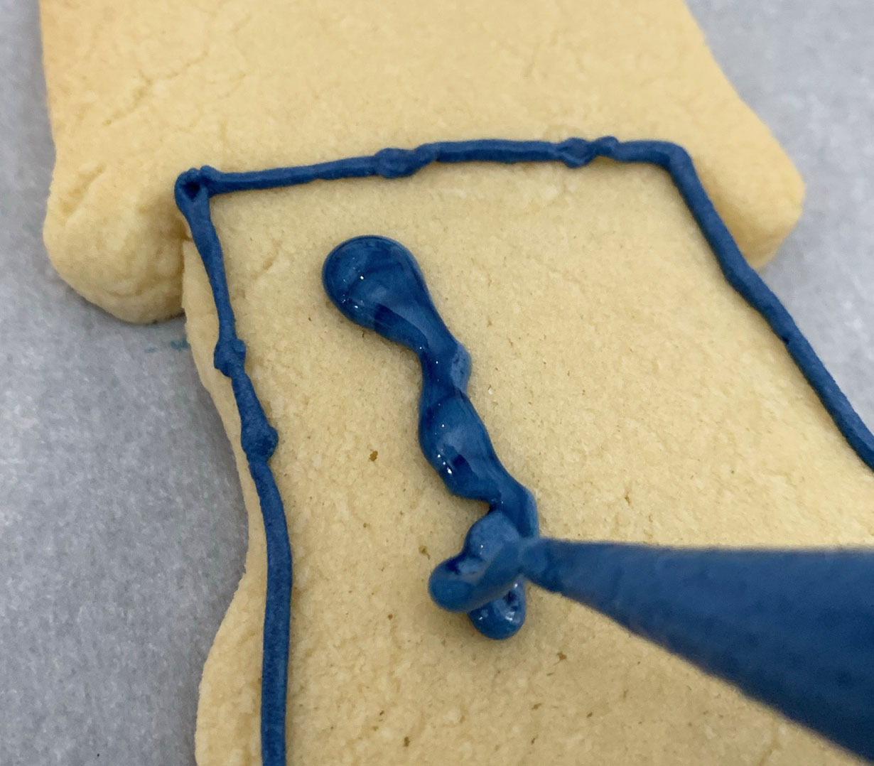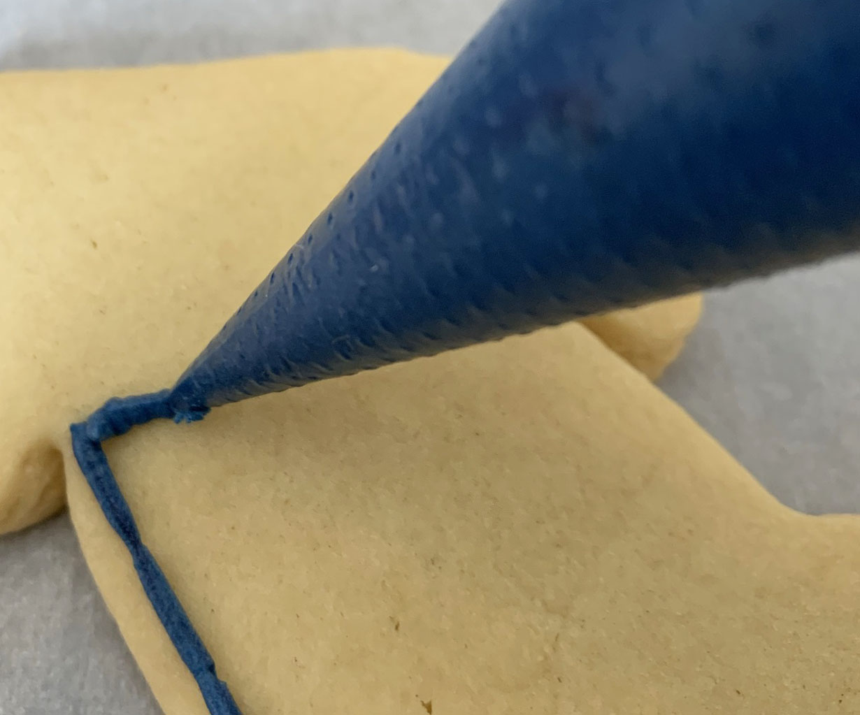 Separate the icing into bowls and add the desired color(s). You will need a medium consistency for piping. To achieve the desired consistency, add a few drops of water at a time. For a filling consistency, add a few more drops of water until the icing is much thinner. If your icing has become too thin, you can add confectioner’s sugar. For a medium consistency, you should be able to squeeze the bag and create a line or shape that holds its shape. For a filling (or flooding) consistency, it will drip like a glaze.